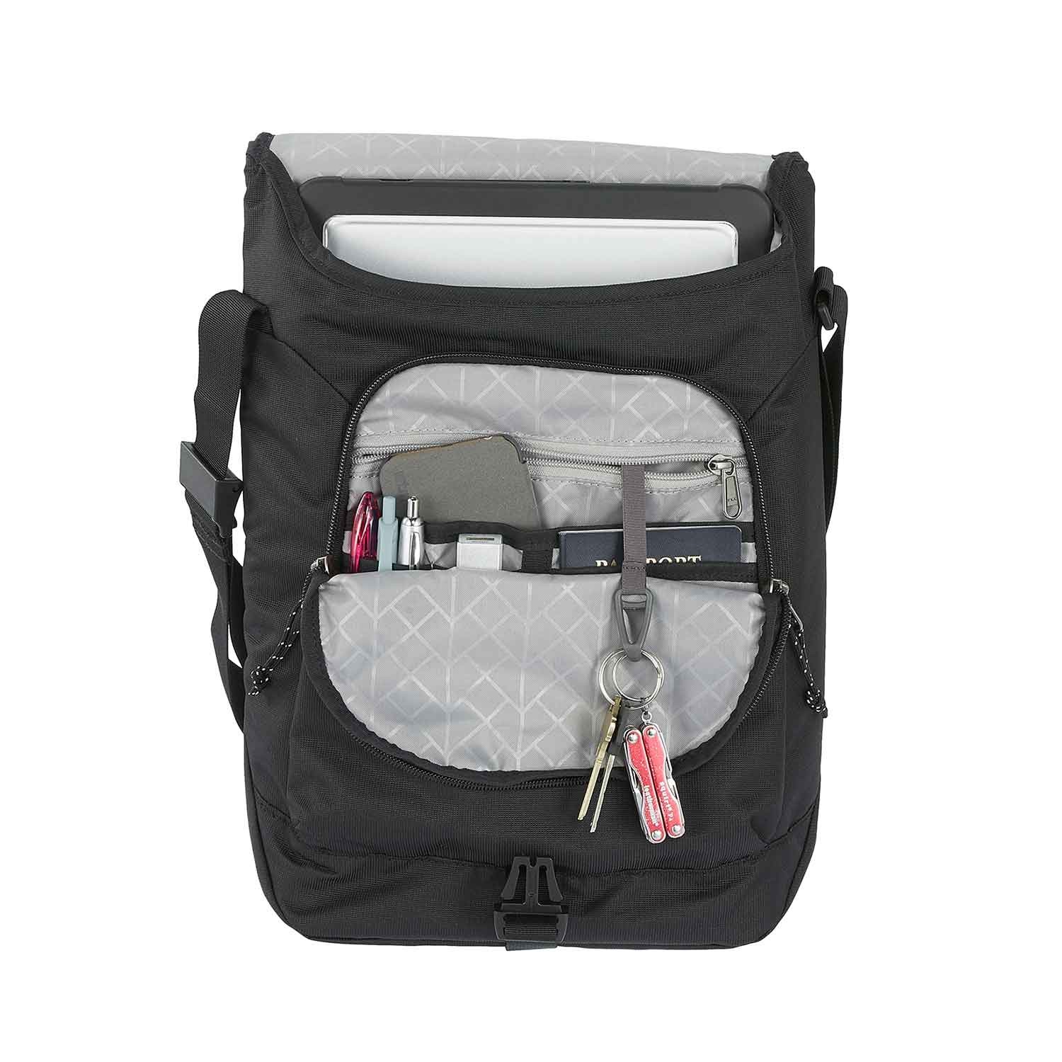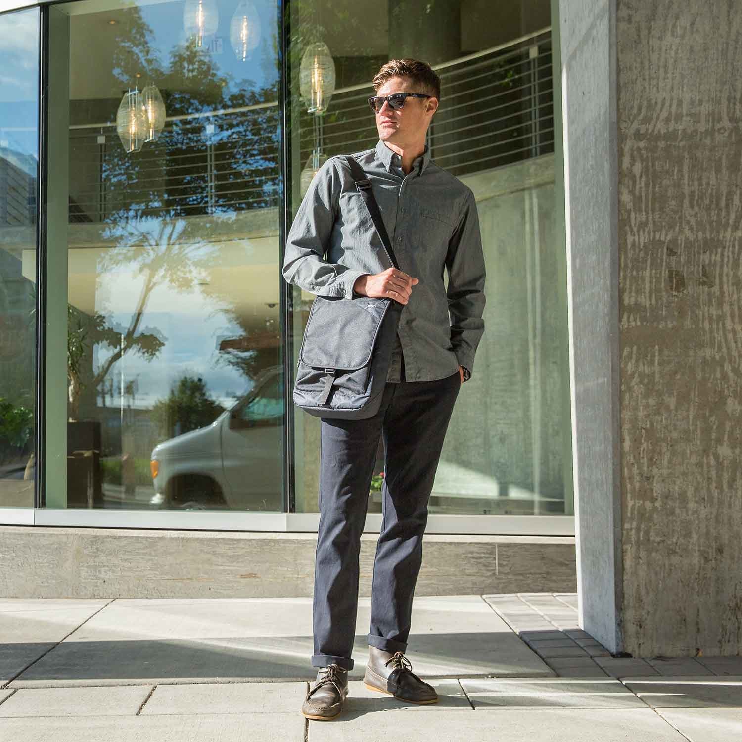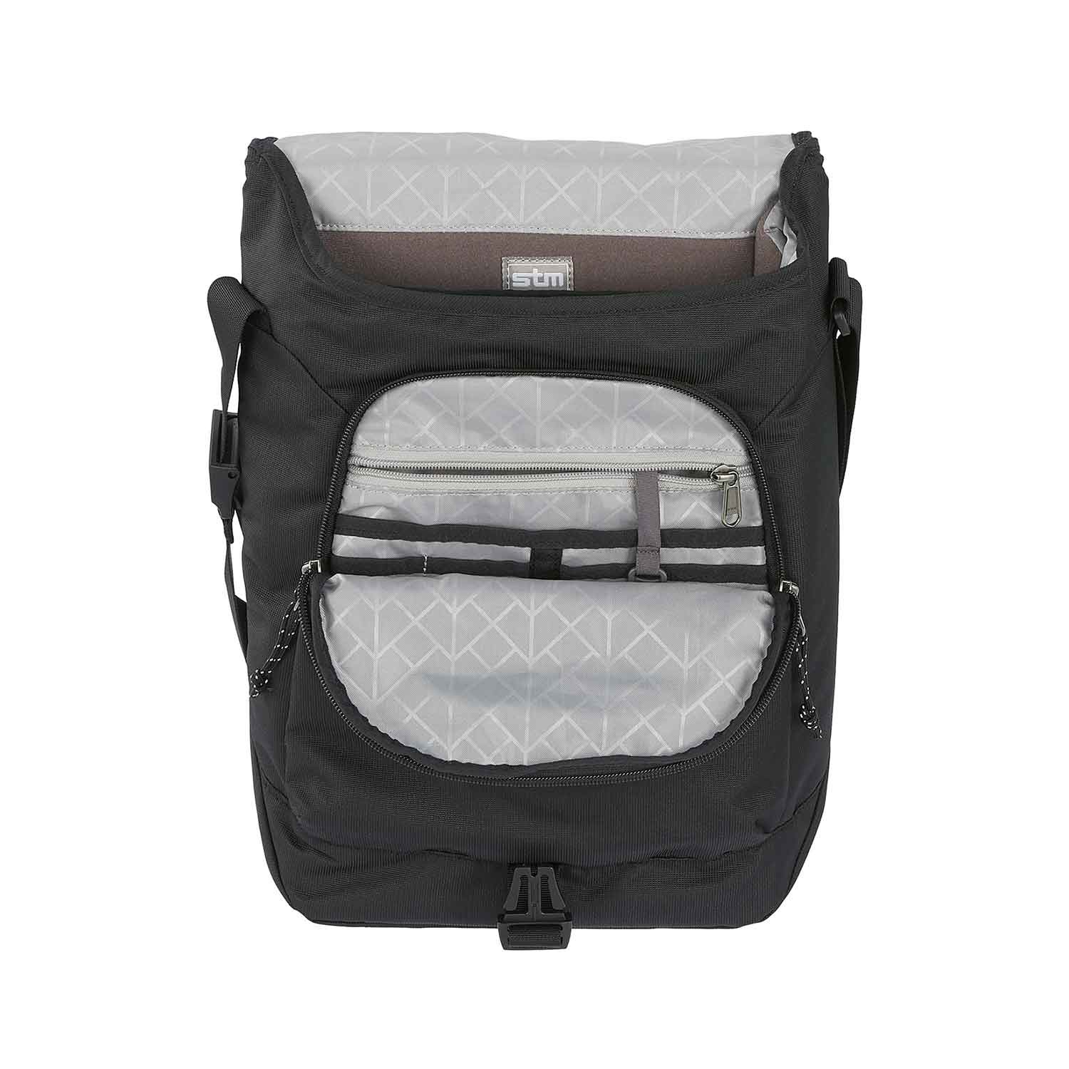 The messenger style flap is secured with a sleek clip, while the main compartment sports STM's SlingTech System - a padded sling suspends your devices from the bag's floor, and the bottom corners are wrapped in additional padding for the ultimate in digital gear protection. A comfortable and adjustable shoulder strap also allows for both cross body or one shoulder carry, and the ingenious luggage pass-through attaches the bag to the handle of your wheeled luggage.