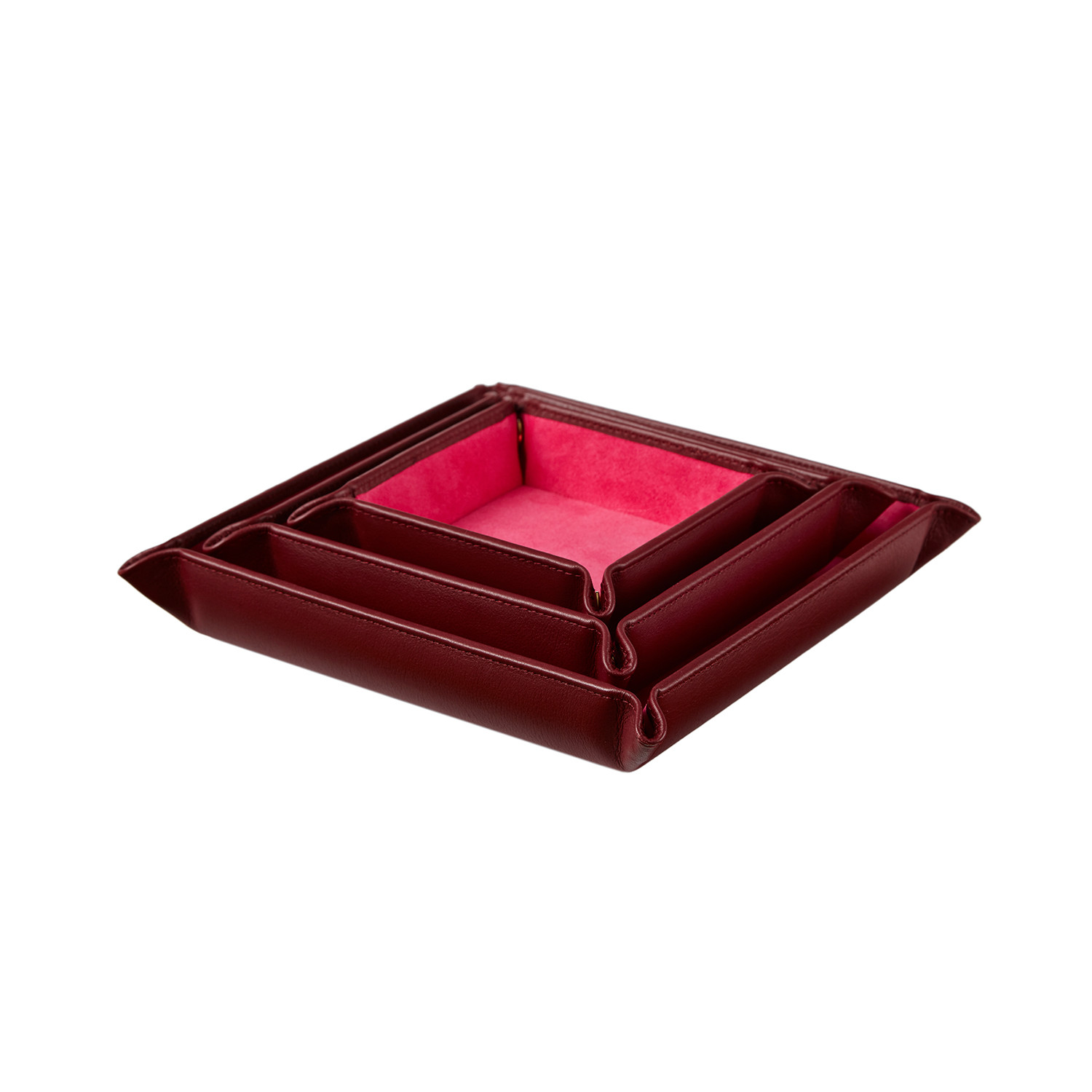 The smallest tray was consciously designed for a bedside table where space is limited— keeping your watch, cufflinks, or other accessories nearly organized and in one location. The medium tray makes an eye-catching addition to any desk, perfect for keys, phones, and other daily necessities that need a more visible storage place as they travel between the office and home. Finally, the large tray is a practical and handsome piece for your console table or dresser for all those “empty the pockets” moments when arriving home.