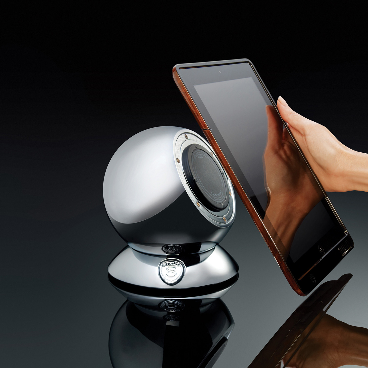 Powerful neodymium magnets secure the case to the pedestal. The spherical base can rotate, tilt, and pivot the tablet to any desired angle; at the same time, it employs an audio waveguide system to route sound from the rear-facing speaker forward, producing greater volume and increasing clarity over a stand-alone iPad.