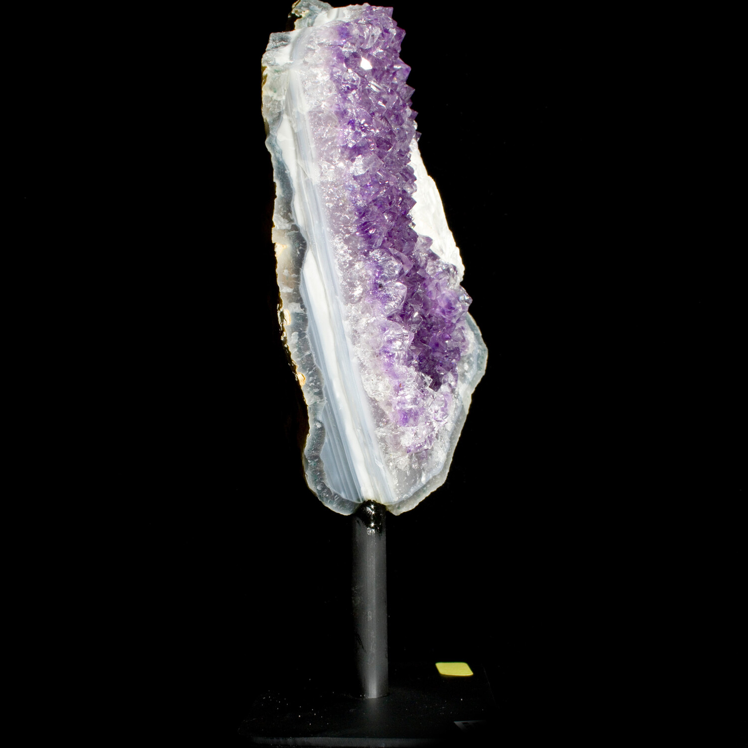 Amethyst crystals on Agate accompanied by Calcite, mounted on a sturdy iron stand presenting the optimal display angle.
