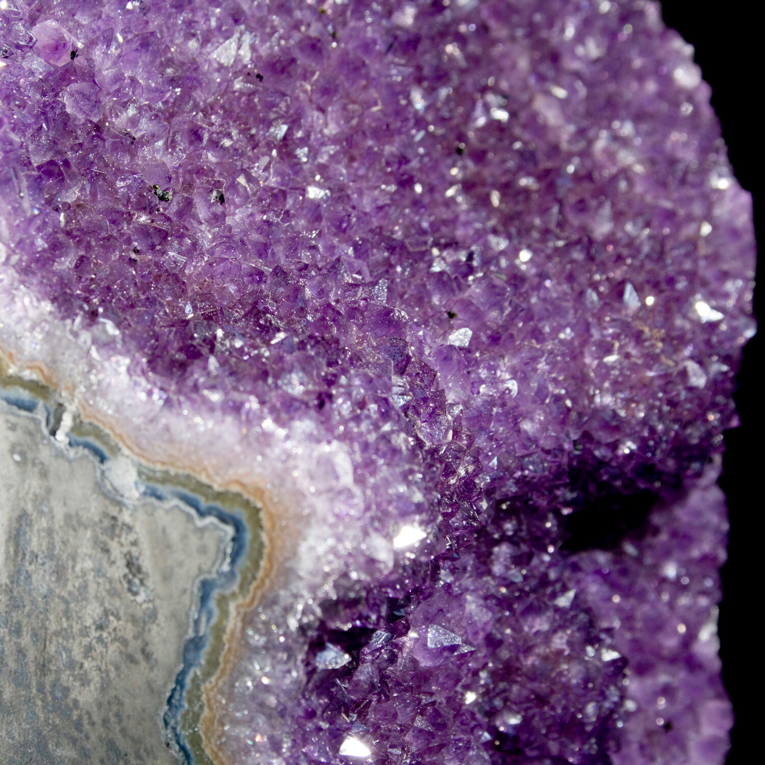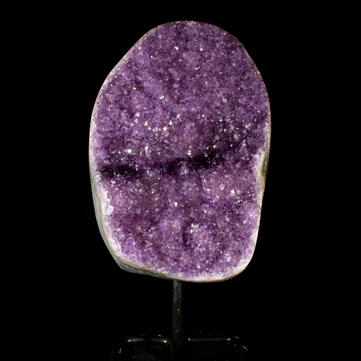 Natural druzy crystals cover wide and dynamic surface of this rich purple Amethyst geode from Brazil. Mounted on an iron display stand at the optimal display angle.