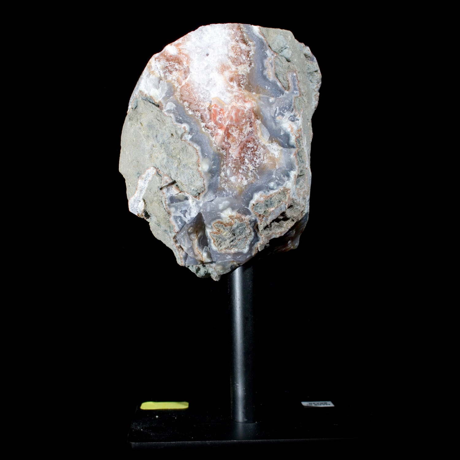 Small Amethyst Agate crystal specimen mounted on a sturdy iron stand presenting the optimal display angle.