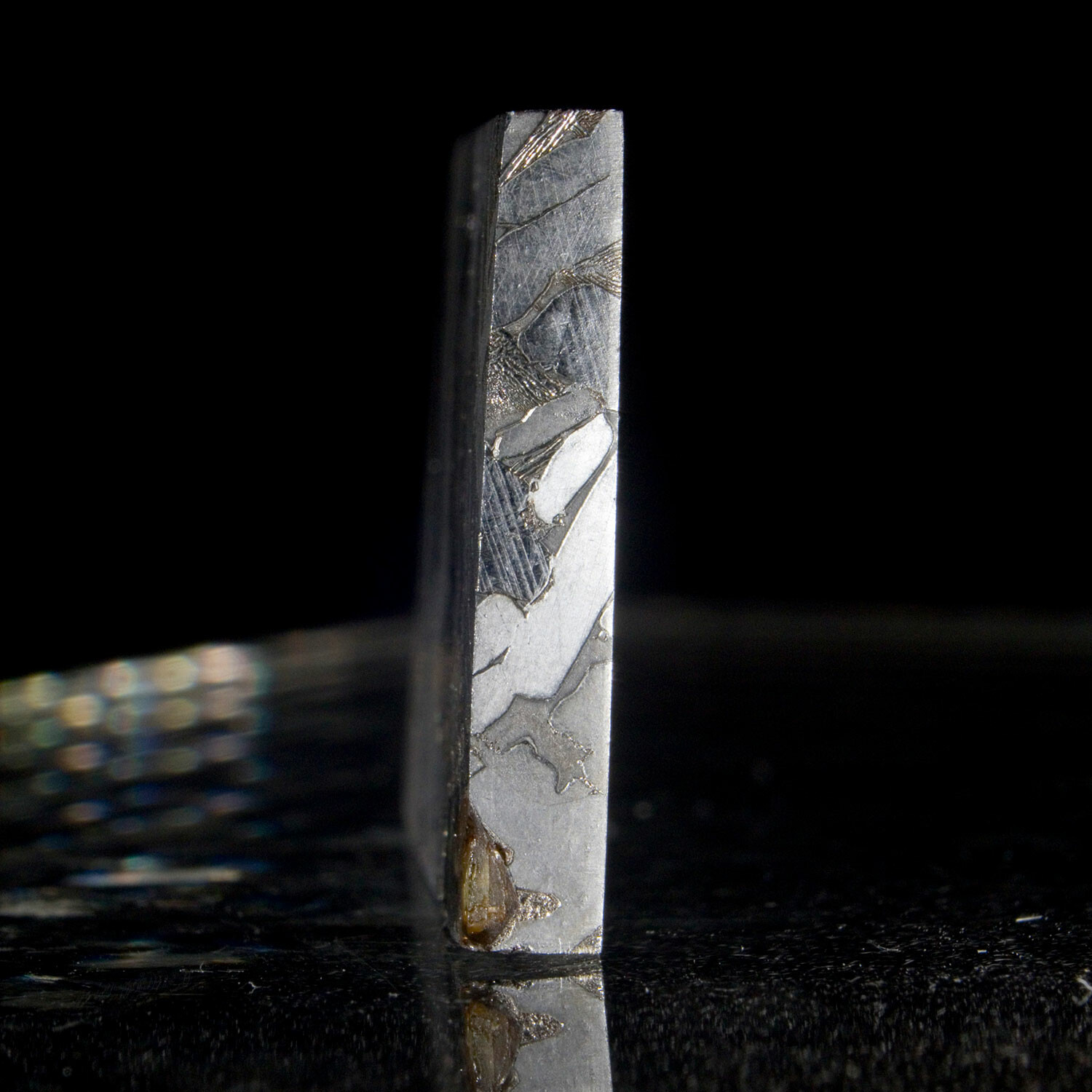 The Seymchan meteorite is a spectacular remnant of an early proto-planet in our Solar System. The complex crystalline Widmanstätten patterns in metal can only be created in the vacuum of space, where molten iron slowly cooled over billions of years. Aspects of Olivine are present in this Pallasite interior part slice. Standing on its own, this specimen is just over one inch wide and is an interior part slice of the Seymchan meteorite. It is certain to inspire wonder wherever it lands.