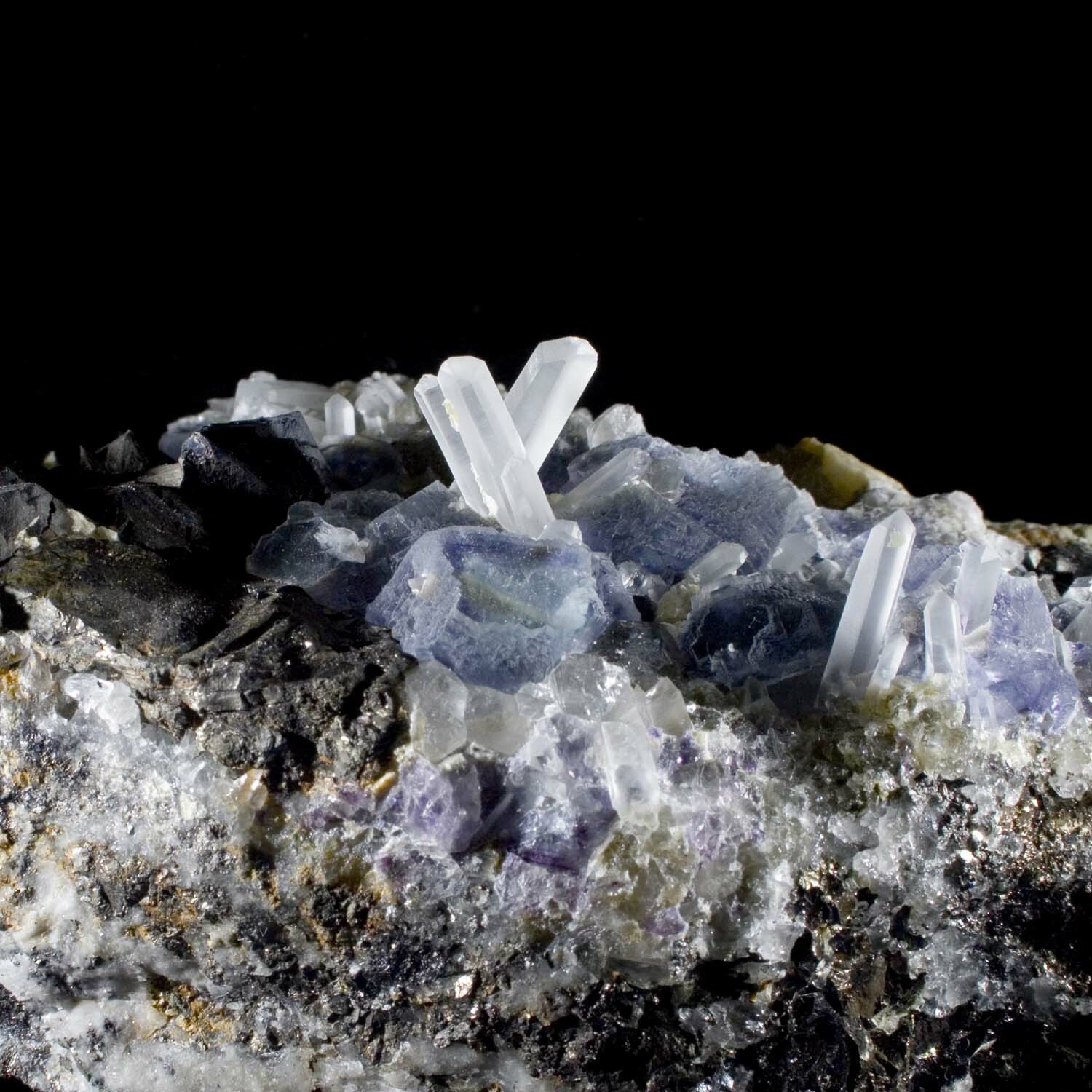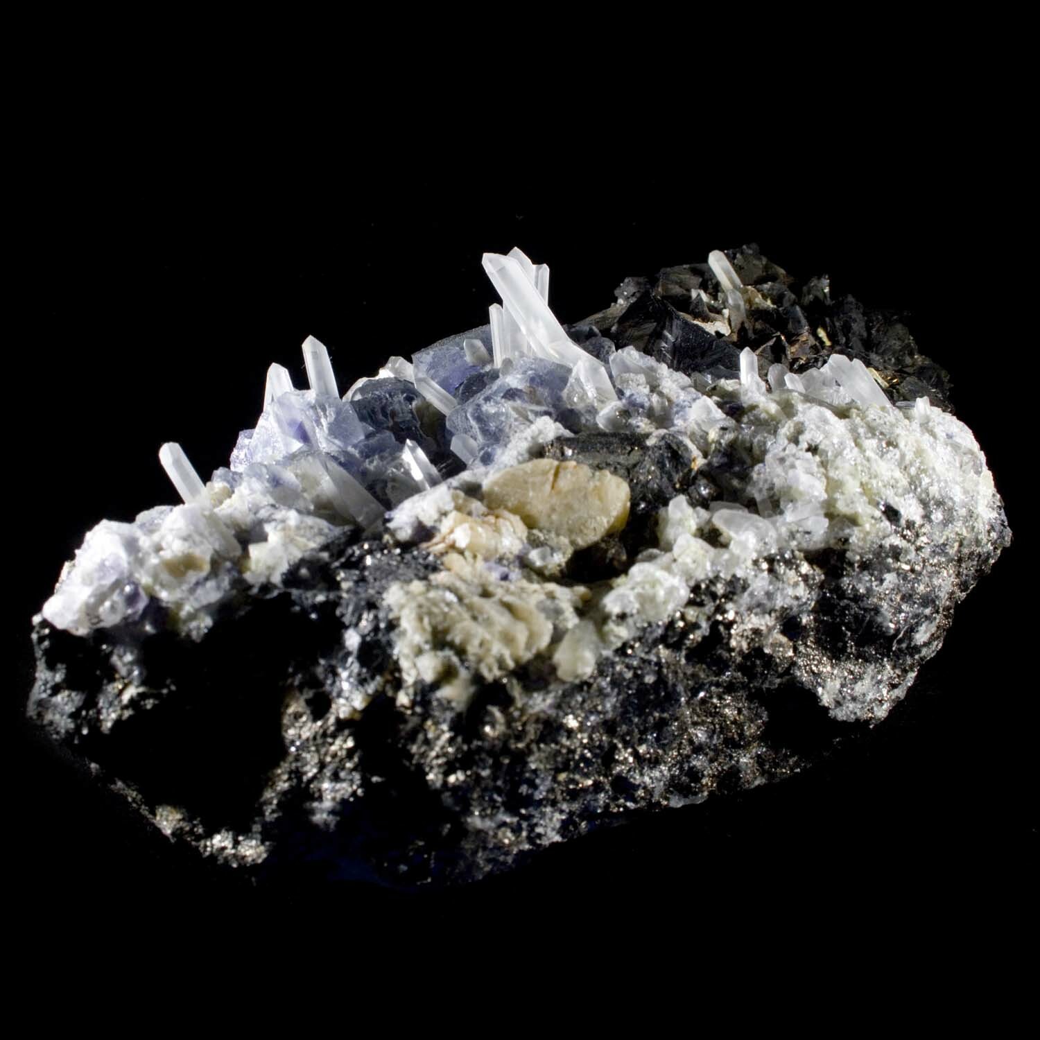A rare specimen from the Yindu Mine, Inner Mongolia, China. A multi-mineral specimen in its lightly-prepared natural state, scepters of Quartz rise off a matrix of many colors, surrounded by crystals of dynamic blue Fluorite with color zoning. Wolframite, Pyrite and Galena are visible on or within this amazingly complex, fascinating example of the Earth's art.