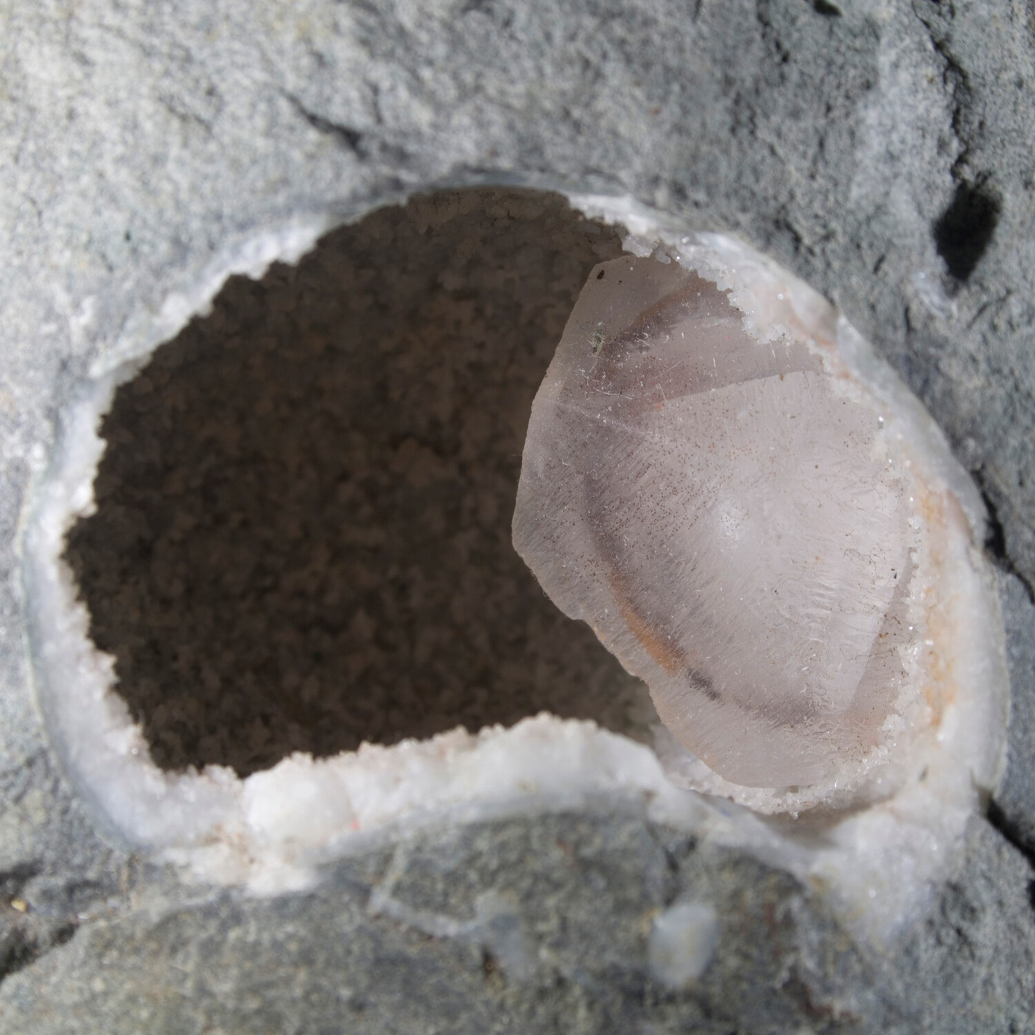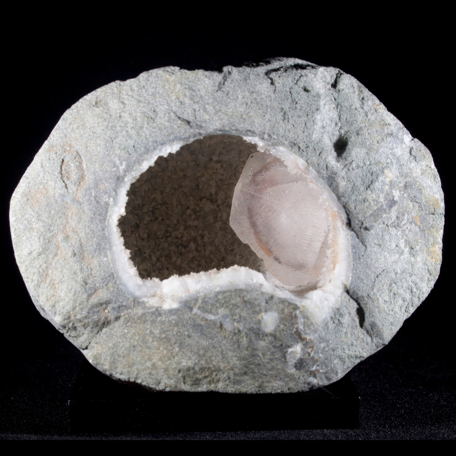 An amazing reminder of where the minerals and crystals that fascinate us come from. A crystal of Calcite formed in a naturally occurring internal space in basalt bedrock millions of years ago, where it remained, in the dark, awaiting discovery. A unique, freestanding piece of natural art from Nashik, Maharashtra, India.