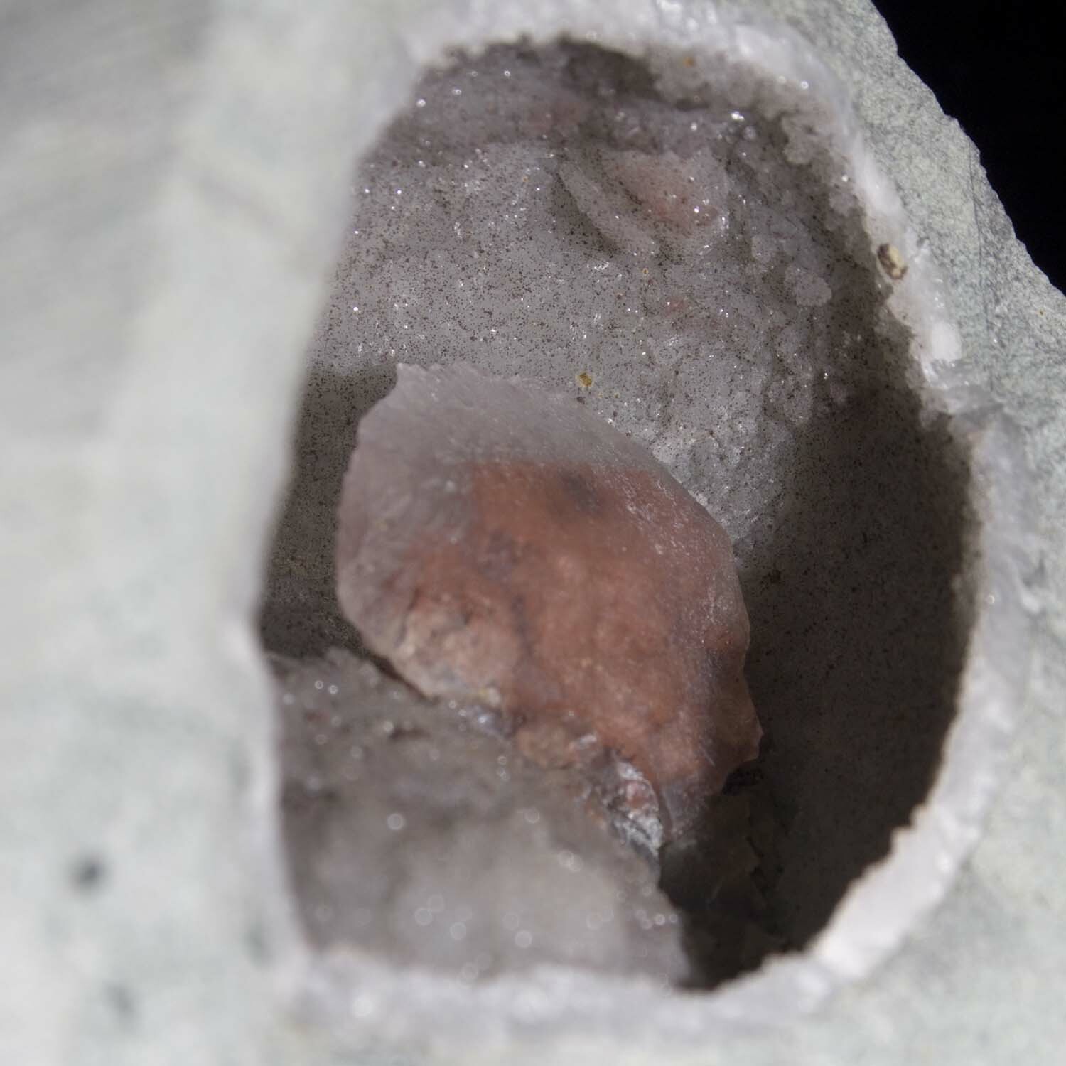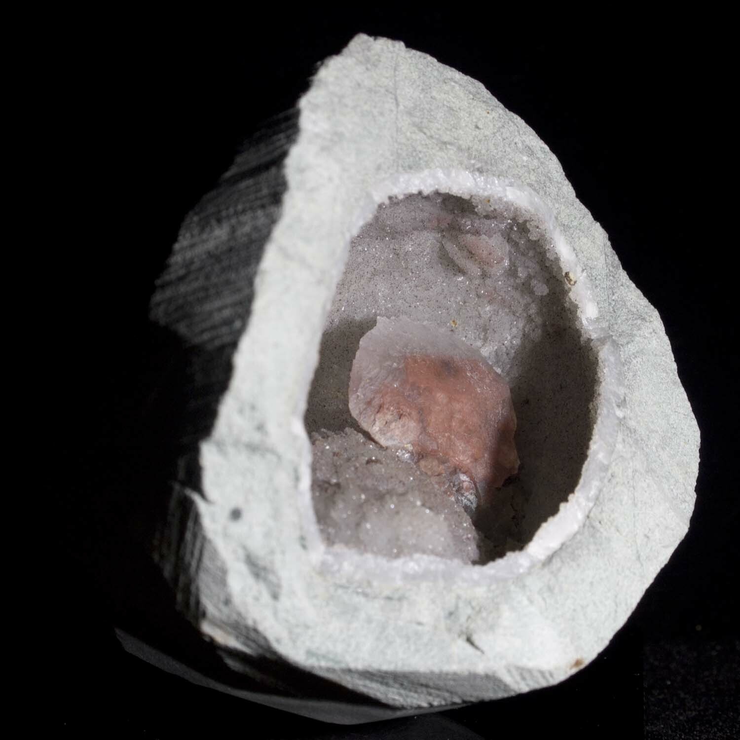 A natural Hematite Phantom Calcite crystal In Situ within a Basalt Geode. An amazing reminder of where the minerals and crystals that fascinate us come from. A crystal of Calcite formed in a naturally occurring internal space in bedrock millions of years ago, where it remained, in the dark, awaiting discovery. A unique, freestanding piece of art.