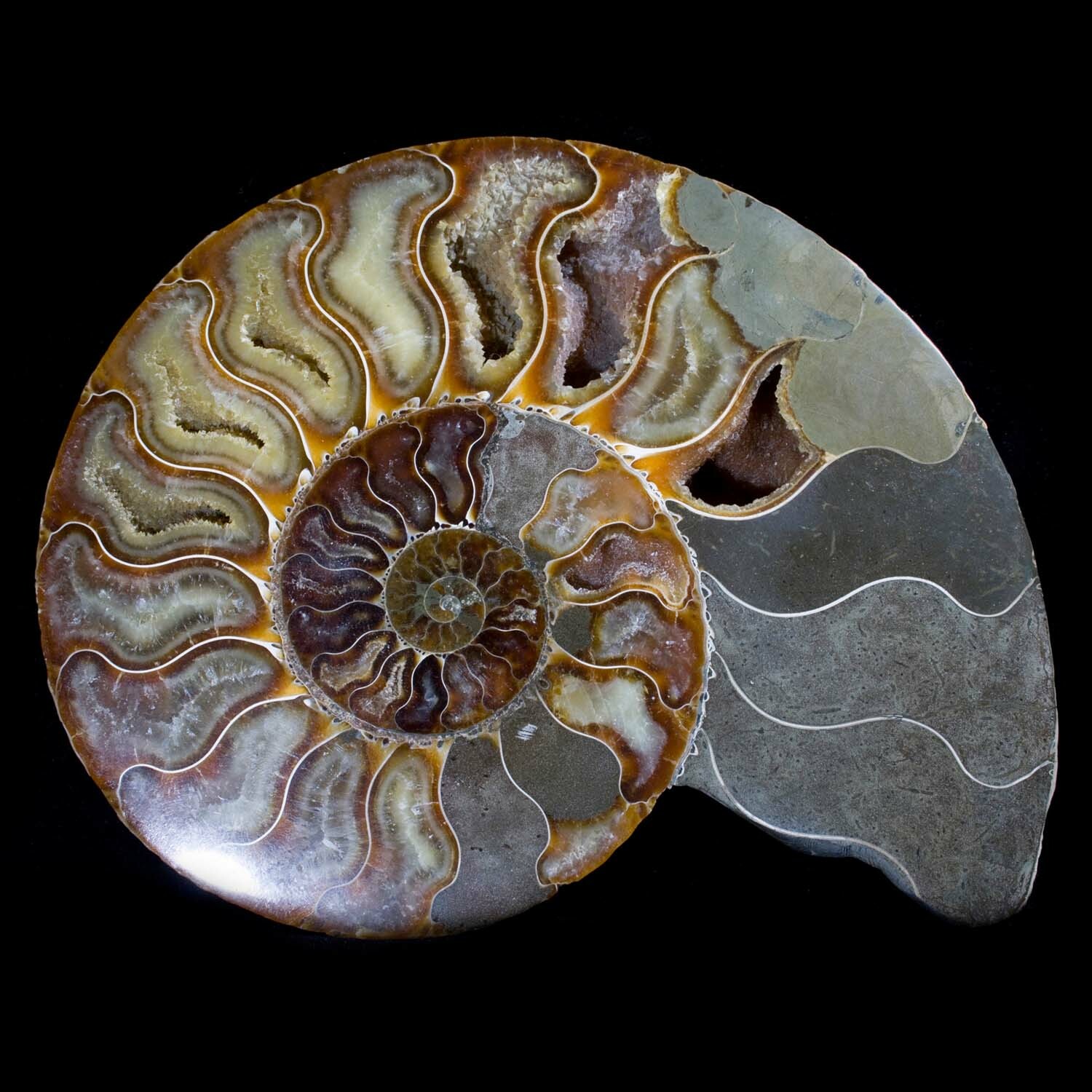 Two bookmatched halves of a complex fossil Ammonite featuring spectacularly mineralized internal chambers with a lightly iridescent exterior. The very definition of bilateral symmetry.
