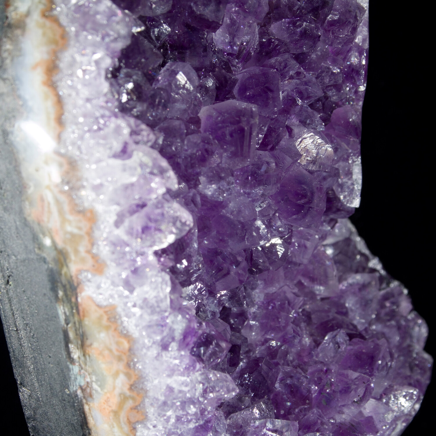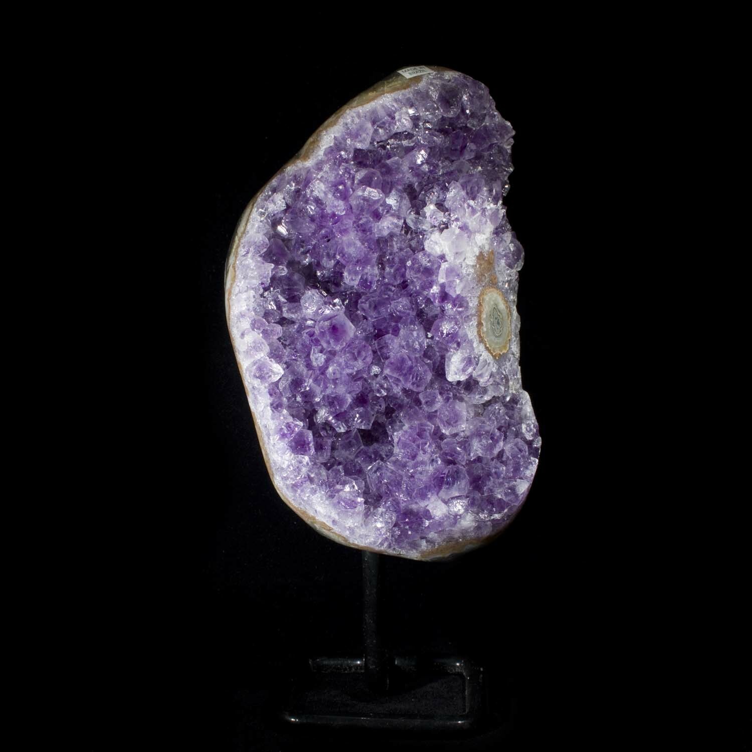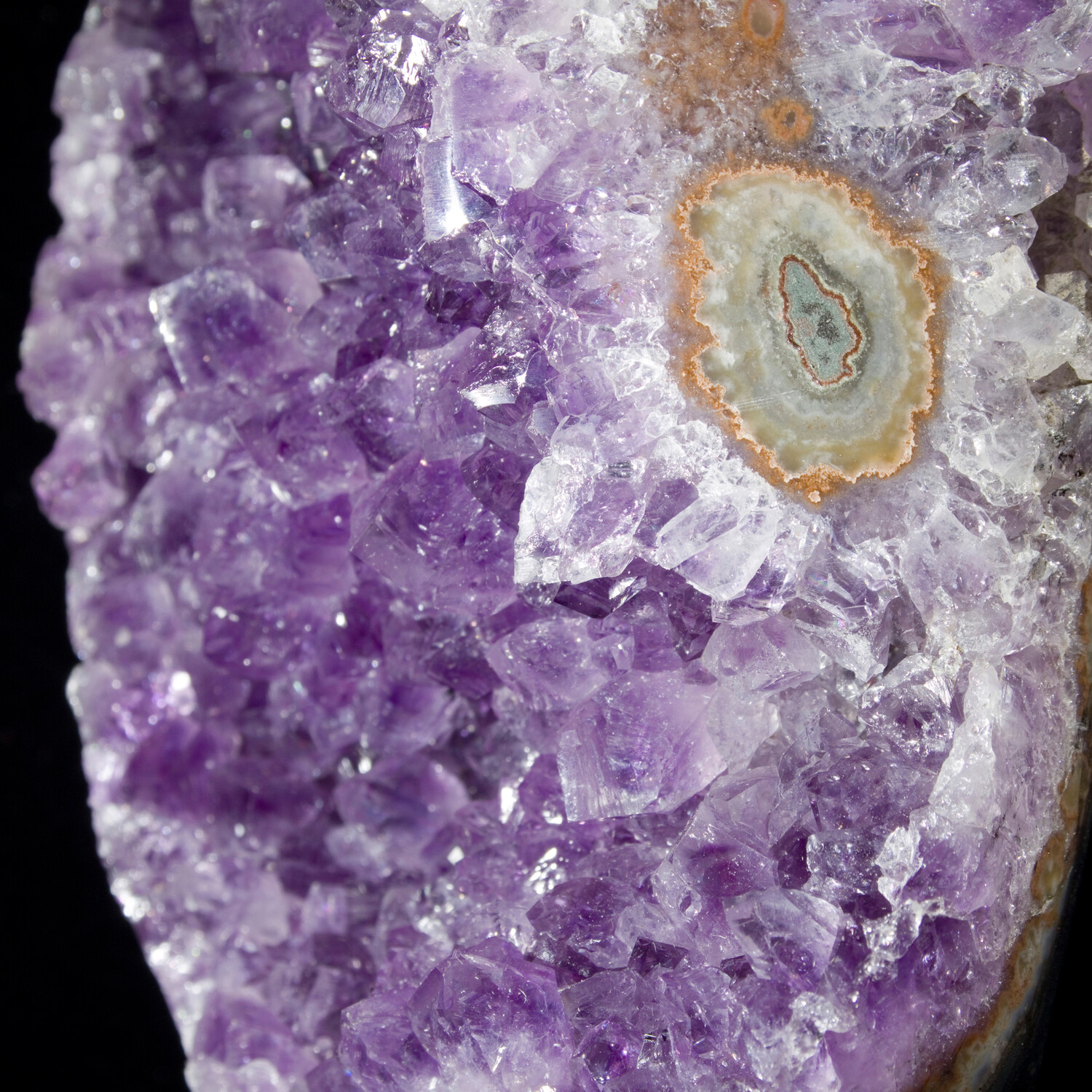 The concentric bulls-eye pattern on this geode represents the cross section of a Stalactite that grew within the space before the Amethyst formed. A compelling and colorful feature of this naturally beautiful piece of the planet.