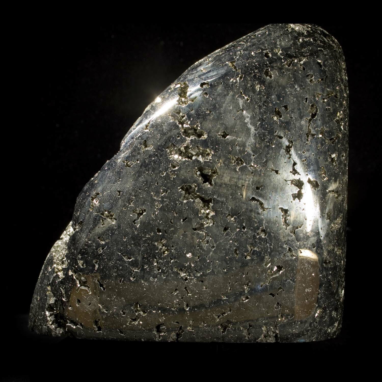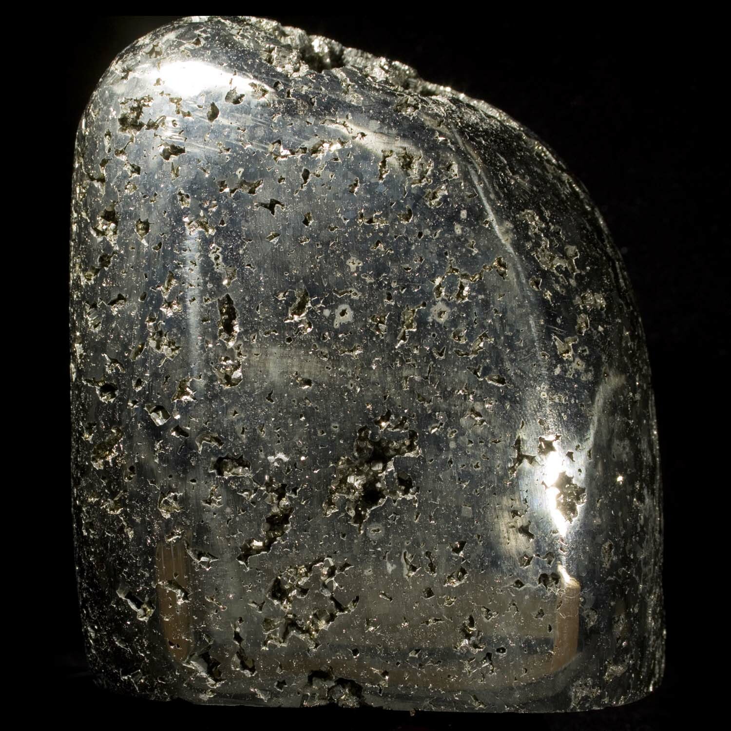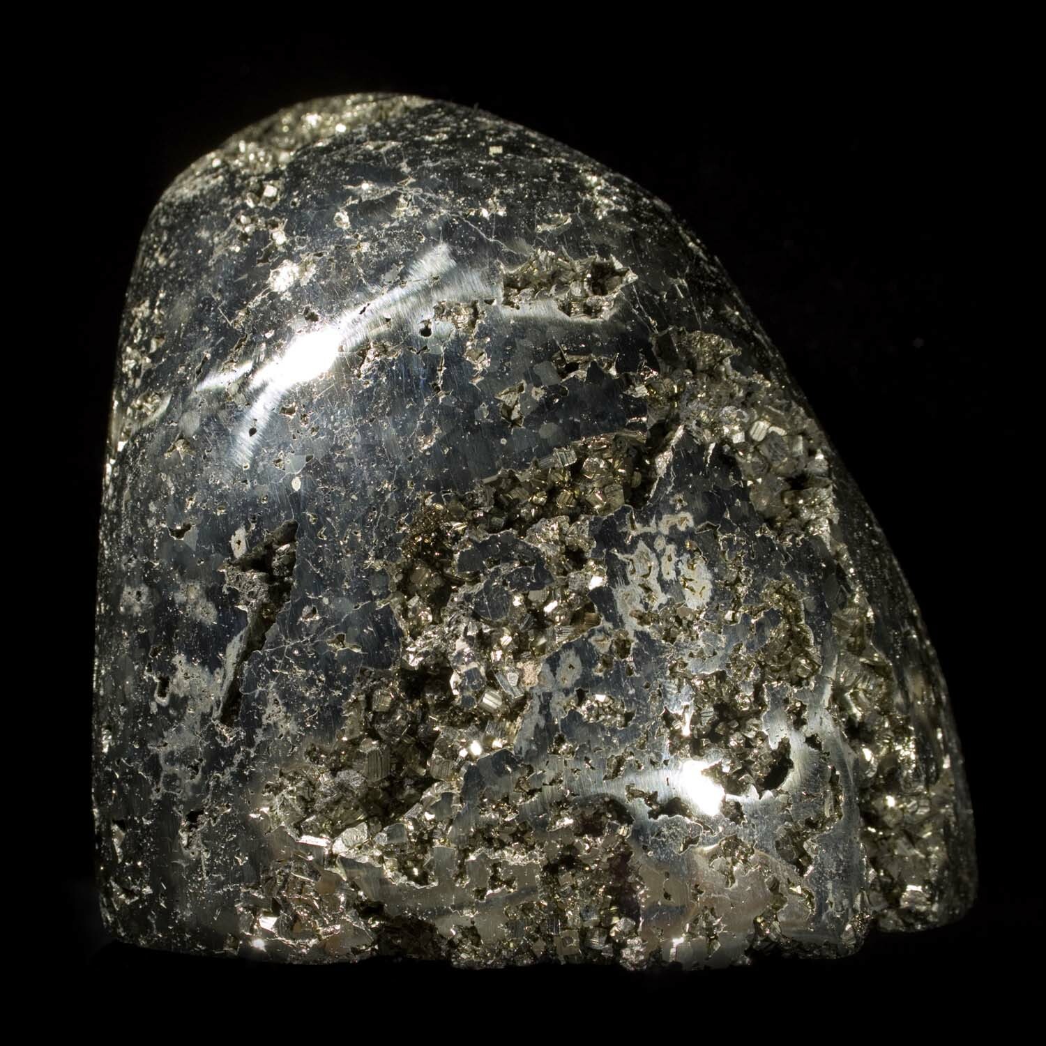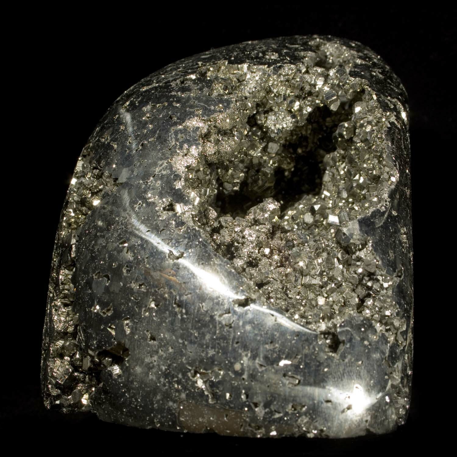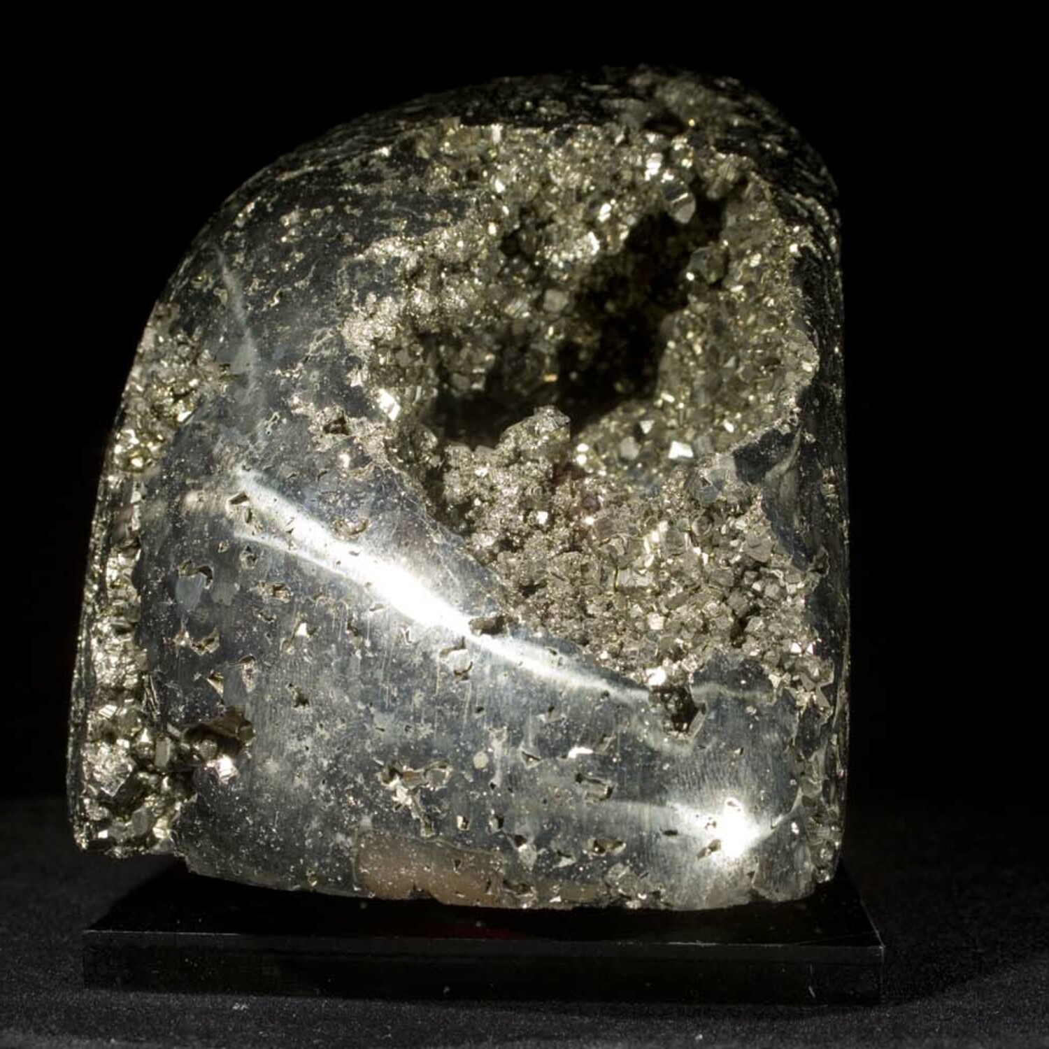 A large sculptural Peruvian Pyrite freeform shaped to highlight complex internal spaces lined with cubic crystals of Pyrite.
