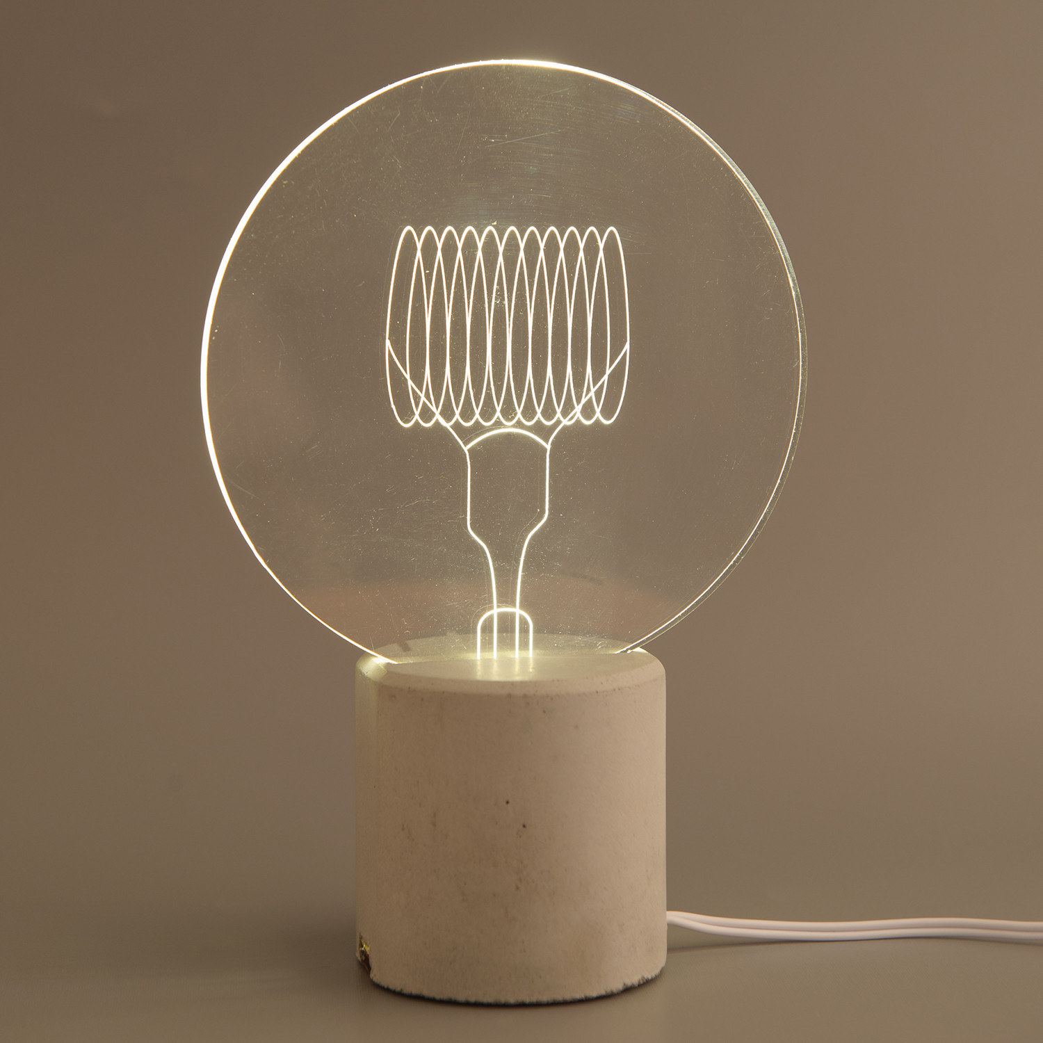 This concrete lamp is a decorative night light or ambient light, made with a concrete base, an acrylic glass shape, and is subtly lit by LEDs. Both industrial and whimsical, it's the perfect addition to your creative space.