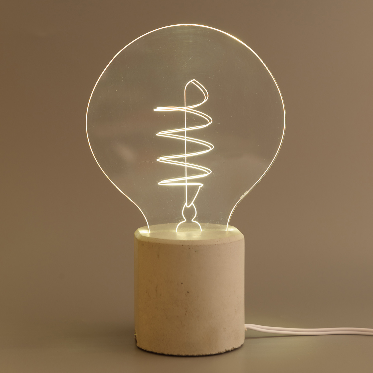 This concrete lamp is a decorative night light or ambient light, made with a concrete base, an acrylic glass shape, and is subtly lit by LEDs. Both industrial and whimsical, it's the perfect addition to your creative space.
