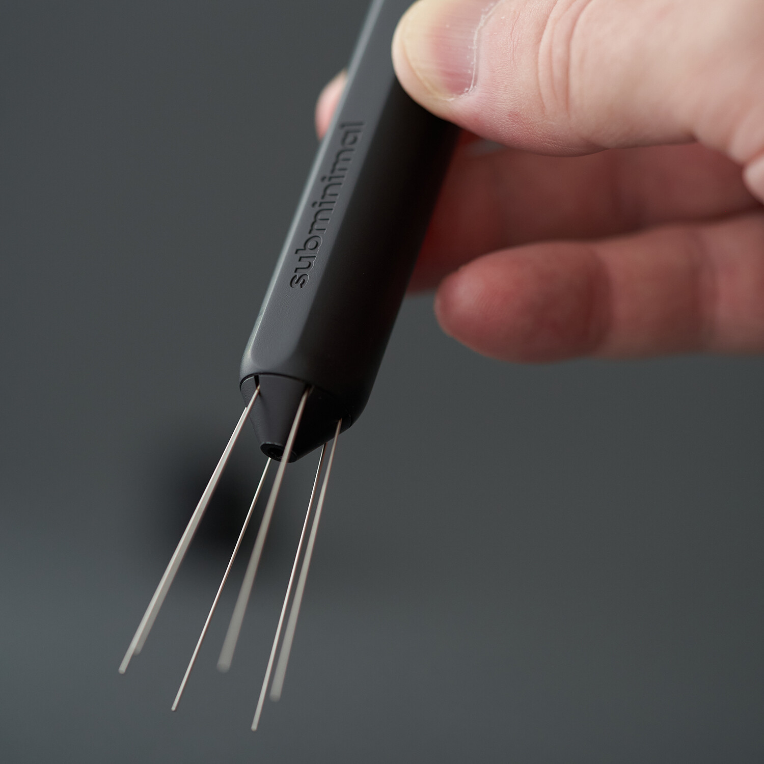 The Flick espresso distribution tool (WDT) is intuitive, fun to use, and safe, thanks to its retractable needles. One-click pops the needles out when you need them, and a flick of the wrist sends them right back in. Puck prep has never been so much fun.