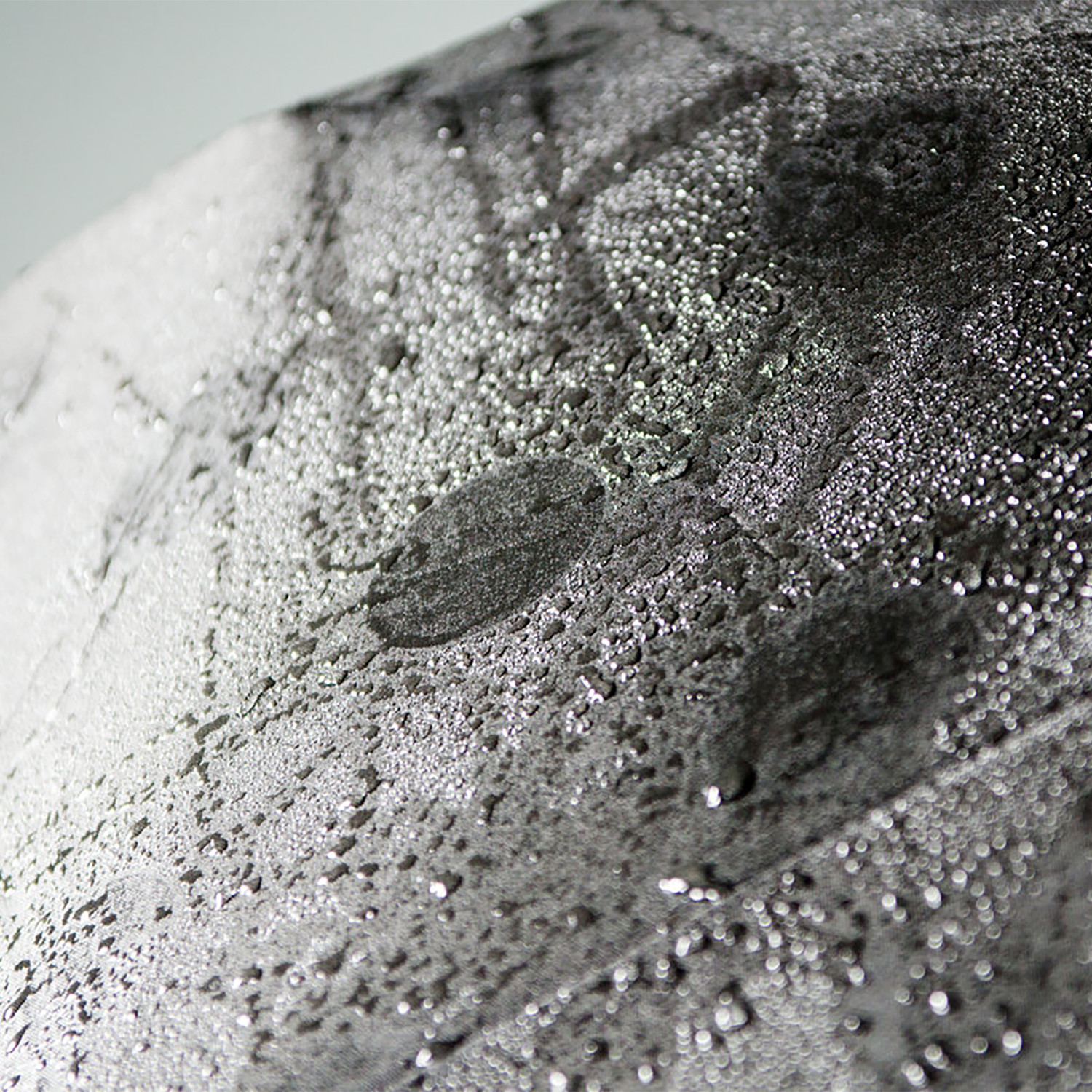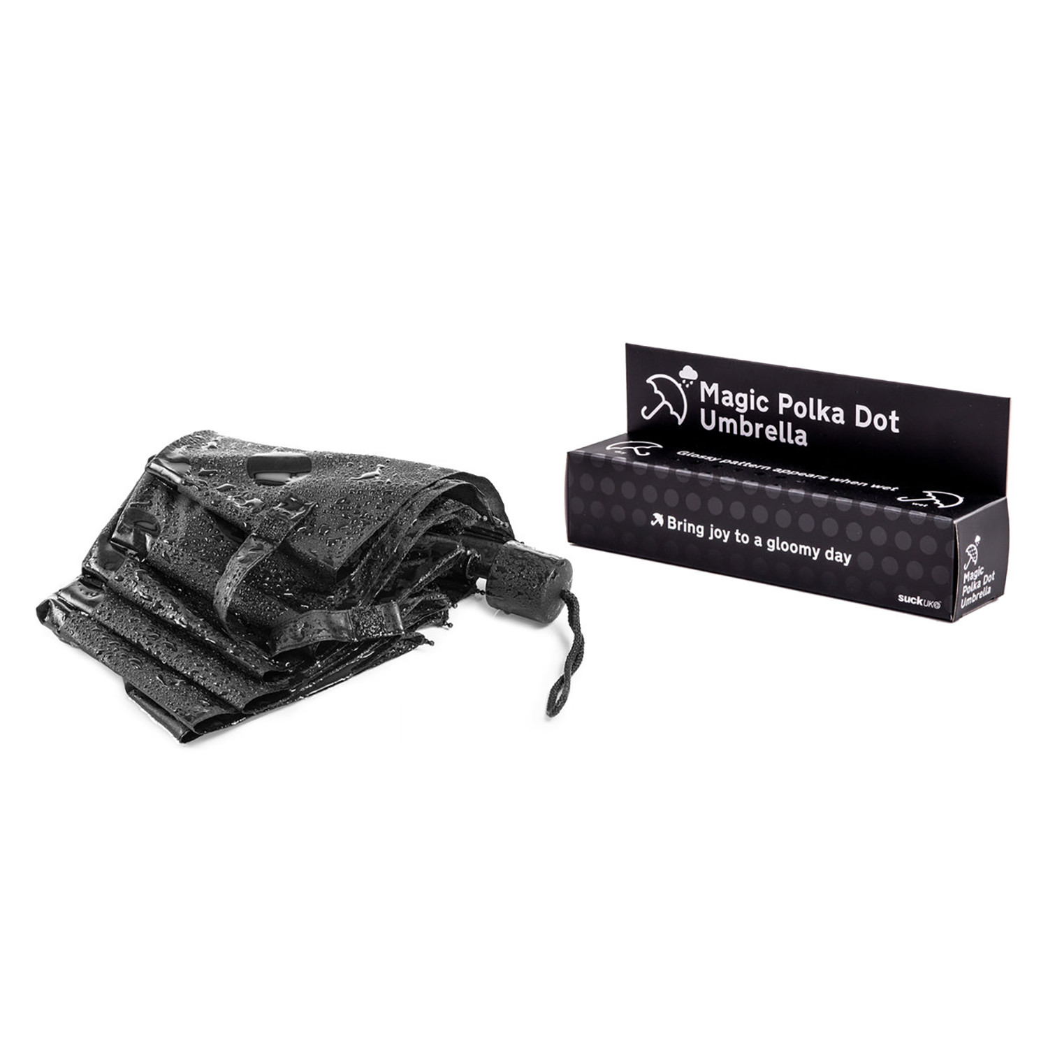 A classic plain-black umbrella, with a playful hidden secret. As it rains, this otherwise unremarkable black umbrella, is transformed into a festival of polka-dot fun... like magic. The polka dot print is created with a "secret" ink that is only revealed when wet. Glossy black polka dots on a matte black umbrella.