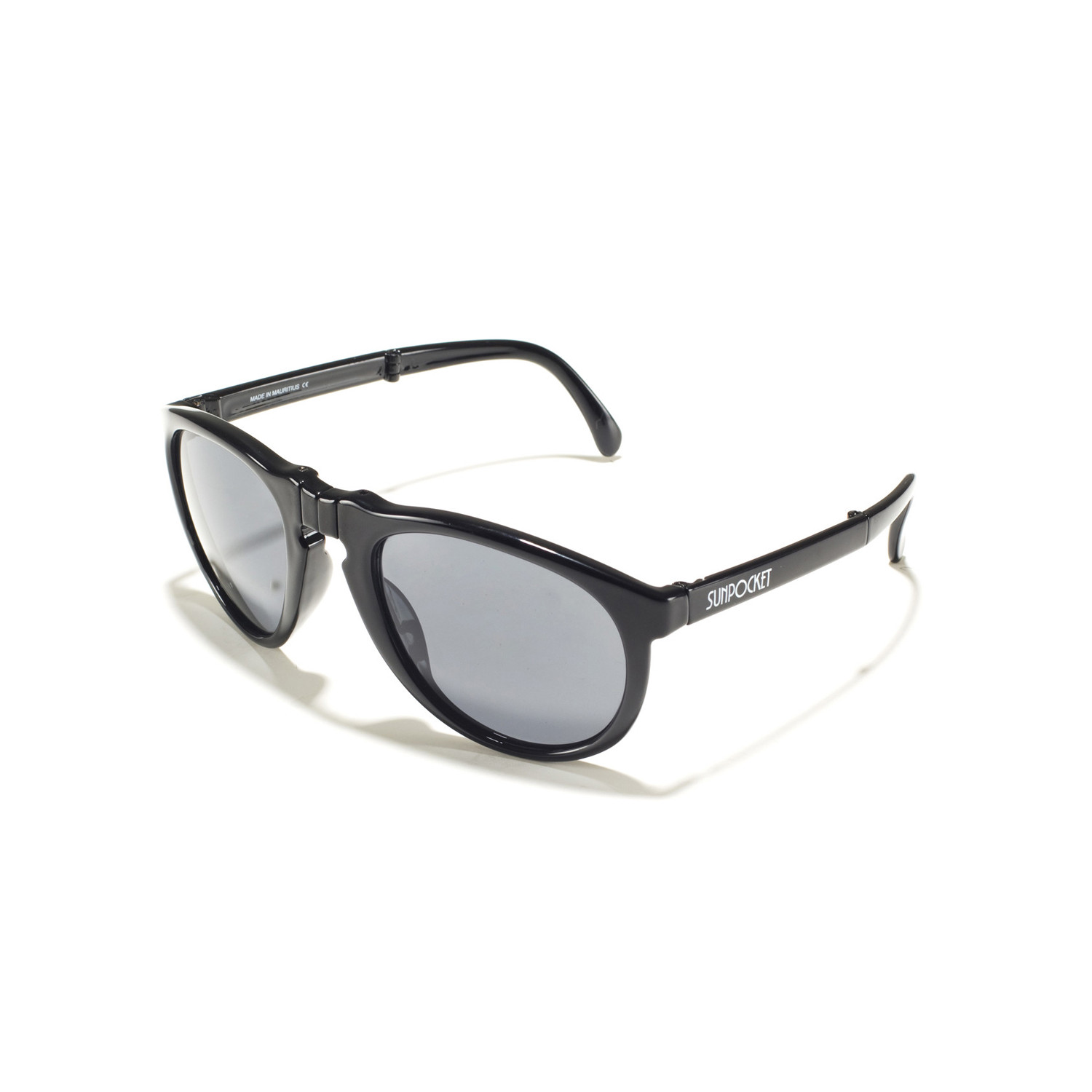 The Shiny Black SPII is Sunpocket's second original model as the name indicates. They were designed to be a classic aviator model with a slight sporty appearance. The temple arm tips bend gently behind the ear to help them stay in place when you are on the go. The frame is foldable, made of premium lightweight grilamid plastic, and comes with 100% UV-protective unbreakable polycarbonate lenses.