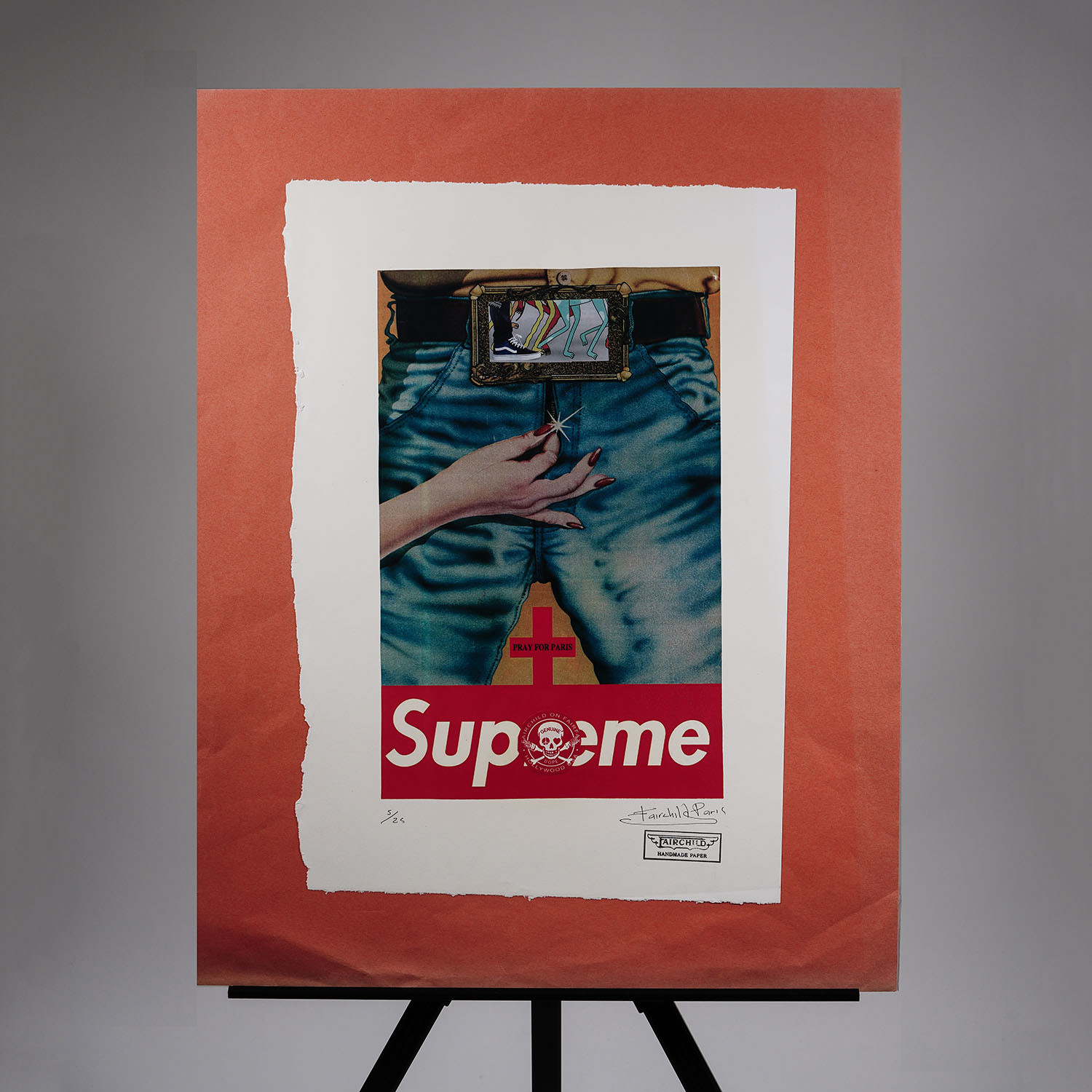 Iconic for their fusion of skateboard, hip hop, and street style culture, legendary British brand Supreme transformed itself from a humble skate shop to a billion dollar company, without sacrificing its edgy and often times provocative aesthetic. Pay homage to this legendary brand with this original, limited edition piece, and give your walls a bit of street cred.