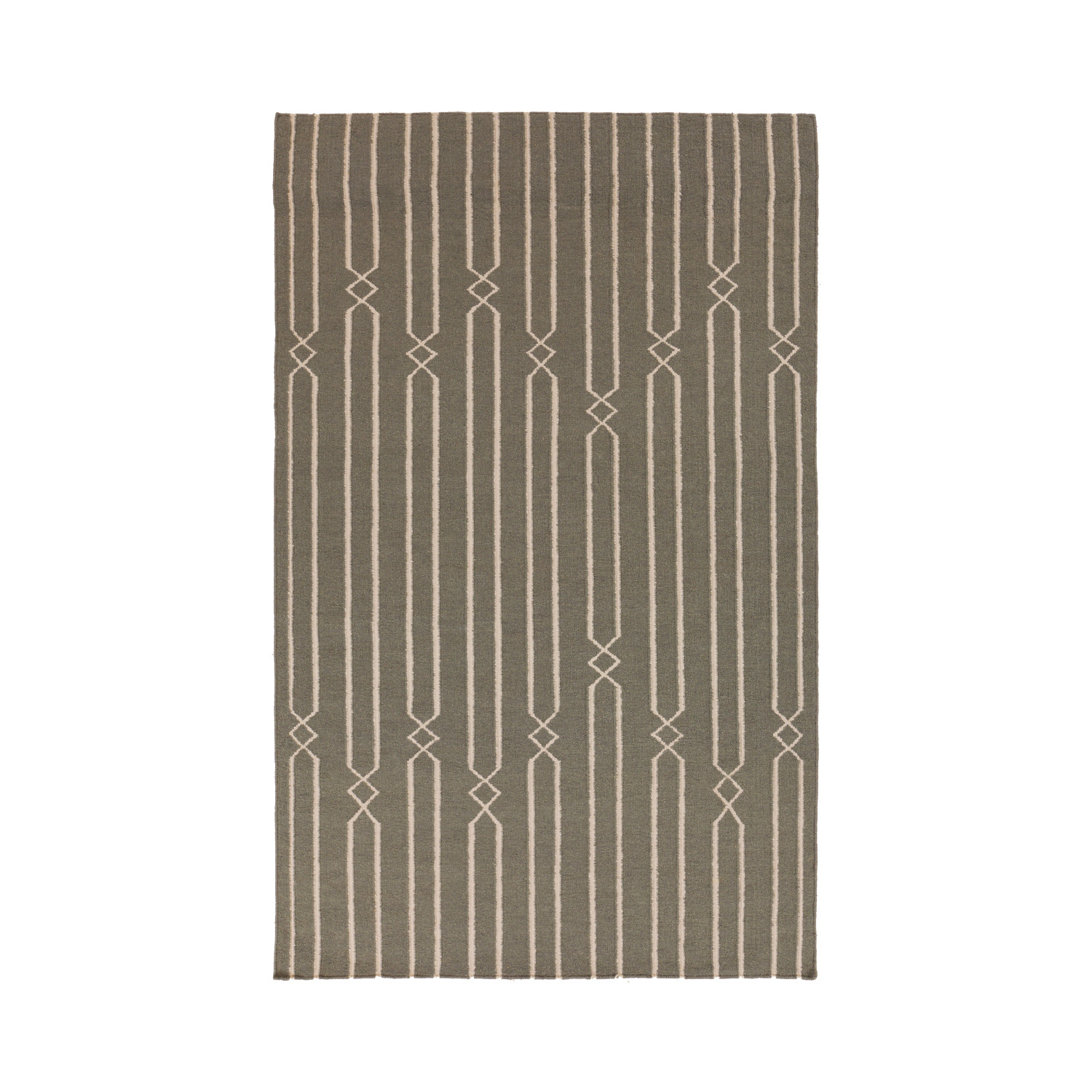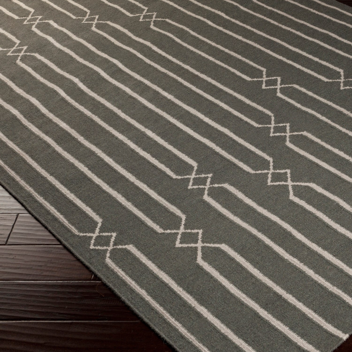 Surya's Frontier Collection features a series of flat-weave reversible designs with casual themes. Hand woven in India, these rugs are made from the finest wool with unique patterns designed to enrich any room. This rug features an elegant, deco-style pattern in muted tones.