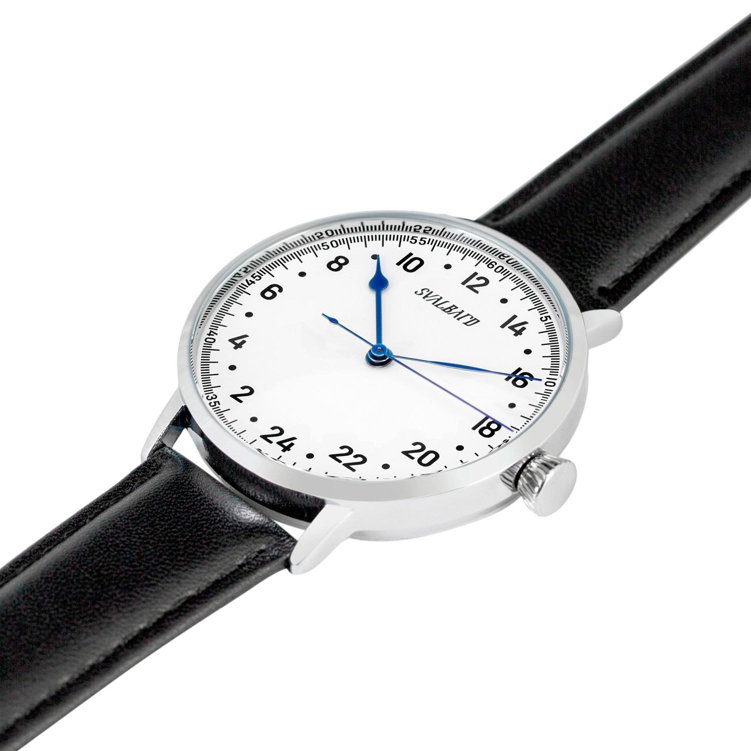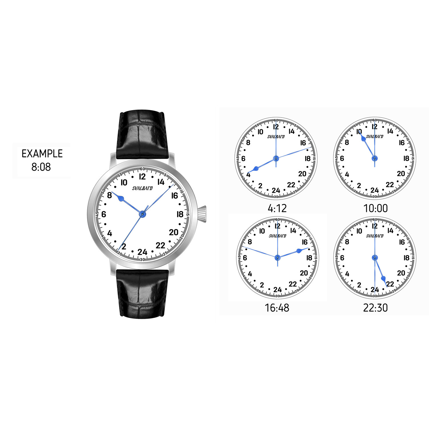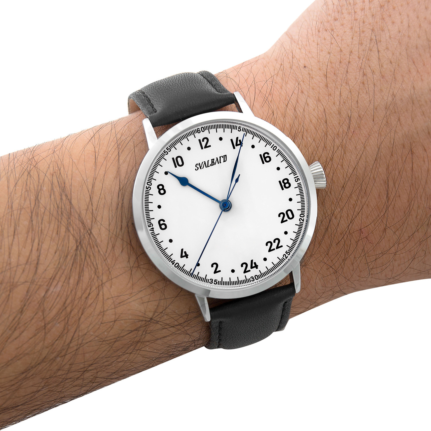 Svalbard specializes in unique time indications, like this bold 24-hour wrist watch with a Swiss quartz movement and a mineral crystal.