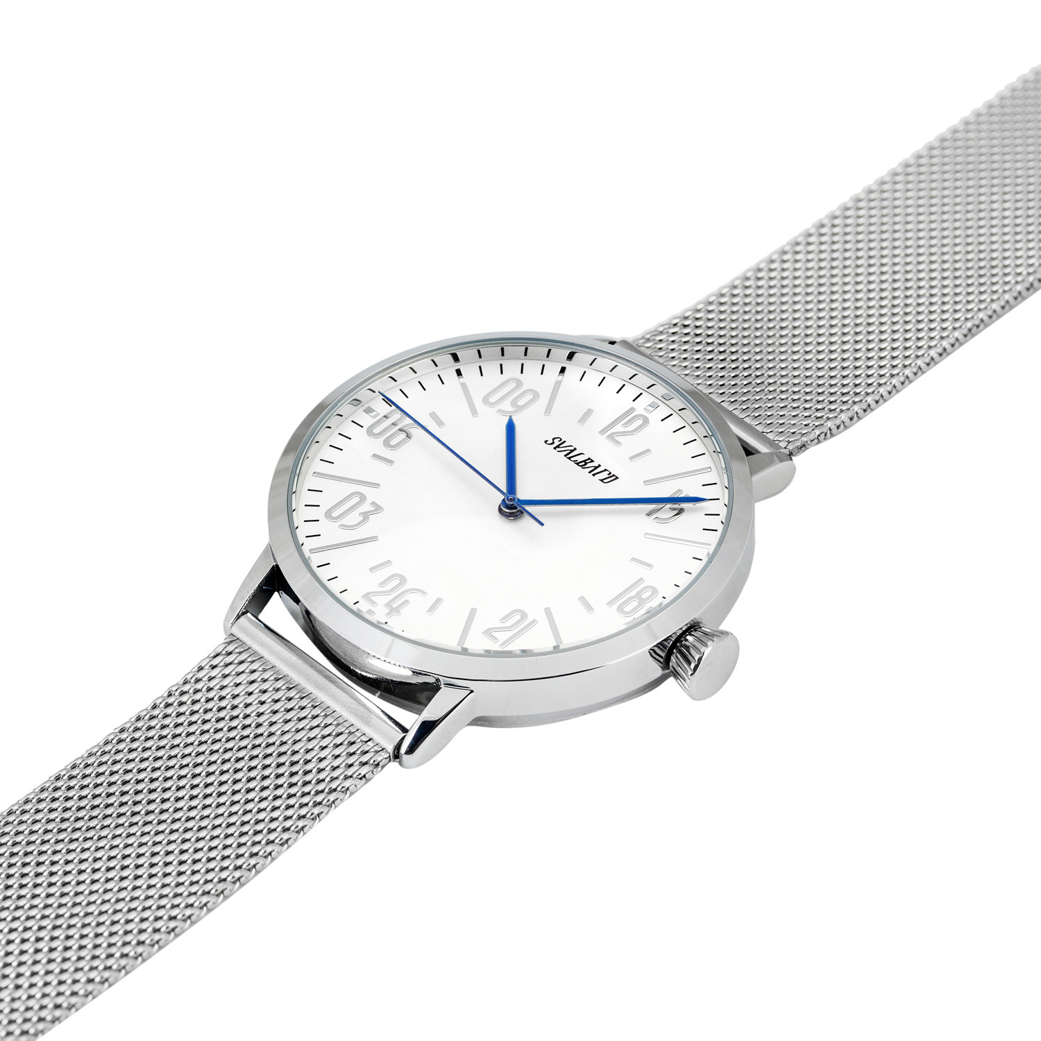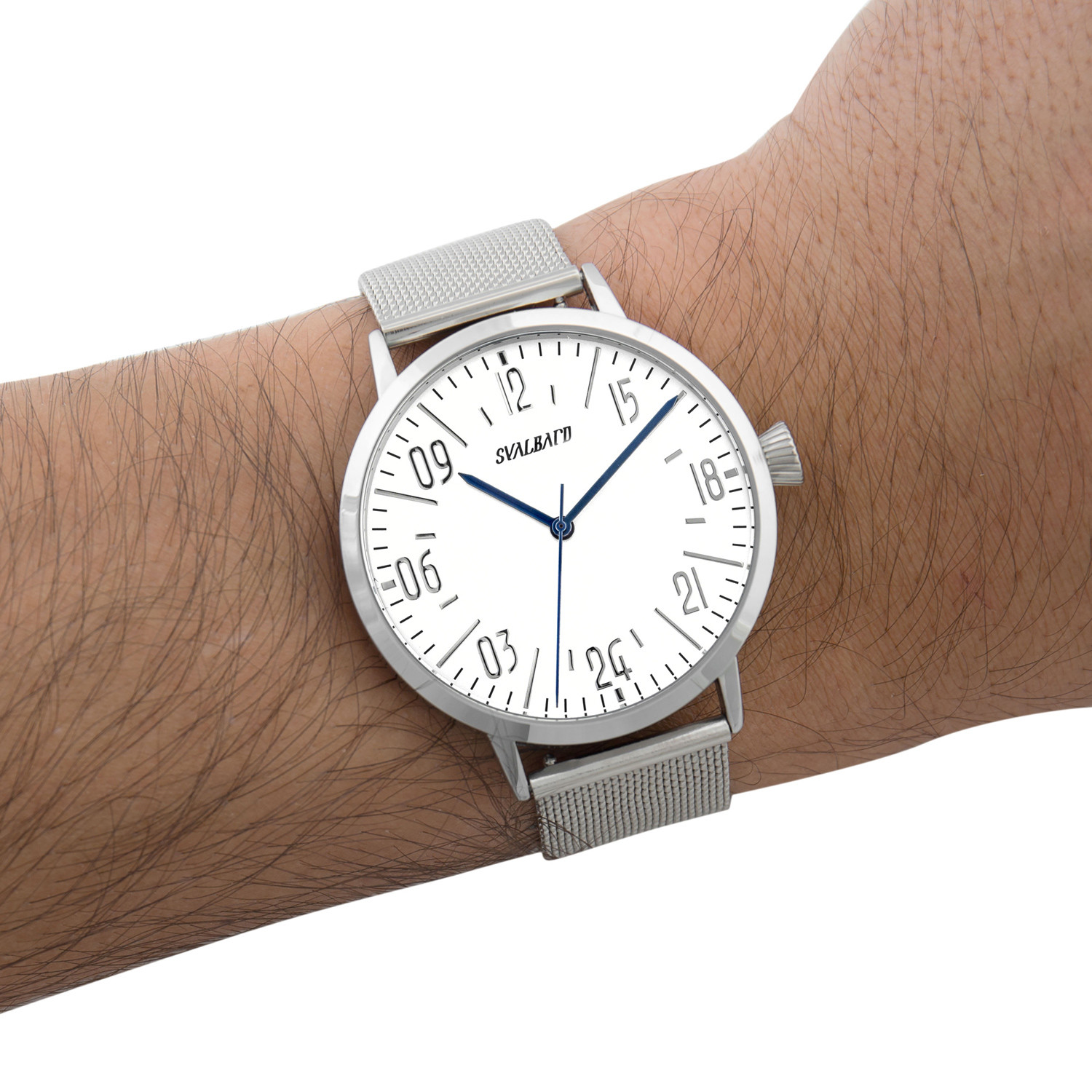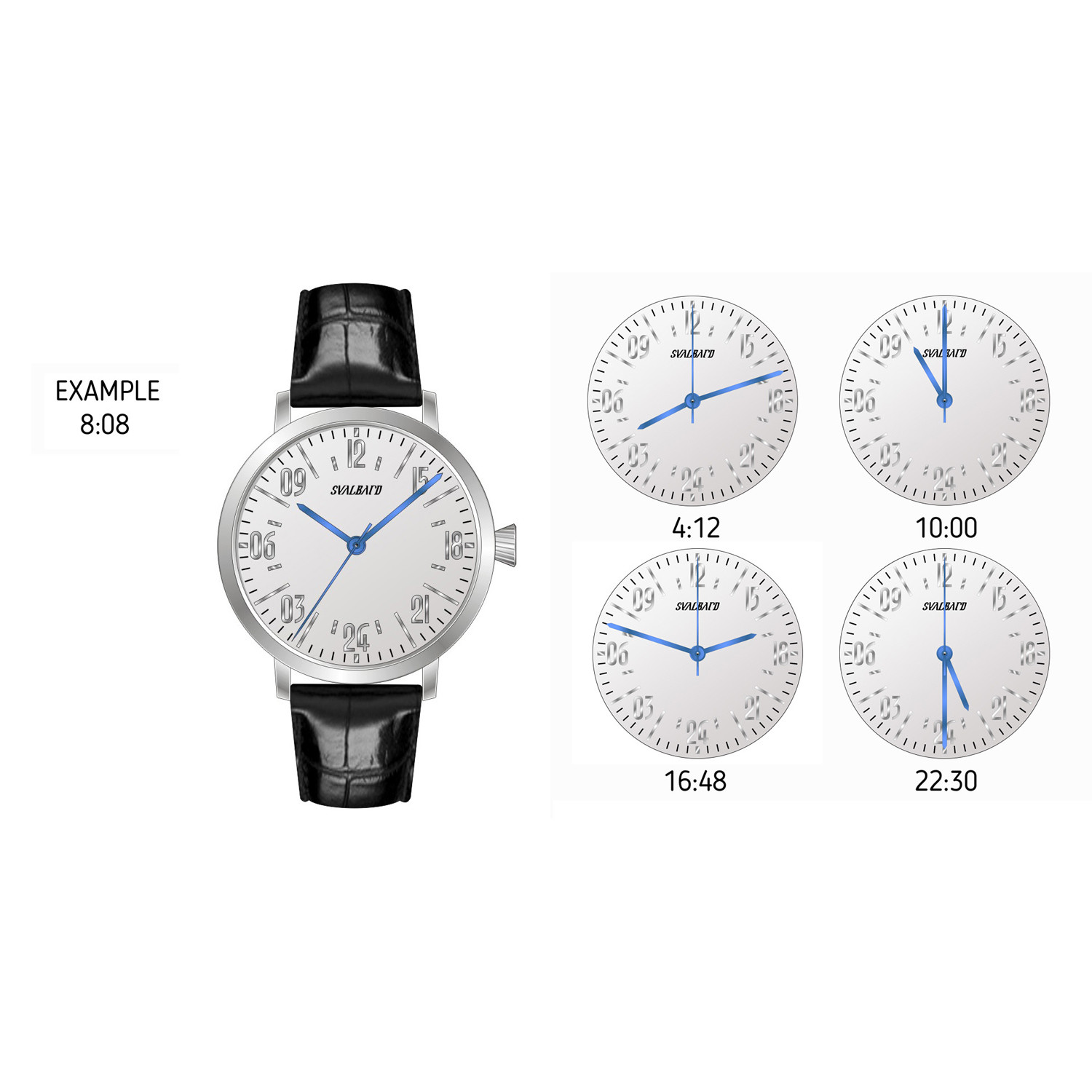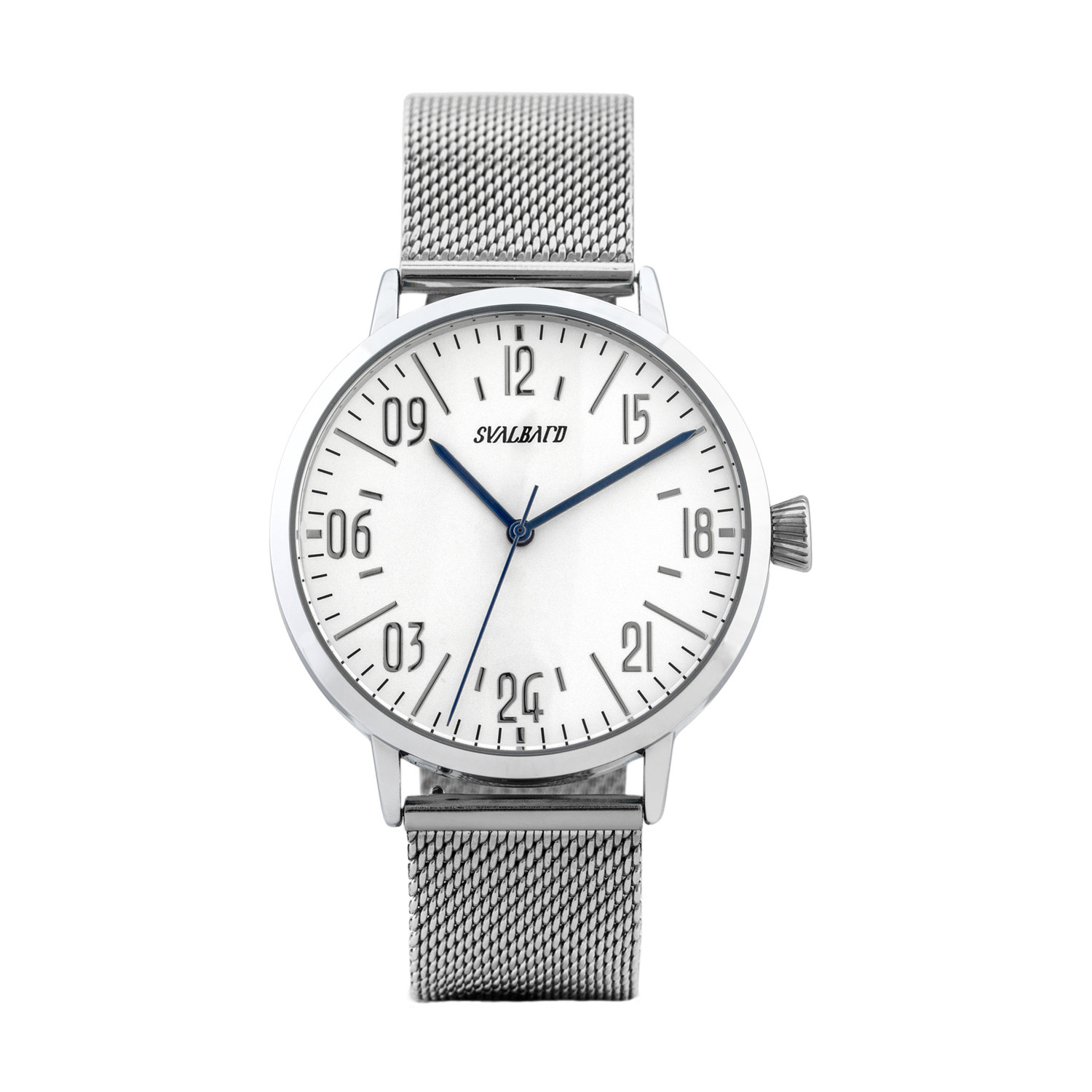 Svalbard specializes in unique time indications, like this bold 24-hour wrist watch with a Swiss quartz movement and a mineral crystal.
