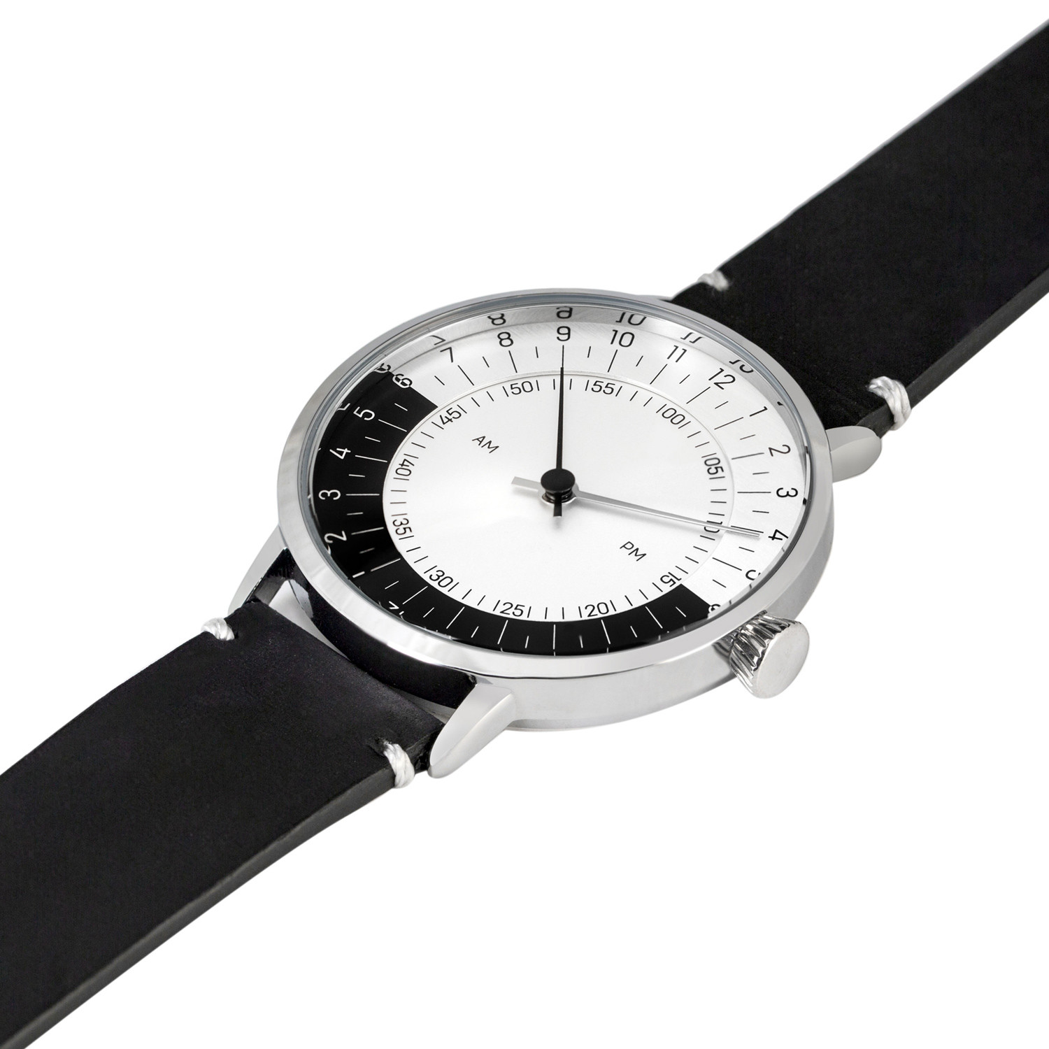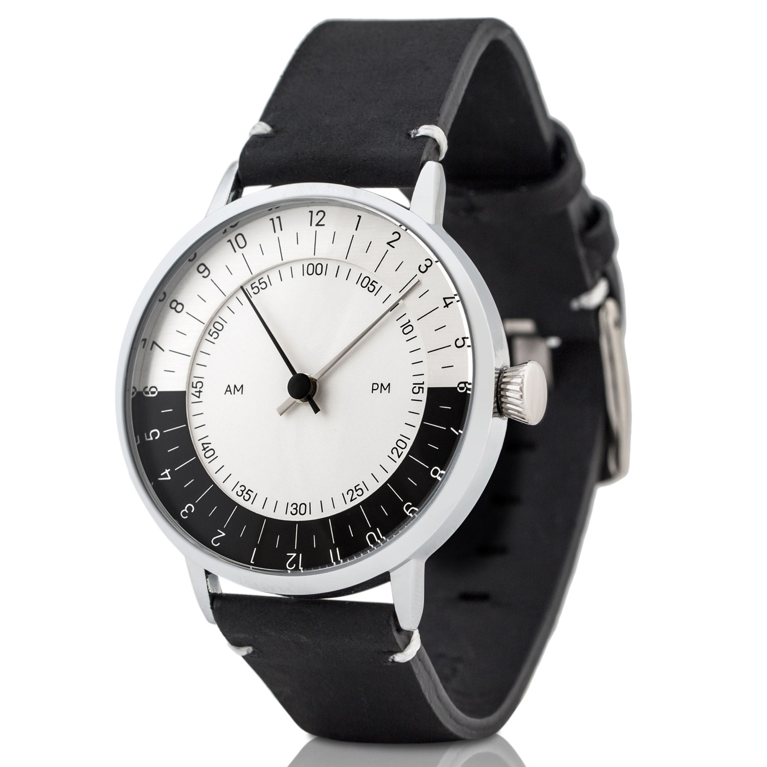 Svalbard specializes in unique time indications, like this bold 24-hour wrist watch with a Swiss quartz movement and a mineral crystal.