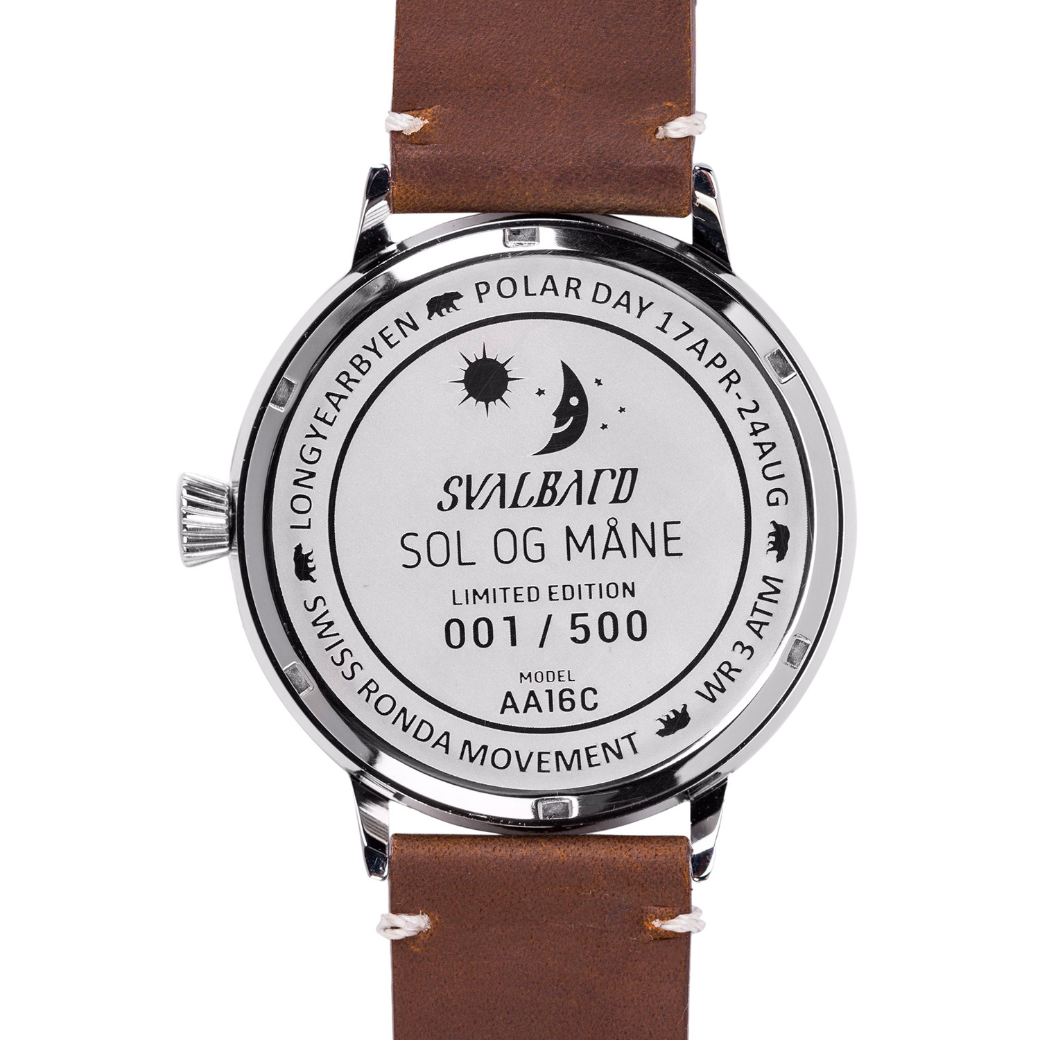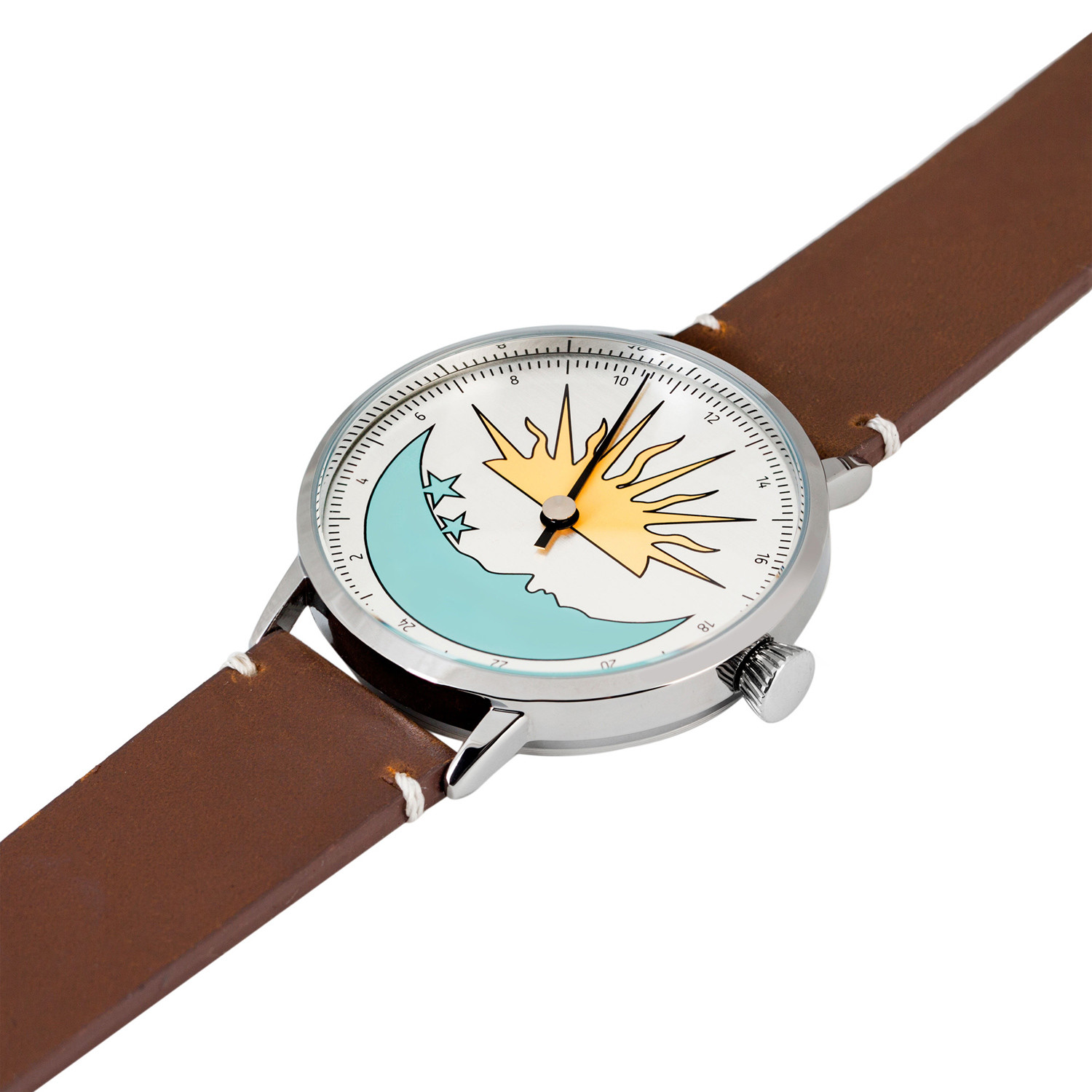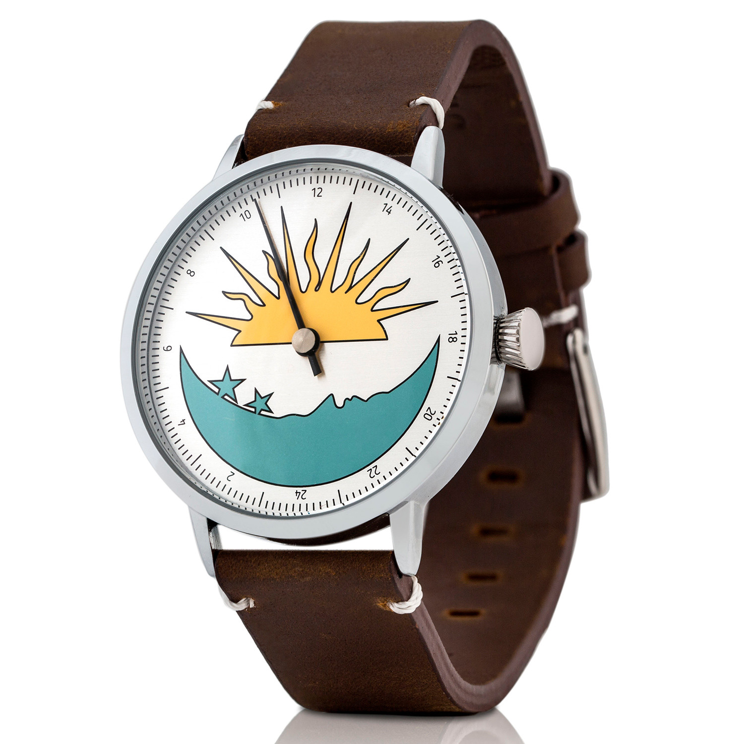 Svalbard's Sol Og Mane collection translates to "Sun and Moon." It features those two celestial bodies prominently on the unique 24 hour dial. The Swiss quartz movement drives the signature single hand, indicating the time.
