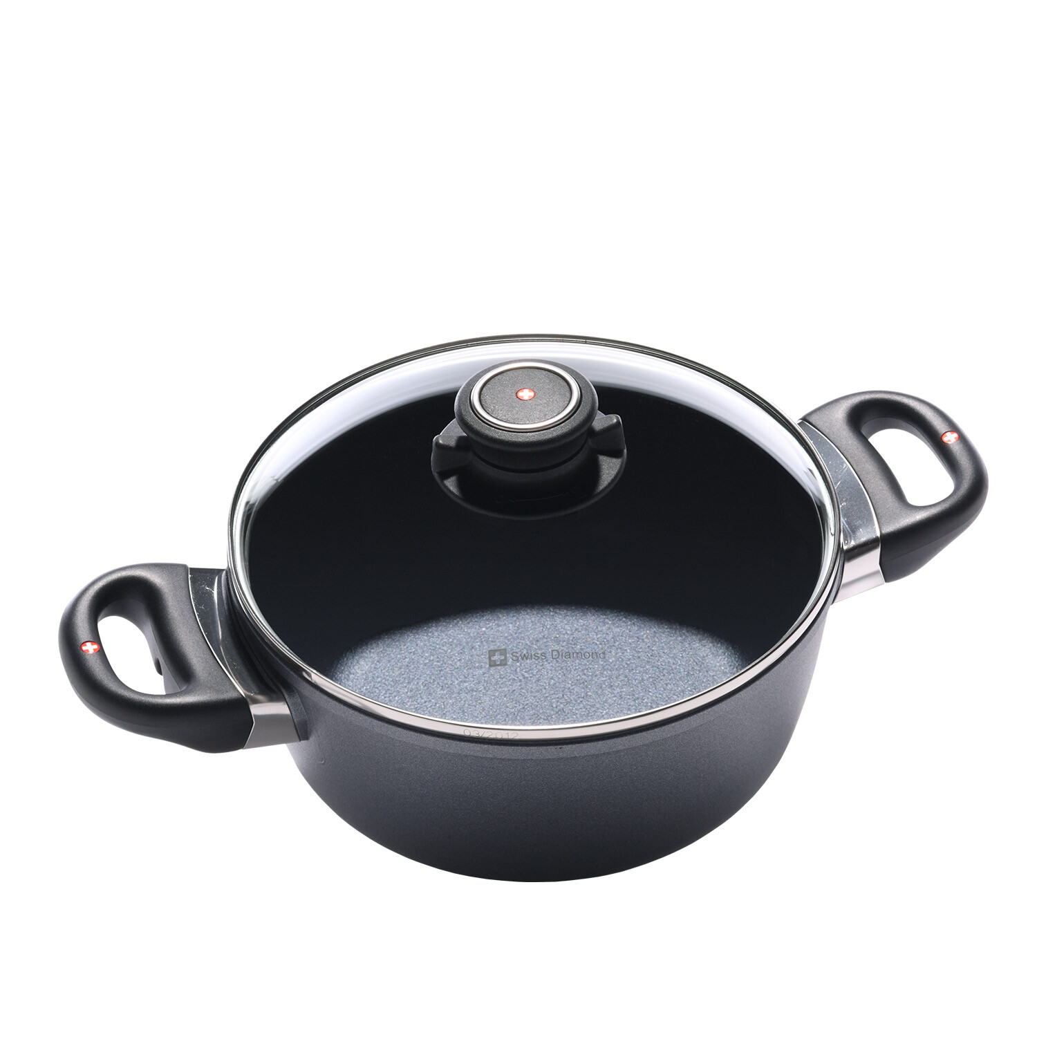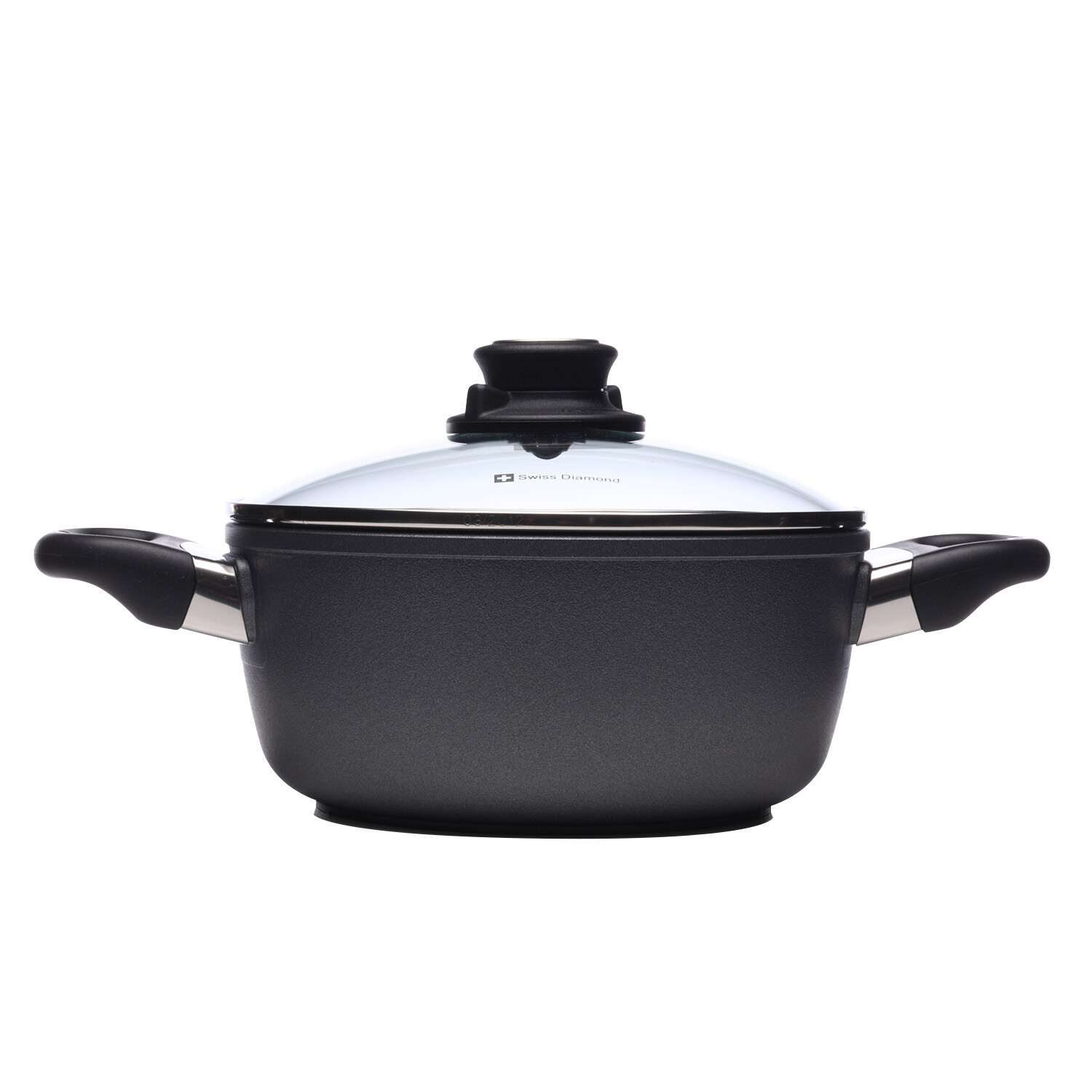 Swiss Diamond's PFOA-free cookware features unsurpassed nonstick performance for healthy cooking with little to no oil. Take one piece of cookware from stovetop to oven to table with this attractive 2.3 qt (8") Swiss Diamond Nonstick Casserole with Lid. This heavy-duty casserole dish is as also as easy to cook with as it is to clean.