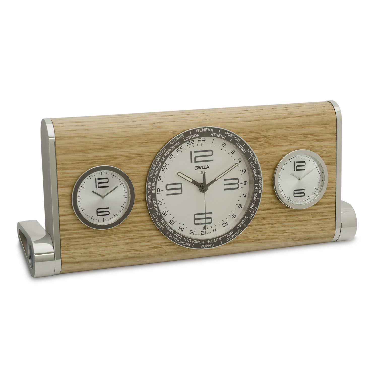 Dressed in wood, the Business Class quartz clock represents a very high Swiss Made quality. Combining luxury and multiple functions, it represents the best way of saying thanks to your dearest ones or "I'm busy" to your coworkers — with a gift every world traveler will appreciate. Paris, New York, London... you're always on time, thanks to the 3 time zone display!
