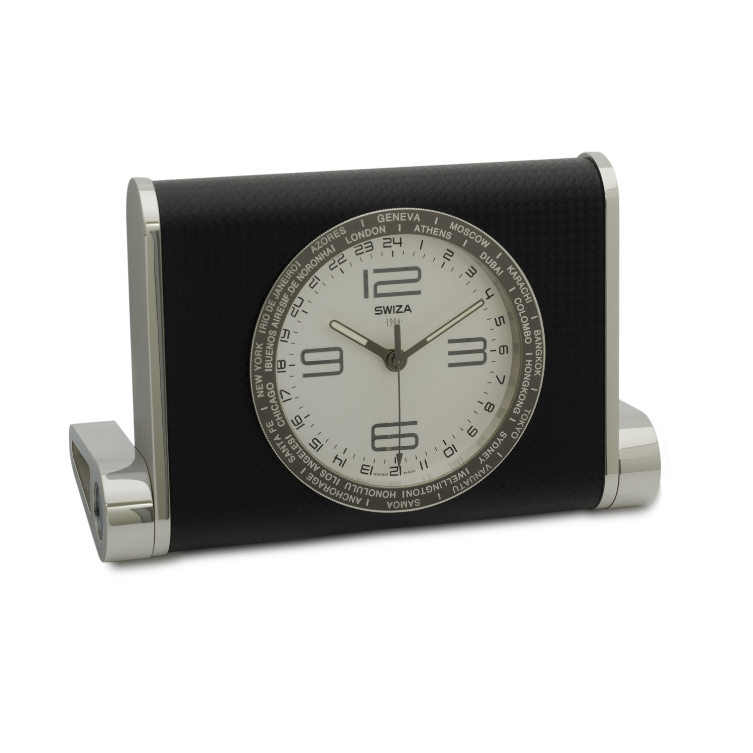 Dressed in carbon fibers, the Business Club quartz clock represents a very high Swiss Made quality. Combining luxury and multiple functions, it's a beautiful clock for your home, with Arabian dials, phosphorescent hands, and mineral glass.