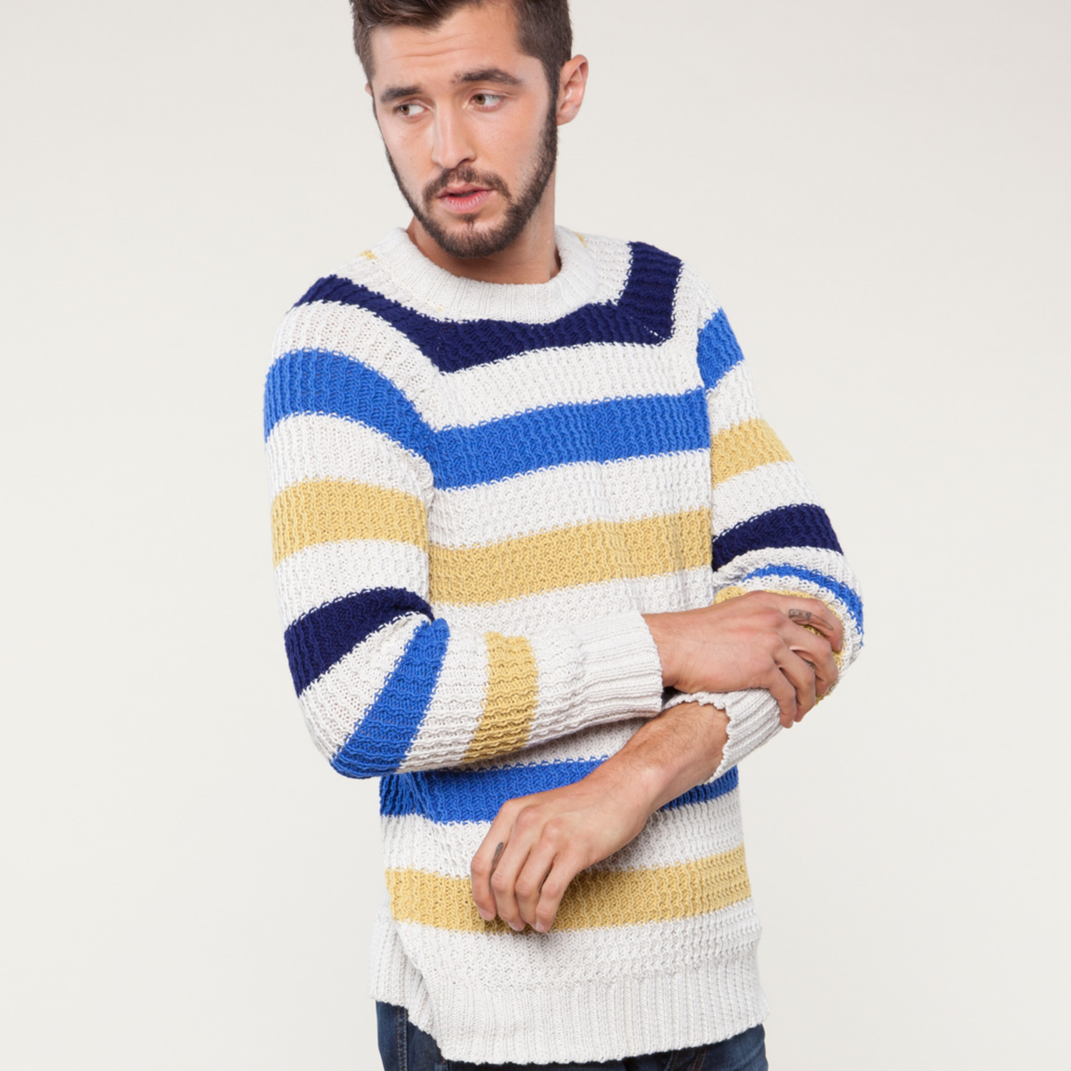 This Lucio Castro Striped Crew Sweater features bold and oversized stripes in yellow and blue on white, with a thick knit that invites you to touch it.