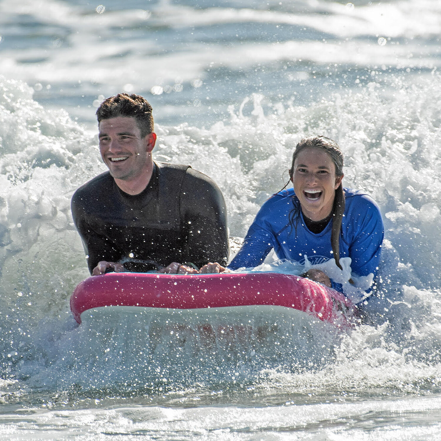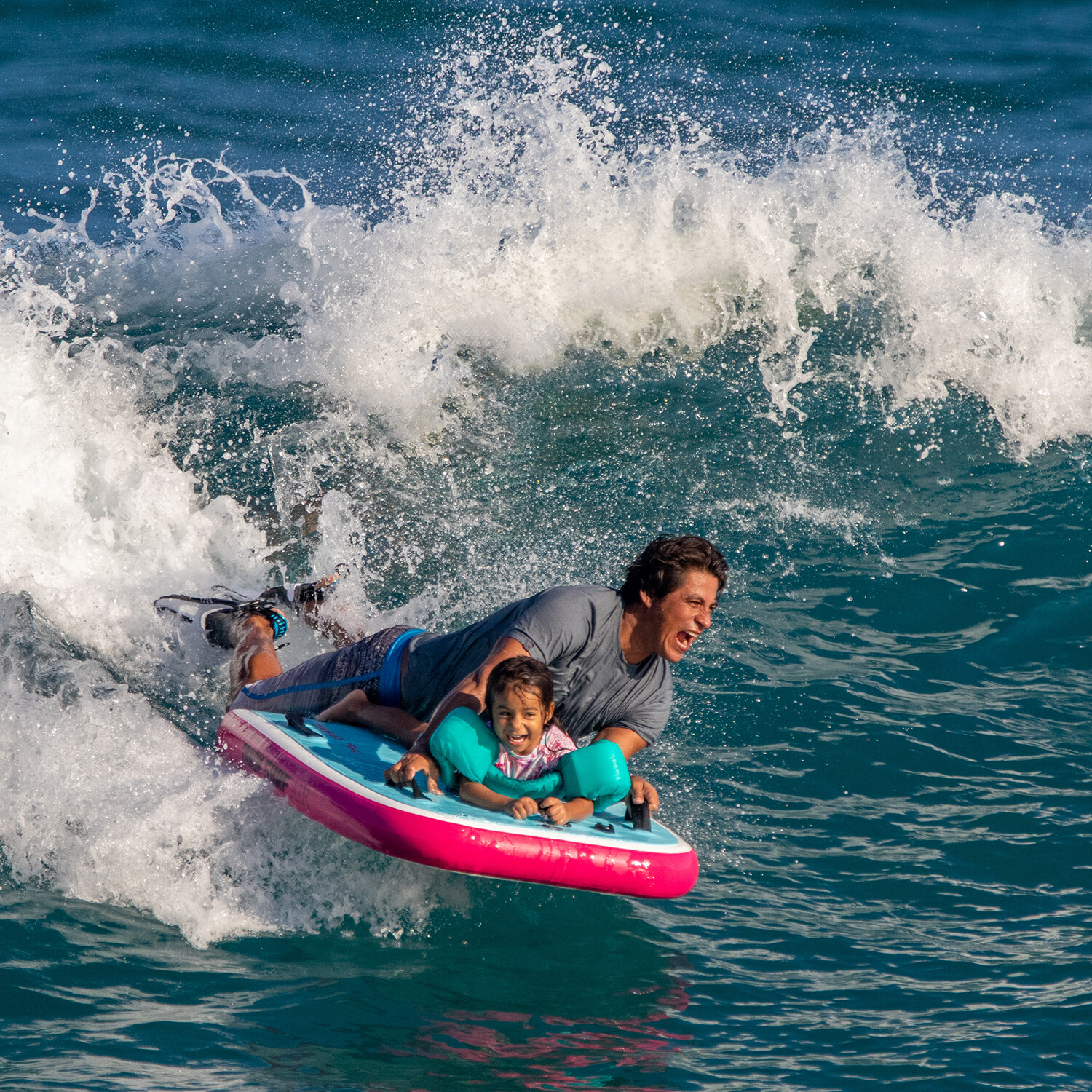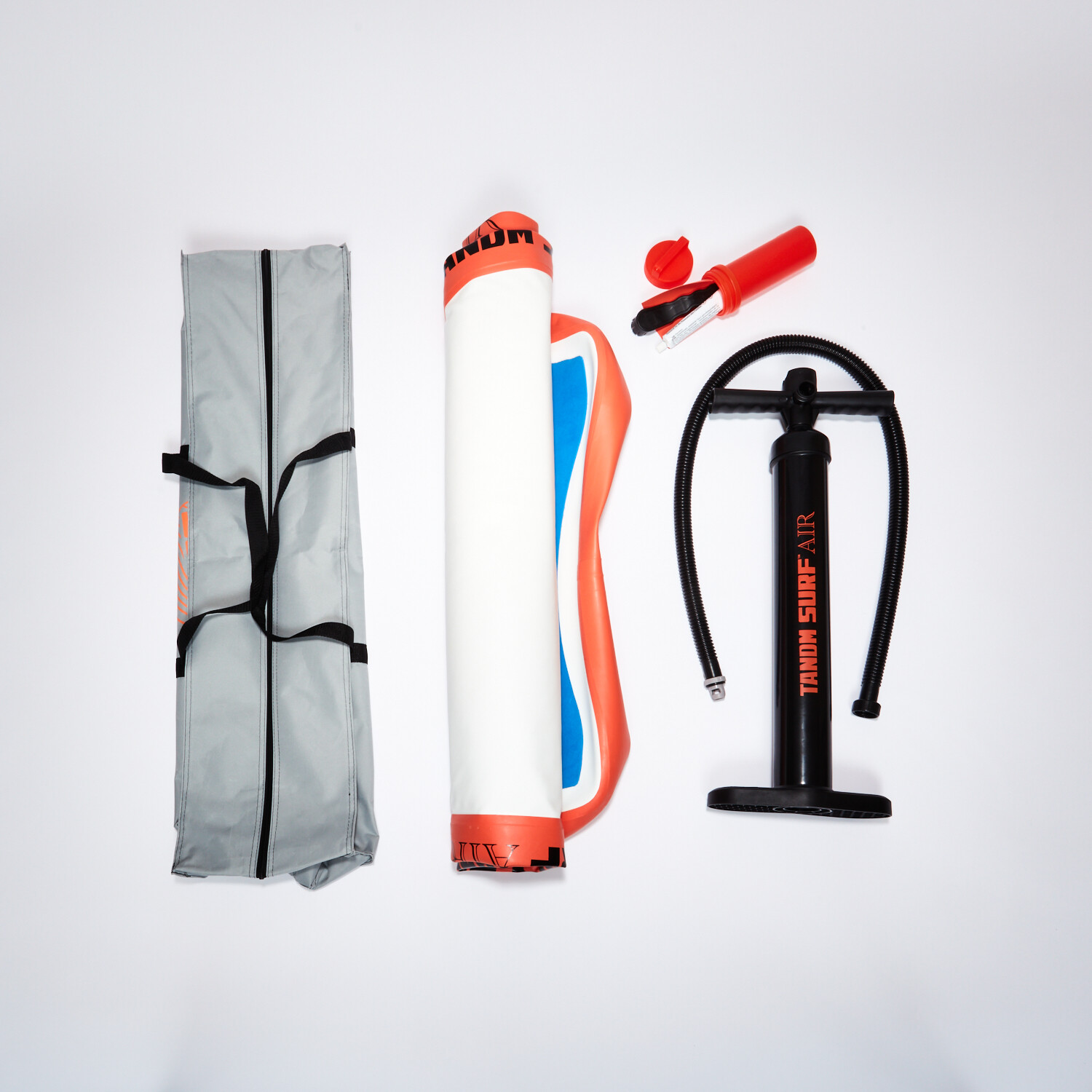 Share the joy of catching and surfing waves, sledding down snowy hills, or floating in the lake with family and friends on the two-person Tandm Surf AIR Inflatable Bodyboard. The patent pending Dynamic AIR Inflatable Design allows you to carry the board anywhere. Since it's inflatable, It rolls up and fits conveniently into the included travel bag. You just show up at the beach and pump it up. Includes soft EVA safe handles and a built-in camera mount to capture all of the memories, so don't forget your GoPro camera and to share the fun with everyone!