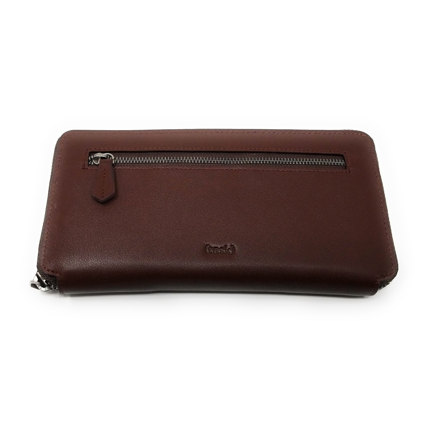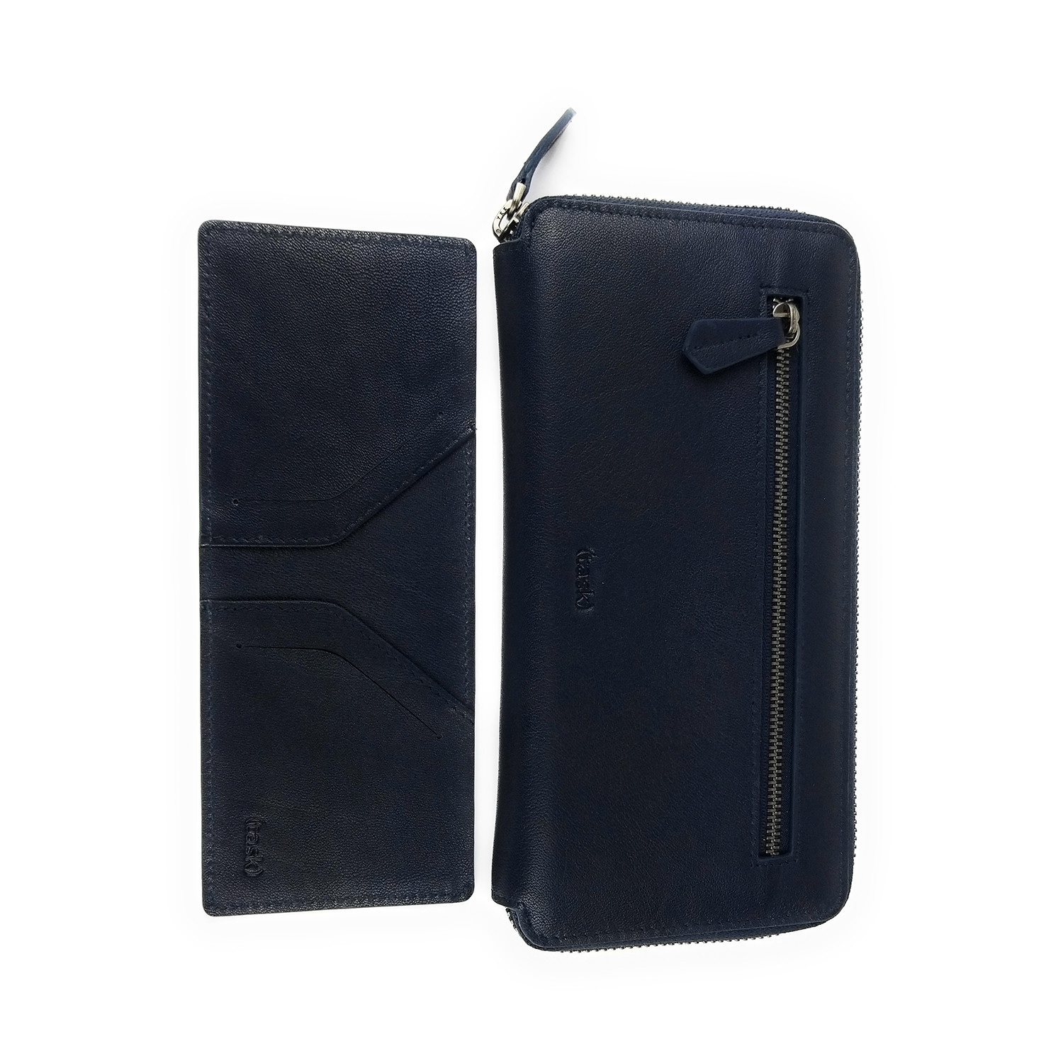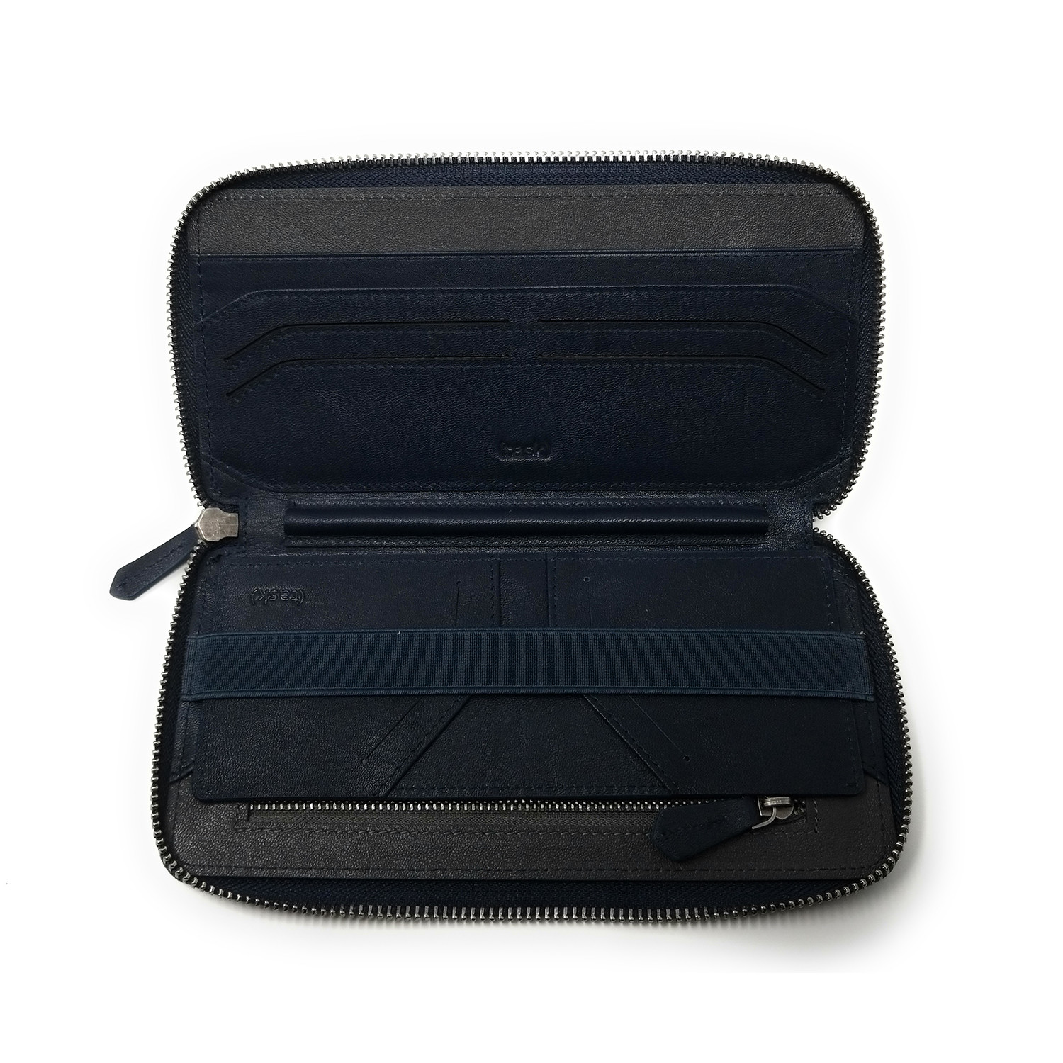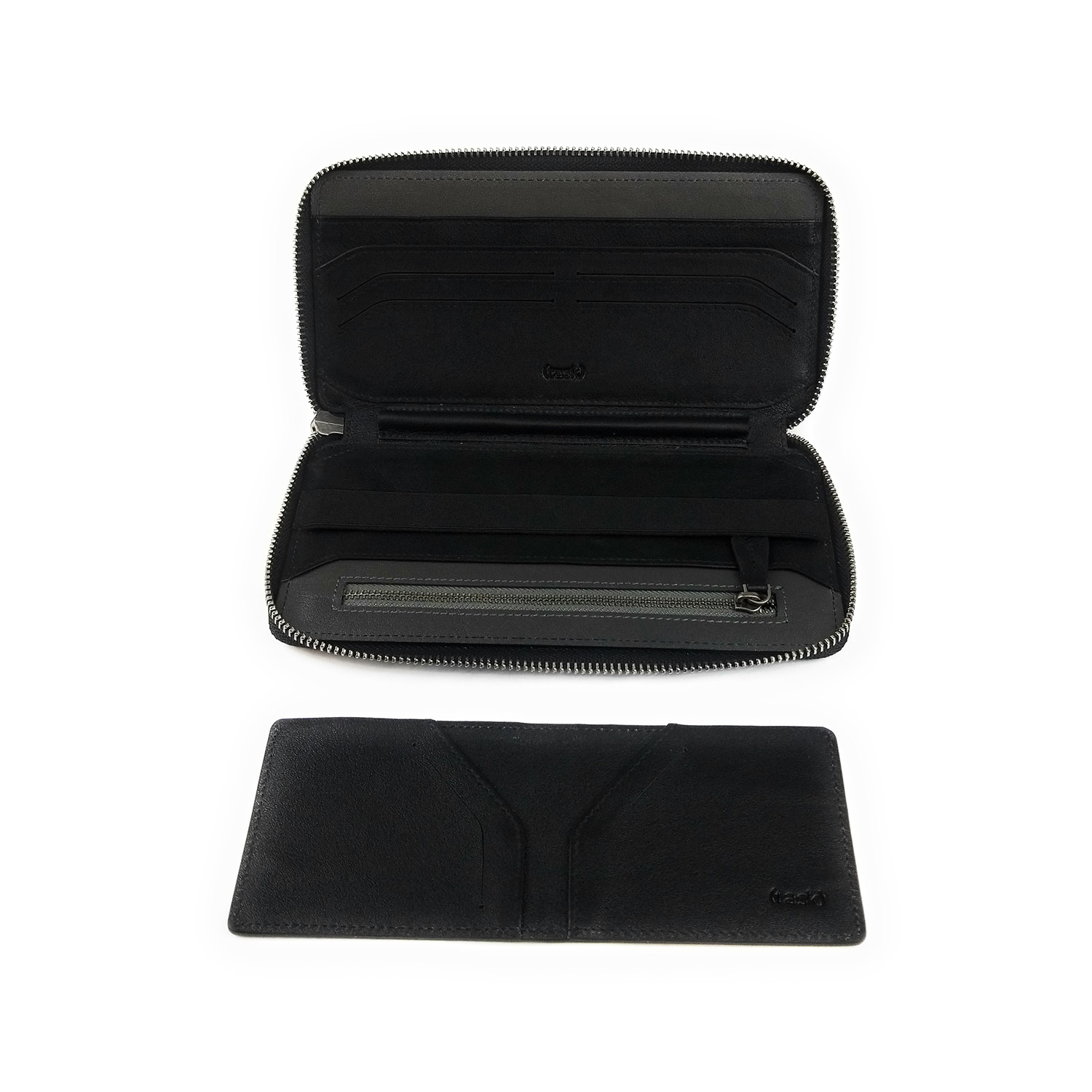 The Task Wallet is a premium napa leather zip-around travel wallet with a removable bifold wallet inside. It features a zippered external pocket and plenty of pockets for cash, cards, and documents, all held together and organized with an elastic strap.