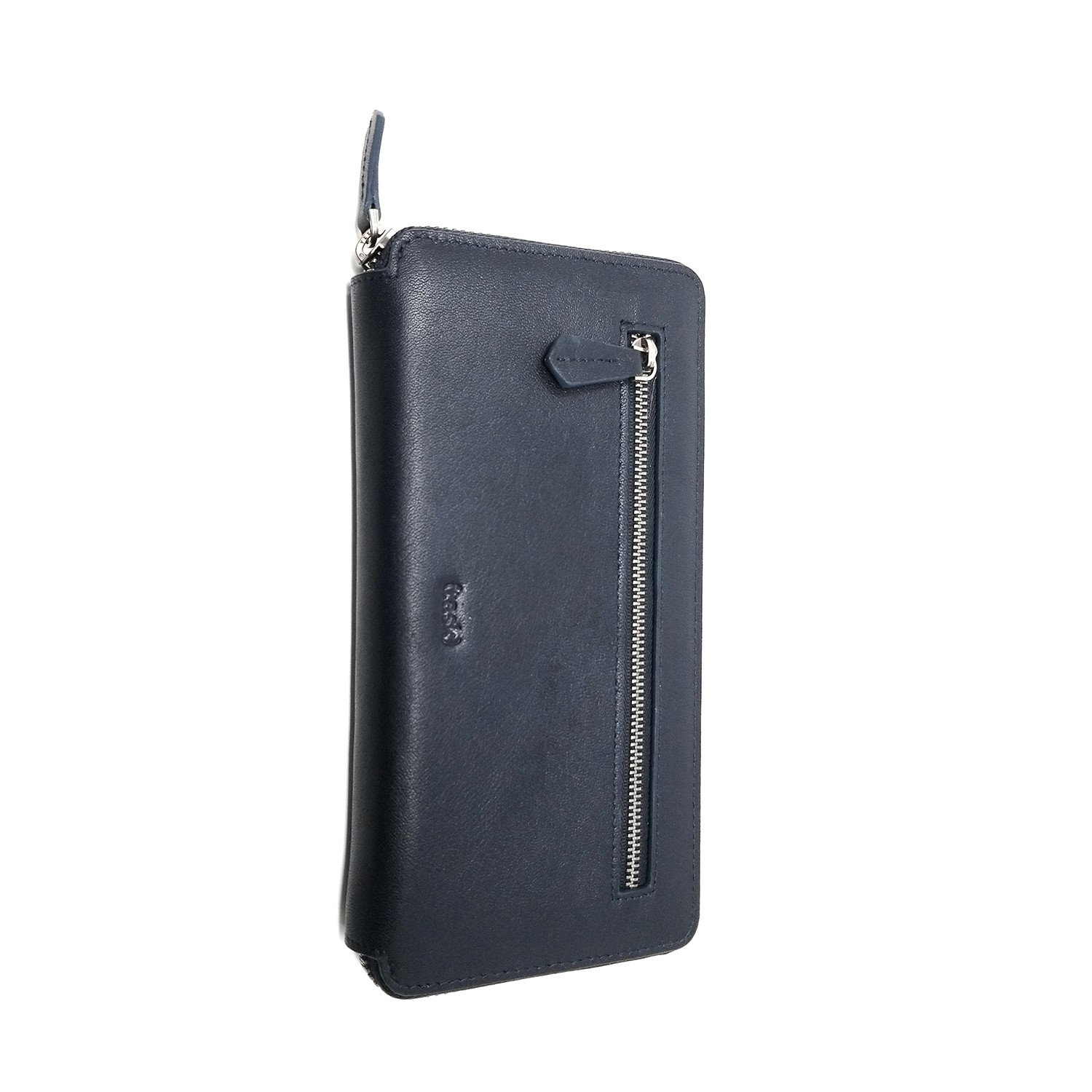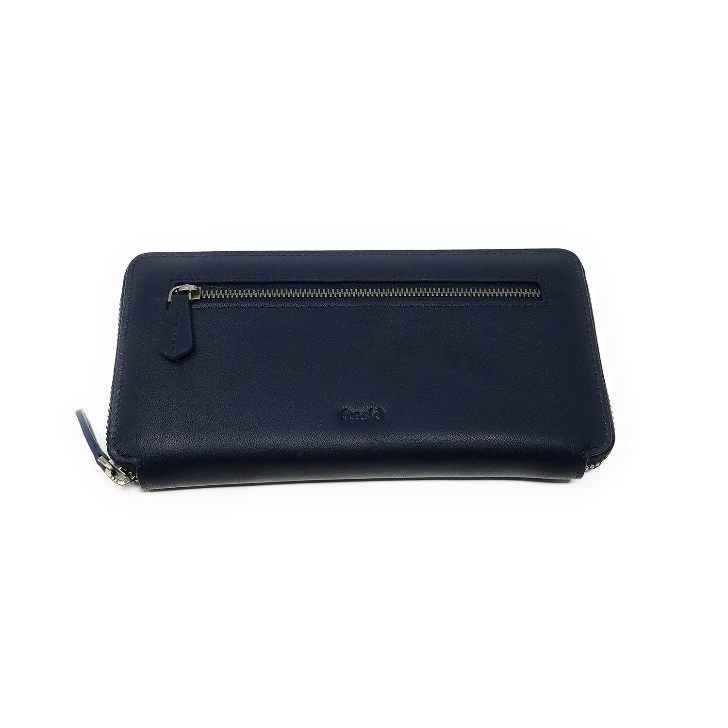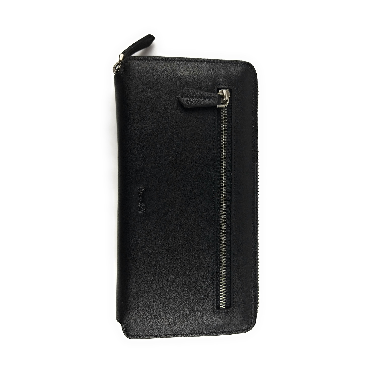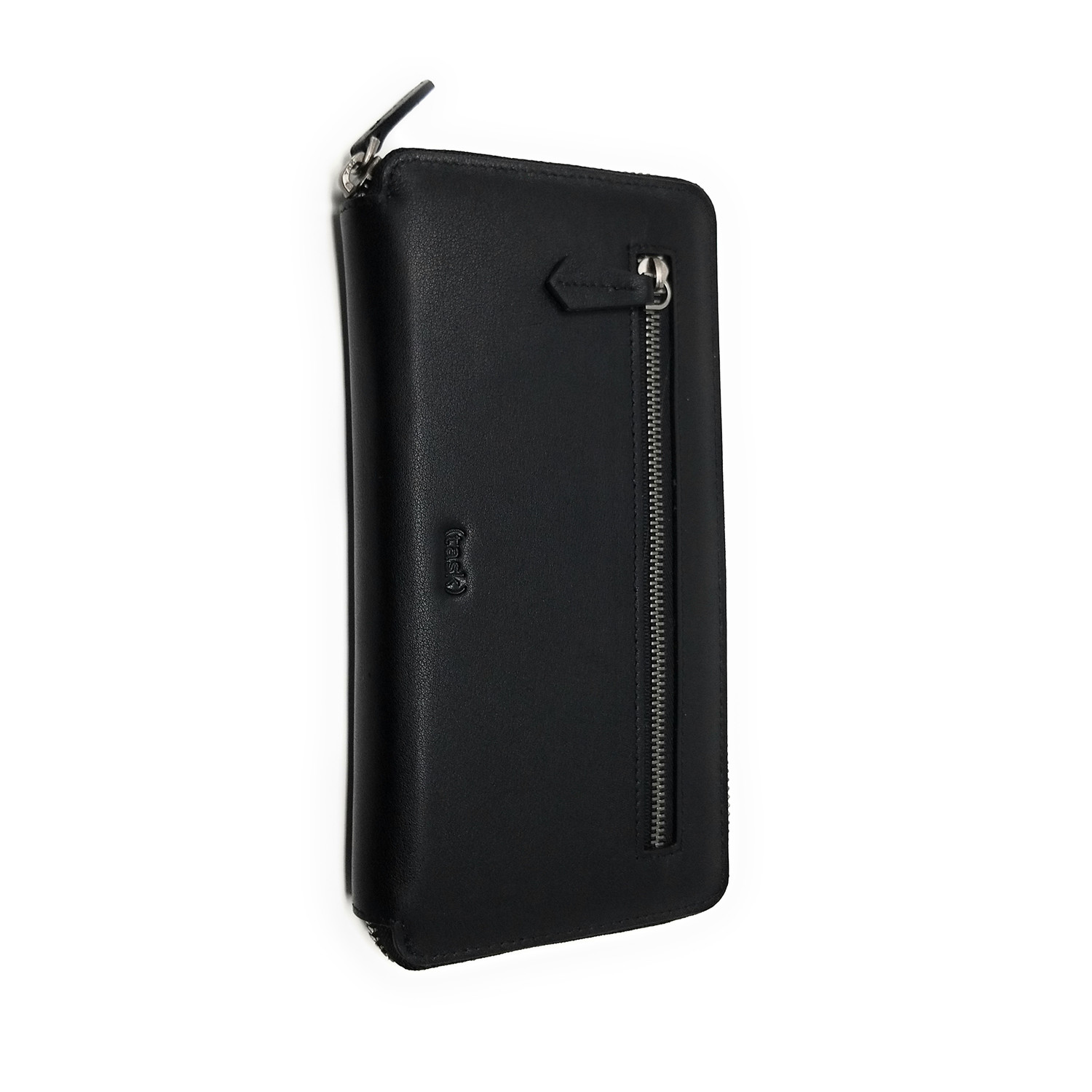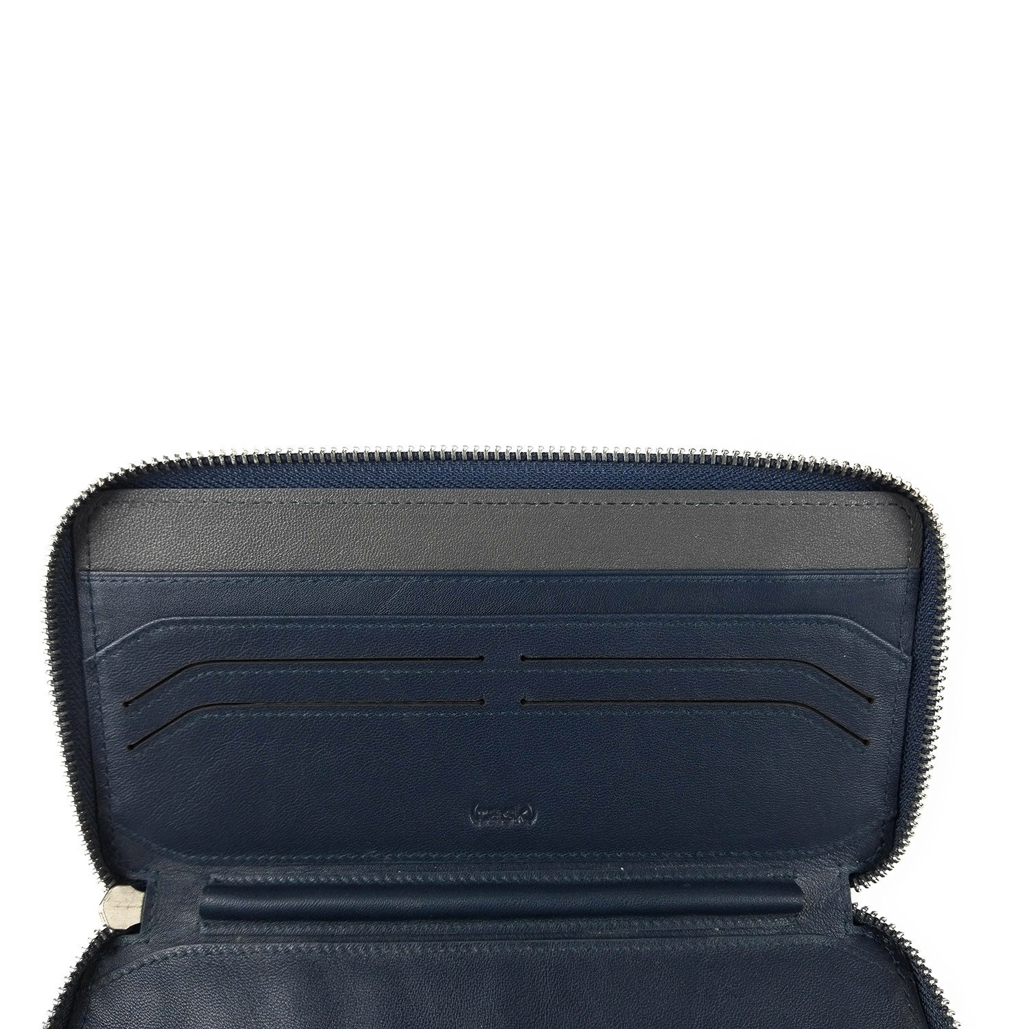 The Task Wallet is a premium napa leather zip-around travel wallet with a removable bifold wallet inside. It features a zippered external pocket and plenty of pockets for cash, cards, and documents, all held together and organized with an elastic strap.
