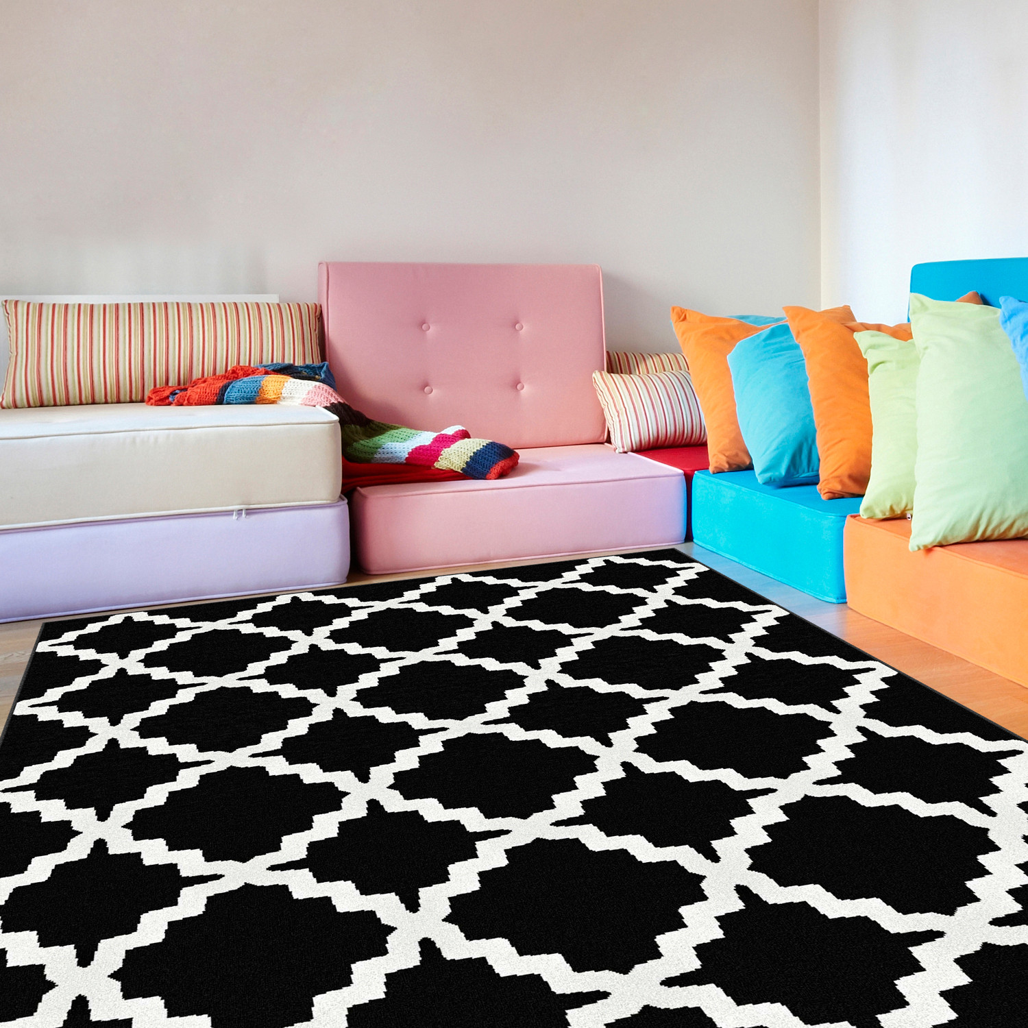 The classic lattice pattern gets a modern update in black with textural white lines. This design is sure to bring life to any room, whether you add a dash of pattern with a hall runner or go bold with a large area rug. The clean lines and crisp color of these rugs are executed in 0.39-inch pile for a plush hand made of high density polypropylene fibers for long wear.