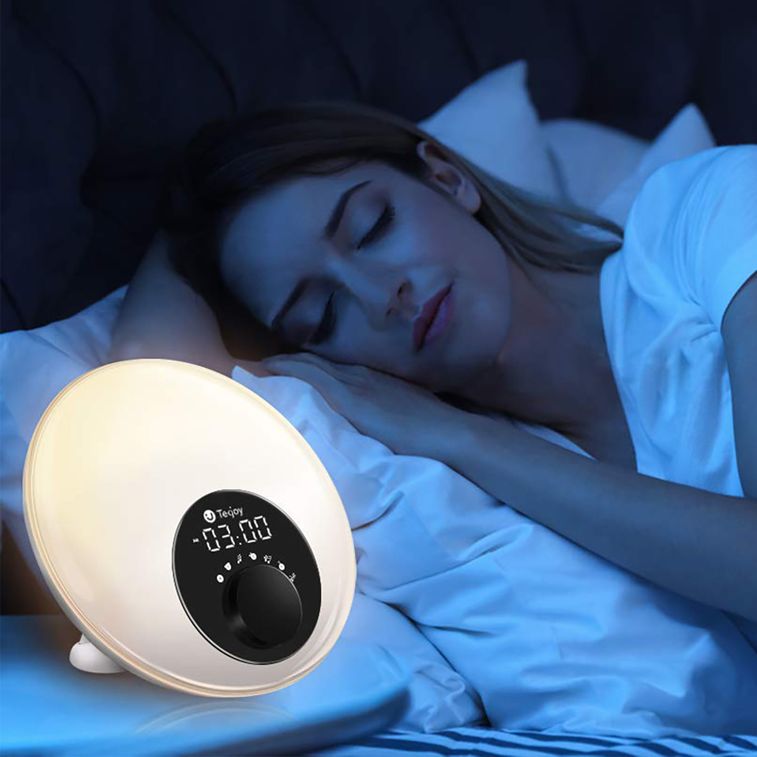 Fall asleep easier and wake up naturally refreshed with the Tekjoy Wake Up Light Sunrise Alarm Clock. This digital alarm clock and LED lamp simulates the color of the sunset and sunrise to ease you to sleep at night and gently wake you up in the morning. It also functions as a cozy bedside night light, a color adjustable mood lamp, an FM radio, and a white noise machine with multiple sound options to help you get the rest you need.