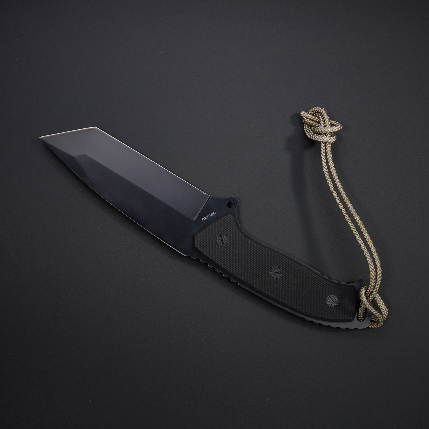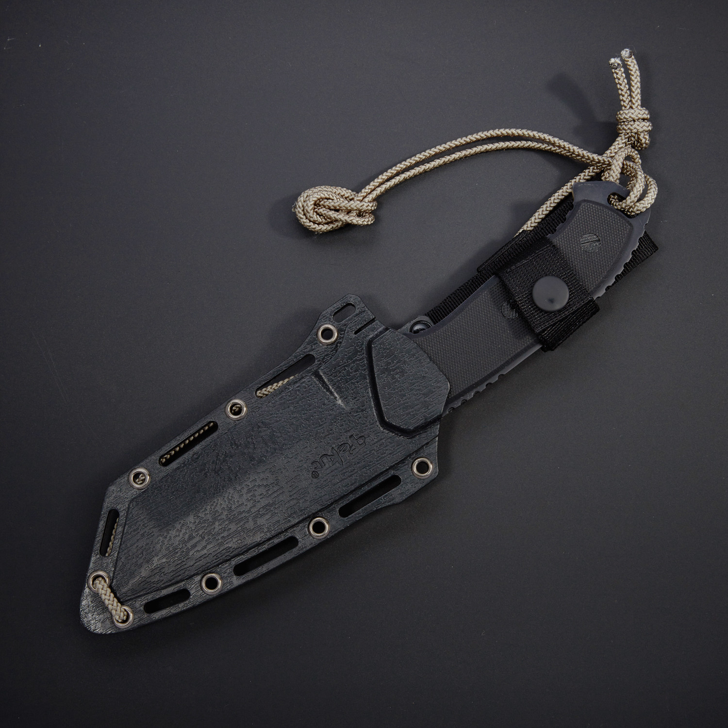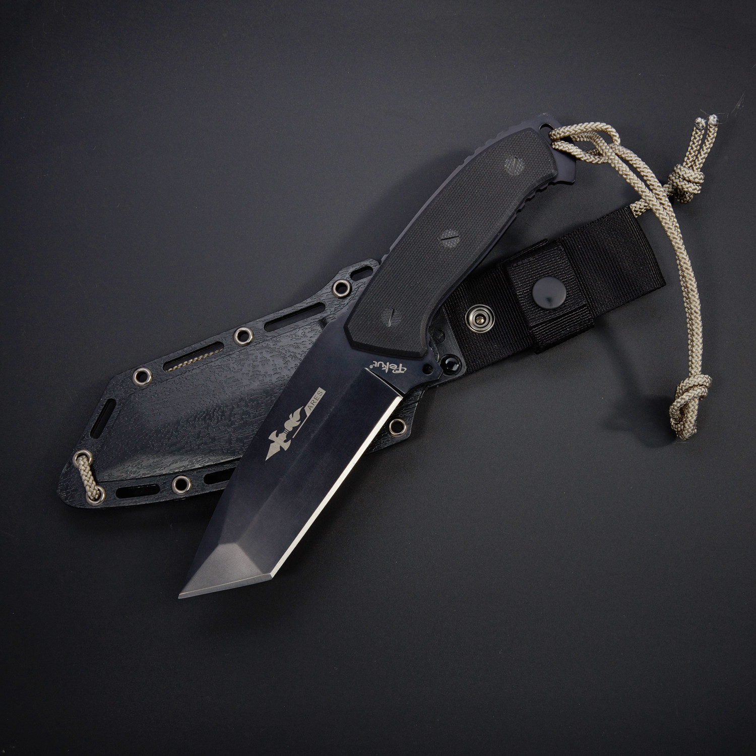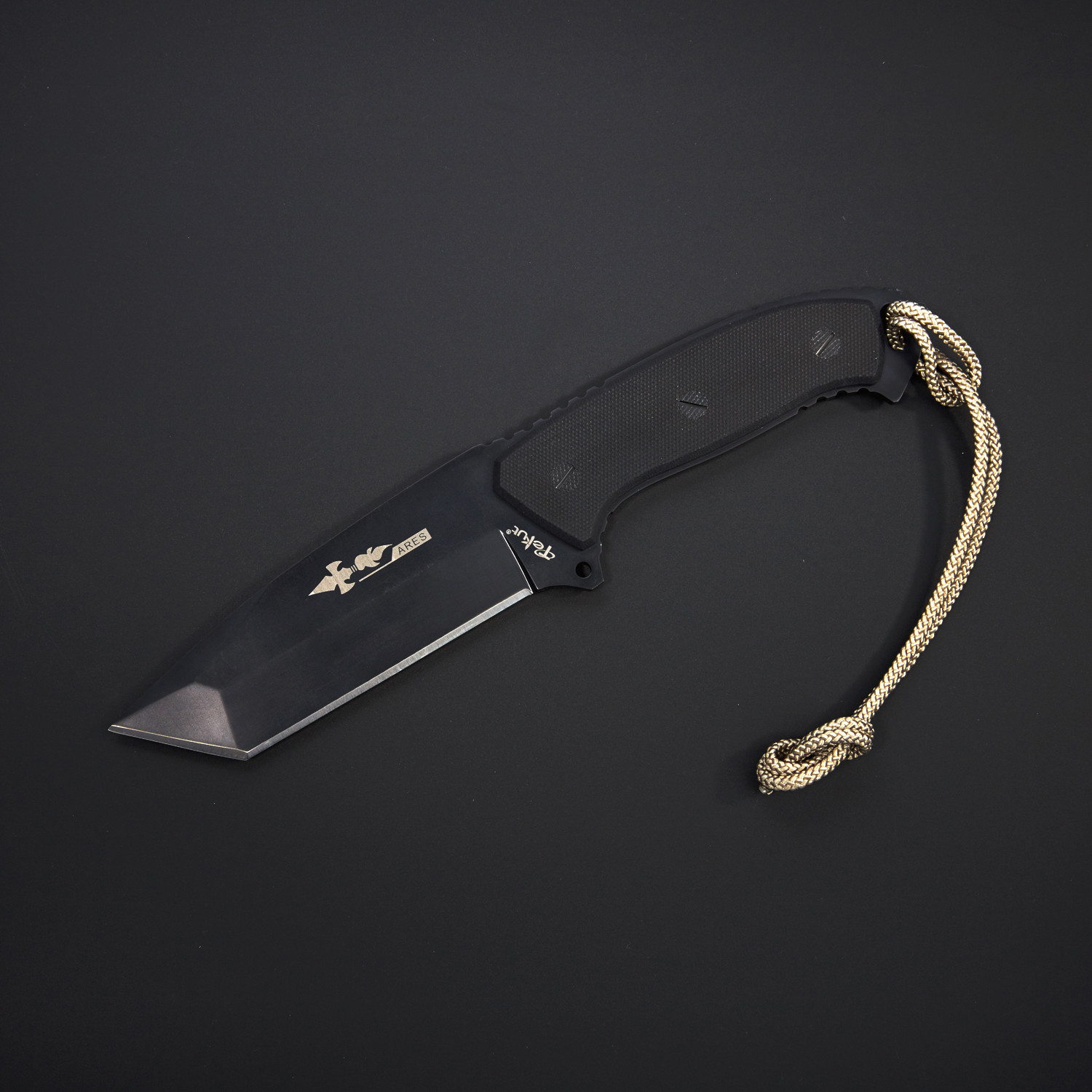The Tanto Blade of the Ares design is acknowledged as having the best penetrating ability of them all, and historically was used in knives and swords designed for metal body armor piercing. The blackened processing blade looks marvelously cool, and you can grasp the knife's well and grooved guard protect your hand from hurting. The knife accessory is a tough Kydex sheath, with which you can hang the Ares on your belt, backpack, or wherever it's most needed.