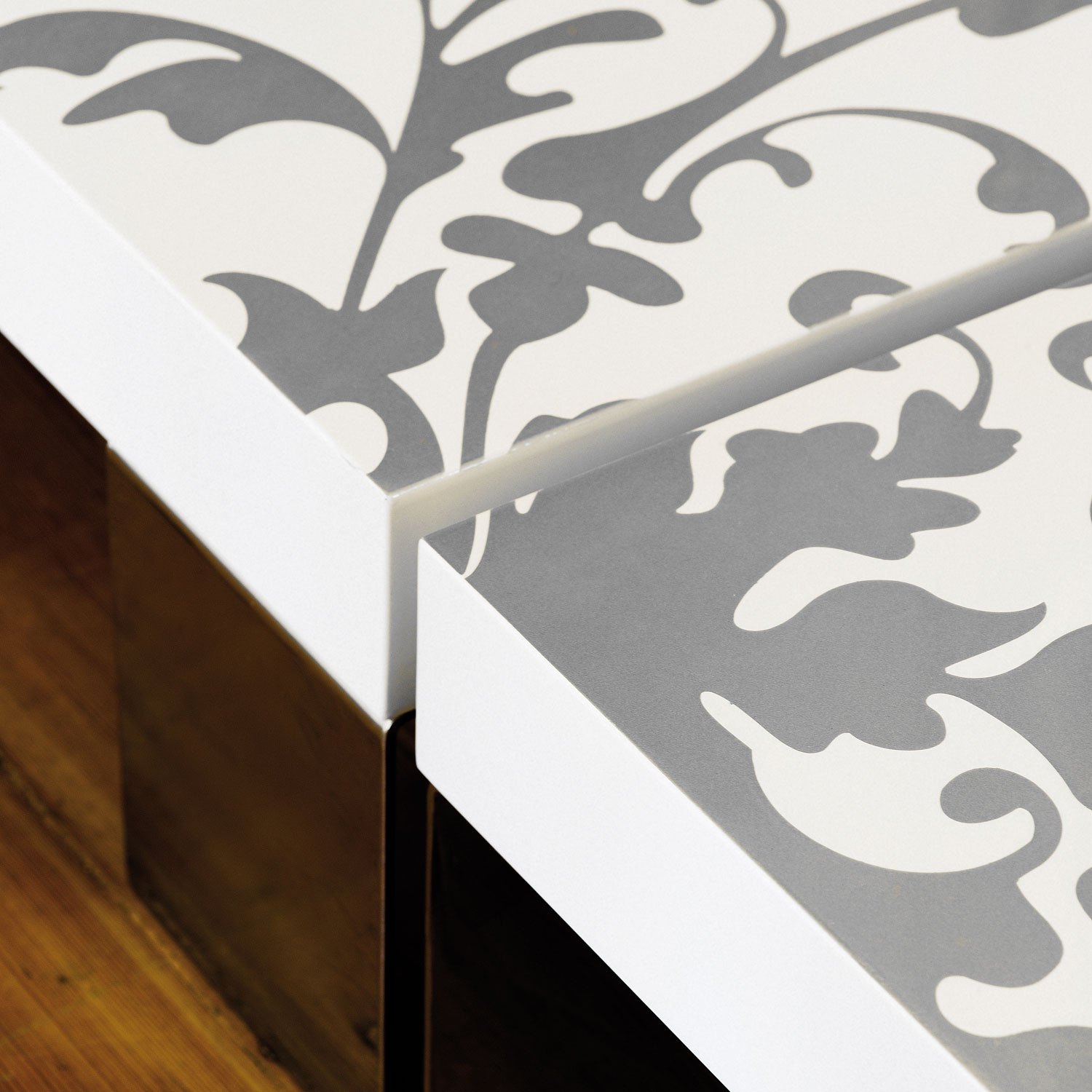 This set of tables has a unique marriage of visual communication and product design. The silver floral pattern is applied to the coffee table before the final lacquer which gives it a uniform high gloss finish. This set is one-of-a-kind for your space.