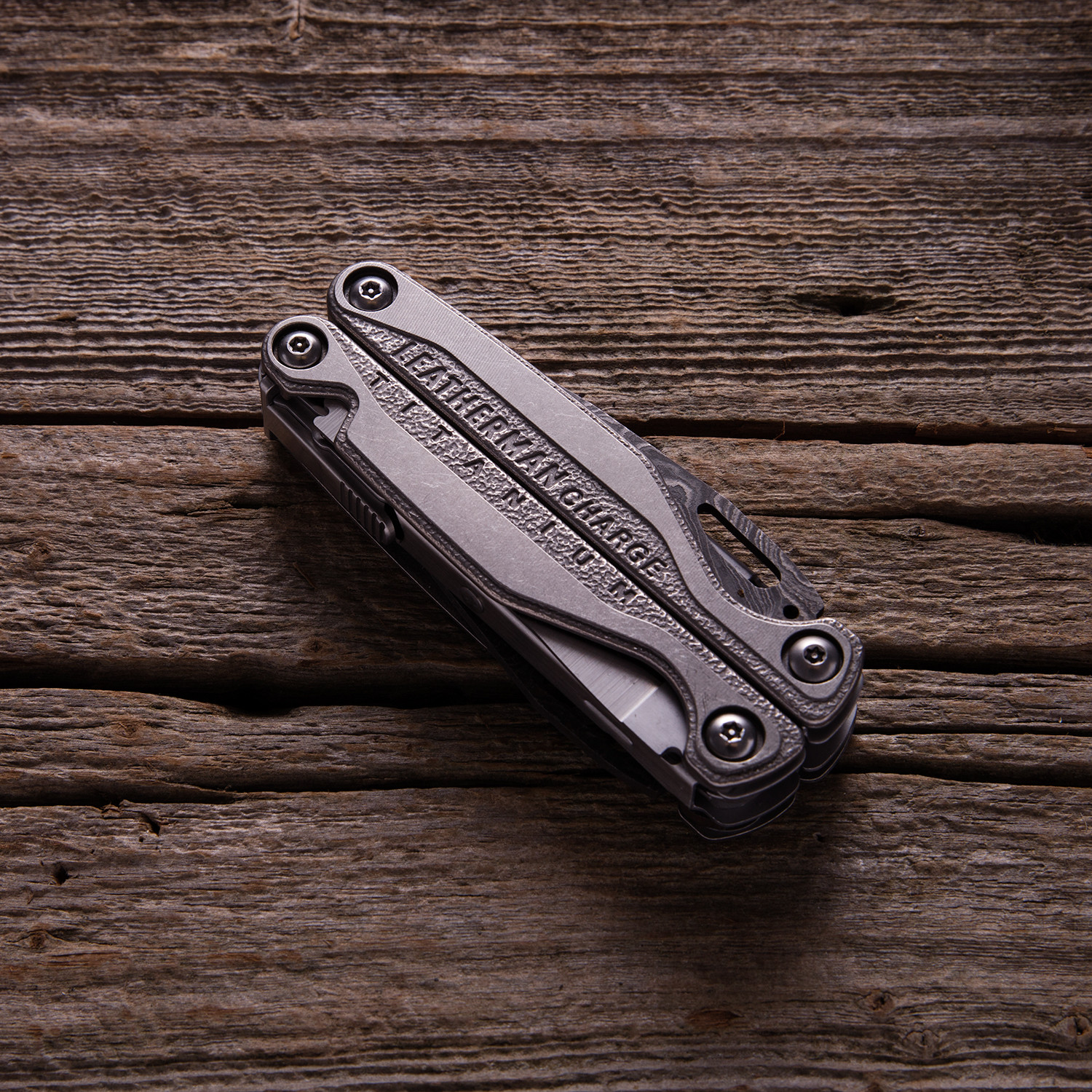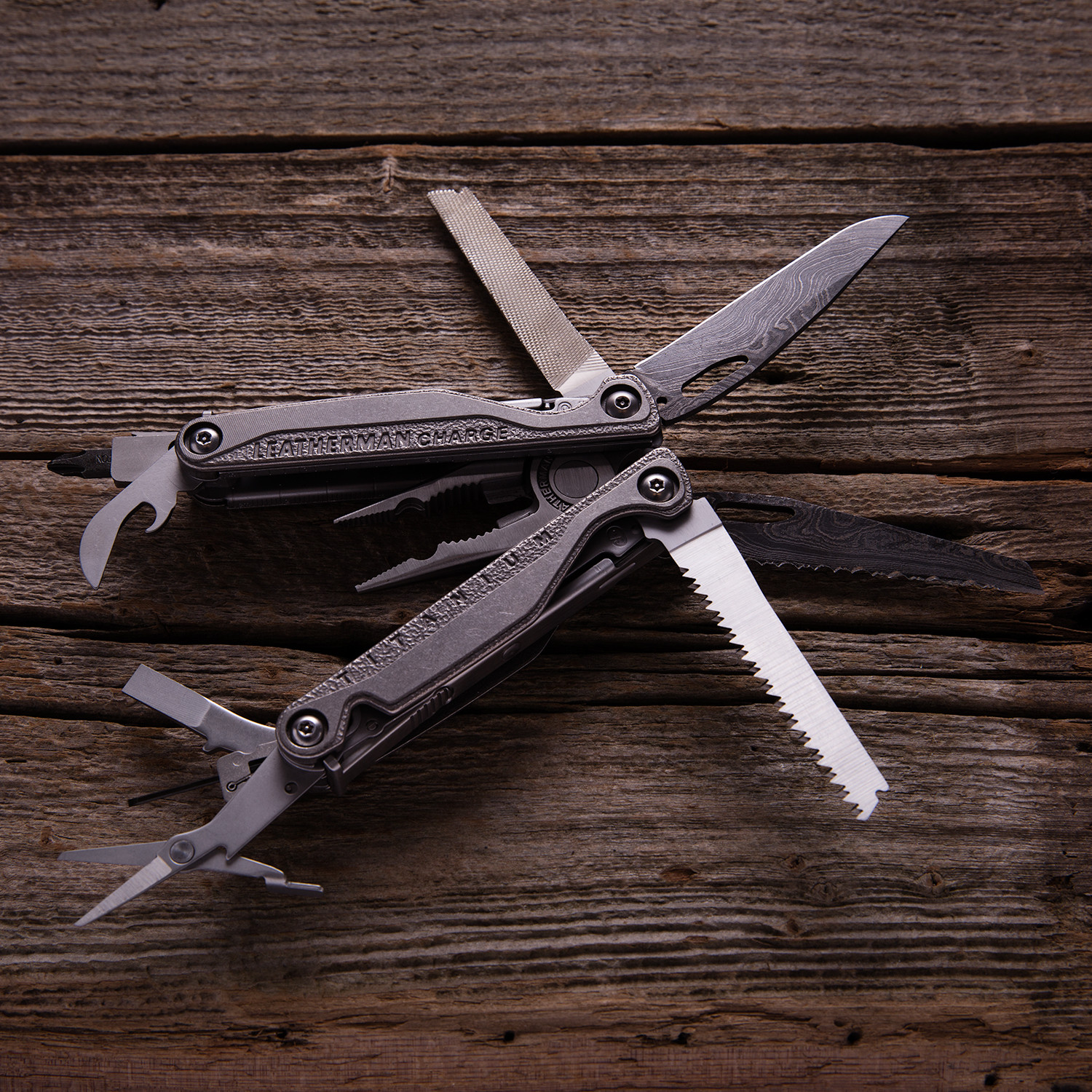 This Charge TTi Multi-Tool contains a full nineteen functions and has received the samurai treatment with two upgraded 416 layer Damascus steel blades. Produced entirely in the USA by Texas Tool Crafters Inc. using only real, hammer-forged and folded steel, the repeated folding and flattening process results in a blade that is strong, and completely unique so that no two blades are exactly the same. It's the epitome of functional, and also great for showing off.