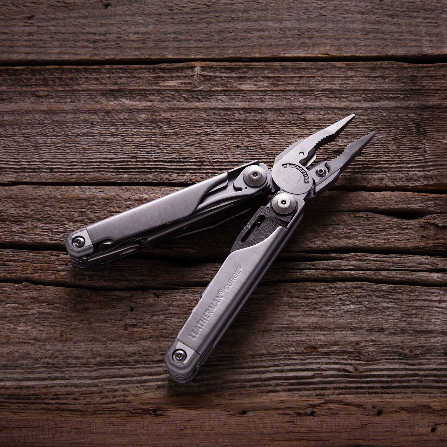 The Leatherman Surge is the tool of choice for heavy duty work environments. The reinforced, full sized design (12.5 oz, 4.5” closed) is the perfect toolbox replacement. Twenty-one functions ensure you’ll always have the right tool available – pliers, removable wire cutters, crimper, stripper, plain edge knife, 420hc serrated knife, saw, scissors, awl, ruler, can opener, bottle opener, file, blade exchanger, large bit driver, large screwdriver, and small screwdriver.