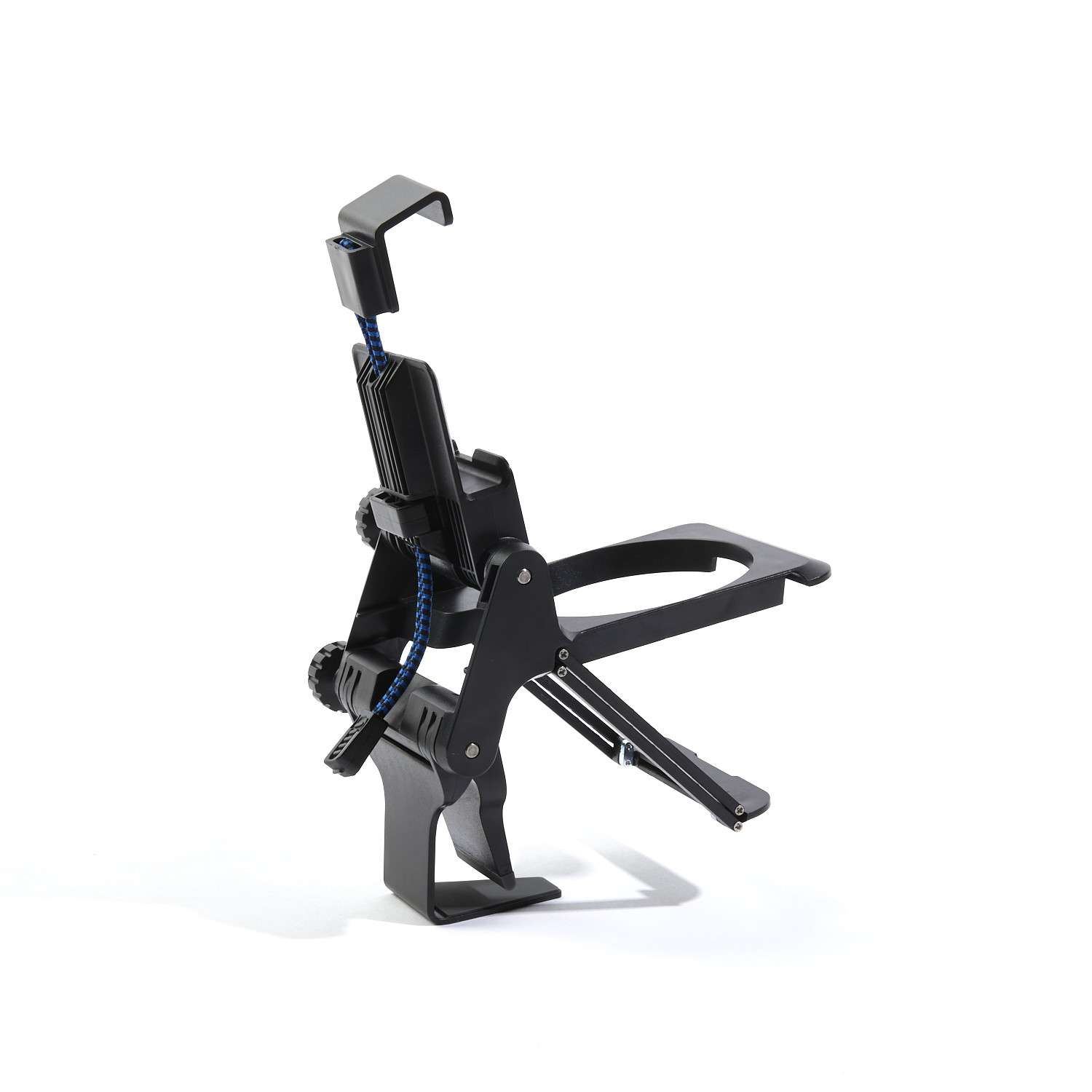 The Airhook is a two-in-one solution for airplane travel comfort: a stable drink holder and a secure mount for an electronic device. Designed to elevate the level of convenience by allowing for maximum legroom, the Airhook uses the tray table in its vertical and locked position as an anchor, rather than horizontally across your lap as a platform.
