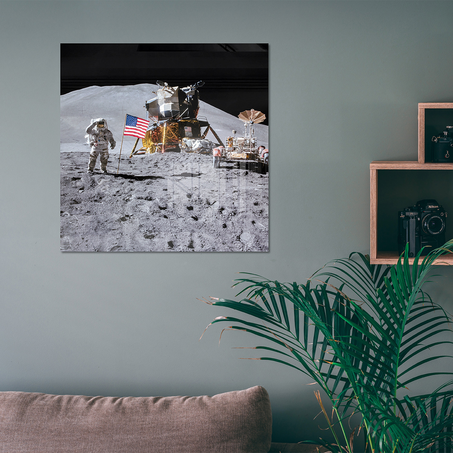 Scott’s photograph Space Salute features Irwin saluting beside the American flag with Lunar Module 'Falcon' in the background.