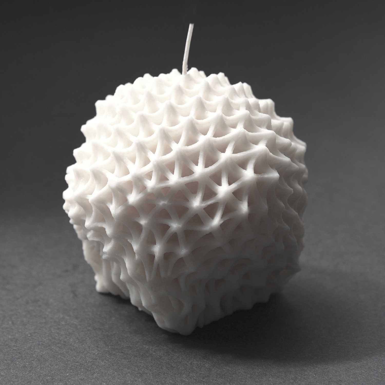 This array of soy wax candles are livable art pieces, molded in structural, architectural silhouettes that are designed to stay beautiful as they melt, and use space, shadow and dimension to make them look as though they are lit from within. The flame burns a cylinder inside the core, to leave the sides of the candle intact, transparent, and illuminated.