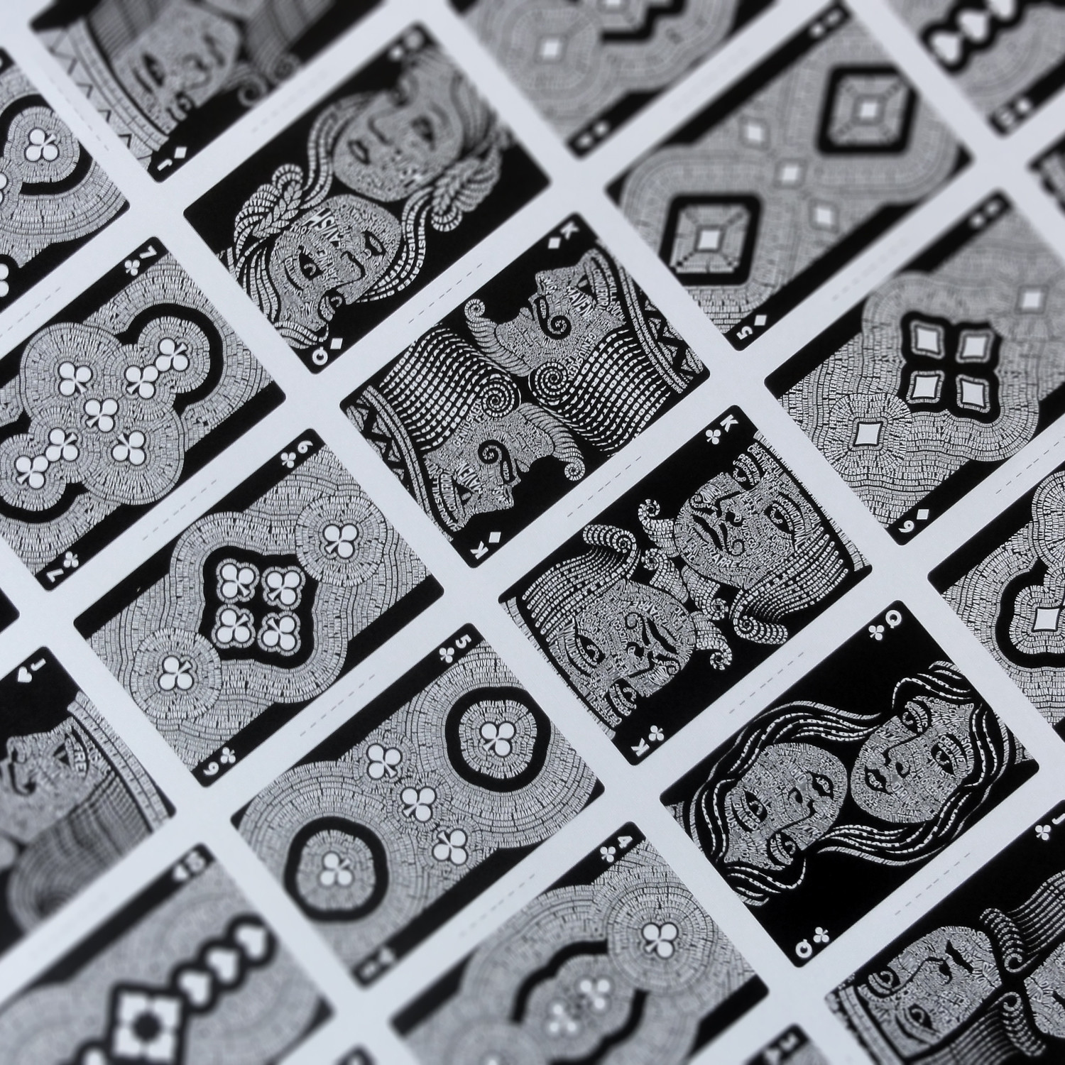 This authentic and rare Limited Edition Uncut press sheet of the entire 56 card Black Book Manifesto deck was designed by UnCommon Beat, and pulled directly from the printing press at the United States Playing Card Company, before getting cut into the individual playing cards. Each is printed on Premium Casino quality Bee stock sheet embossed with Air Cushion Magic Finish, including all 56 unique card fronts on one side and the back design on the other.