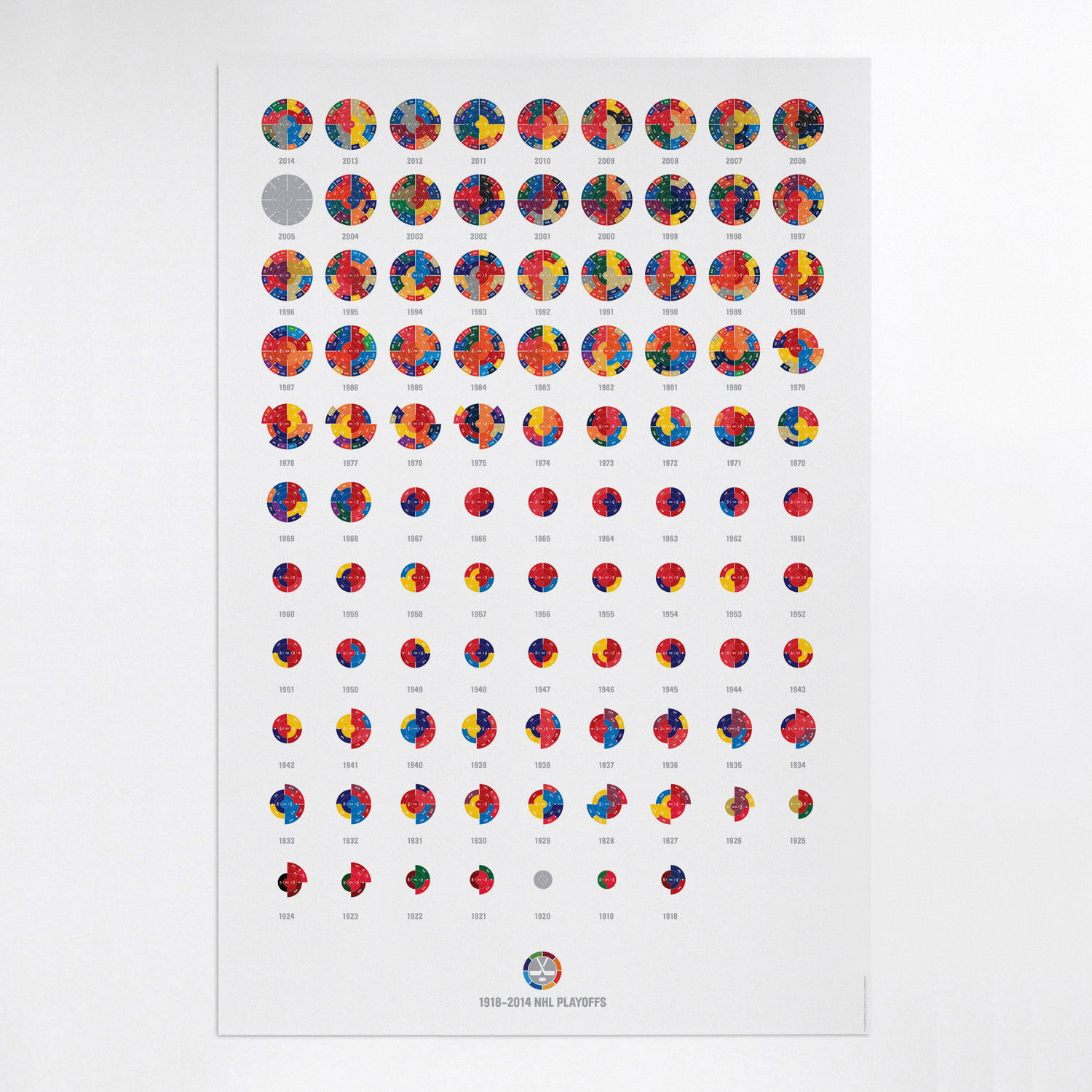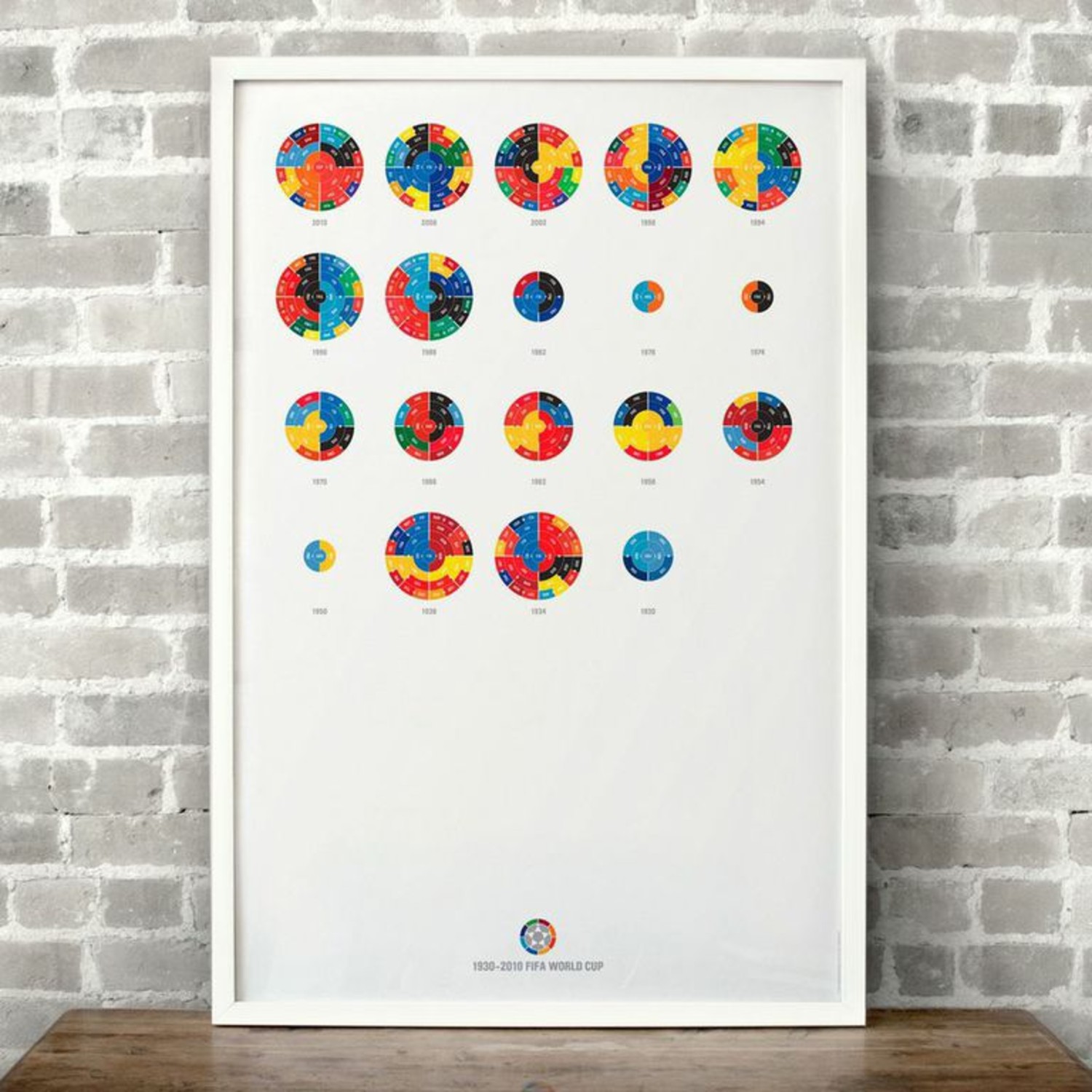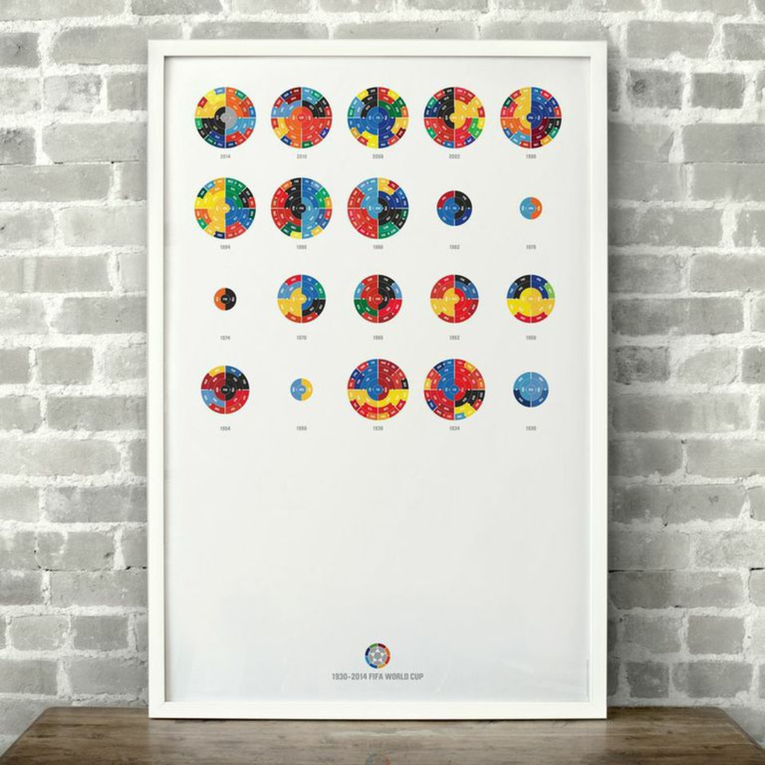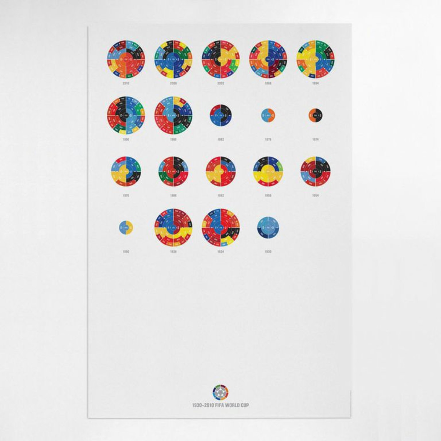 The Full League History radial bracket fine art prints give you a birds eye view of sports history, allowing you to detect team performance patterns over time with the use of color in your choice of sport. Each radial bracket is hand-crafted with love in Brooklyn by Hyperakt and beautifully printed on archival 100% cotton rag fine art paper. Some of these special designs are so timely that the design will not be completed until the finale of the World Cup. The pictures shown will have a blank inner circle until matches are complete. Results will be updated as the tournament advances. The bracket will be completely filled out before it ships.