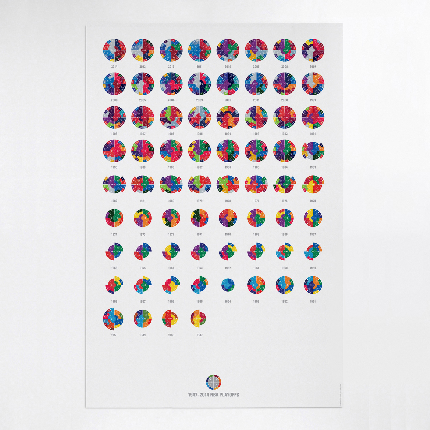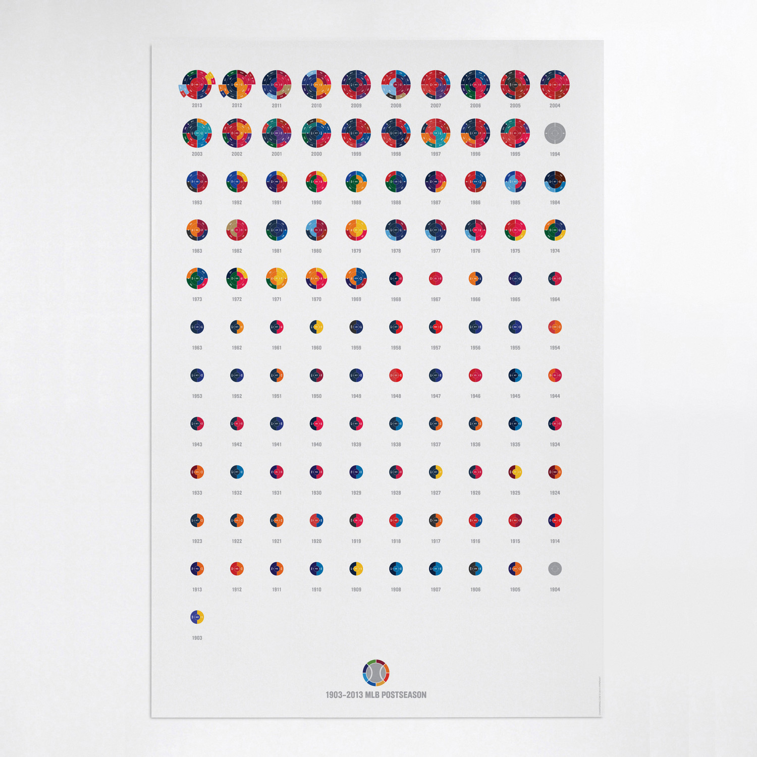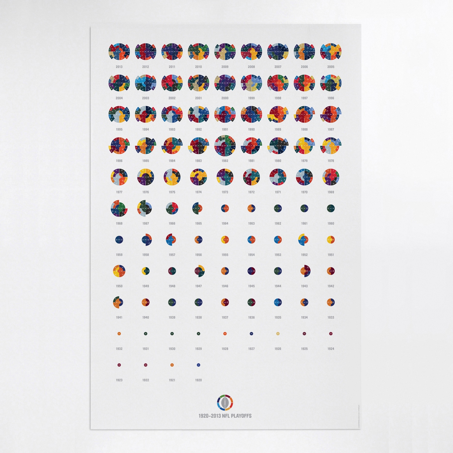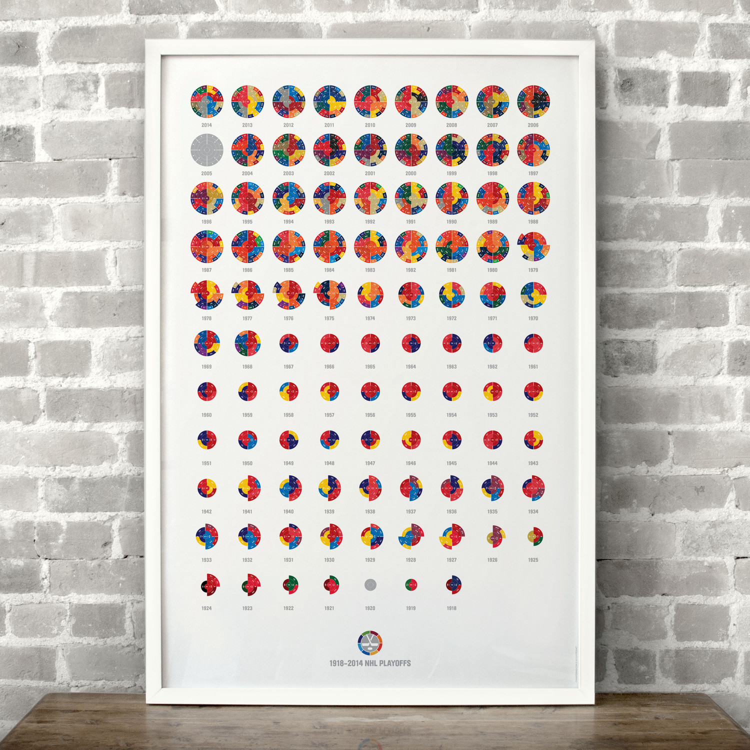The Full League History radial bracket fine art prints give you a birds eye view of sports history, allowing you to detect team performance patterns over time with the use of color in your choice of sport. Each radial bracket is hand-crafted with love in Brooklyn by Hyperakt and beautifully printed on archival 100% cotton rag fine art paper. Some of these special designs are so timely that the design will not be completed until the finale of the World Cup. The pictures shown will have a blank inner circle until matches are complete. Results will be updated as the tournament advances. The bracket will be completely filled out before it ships.