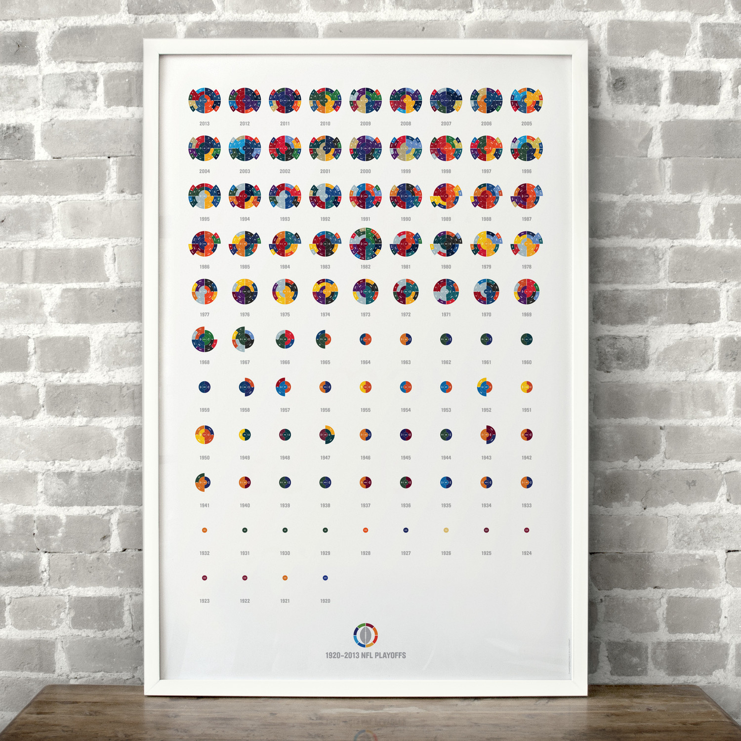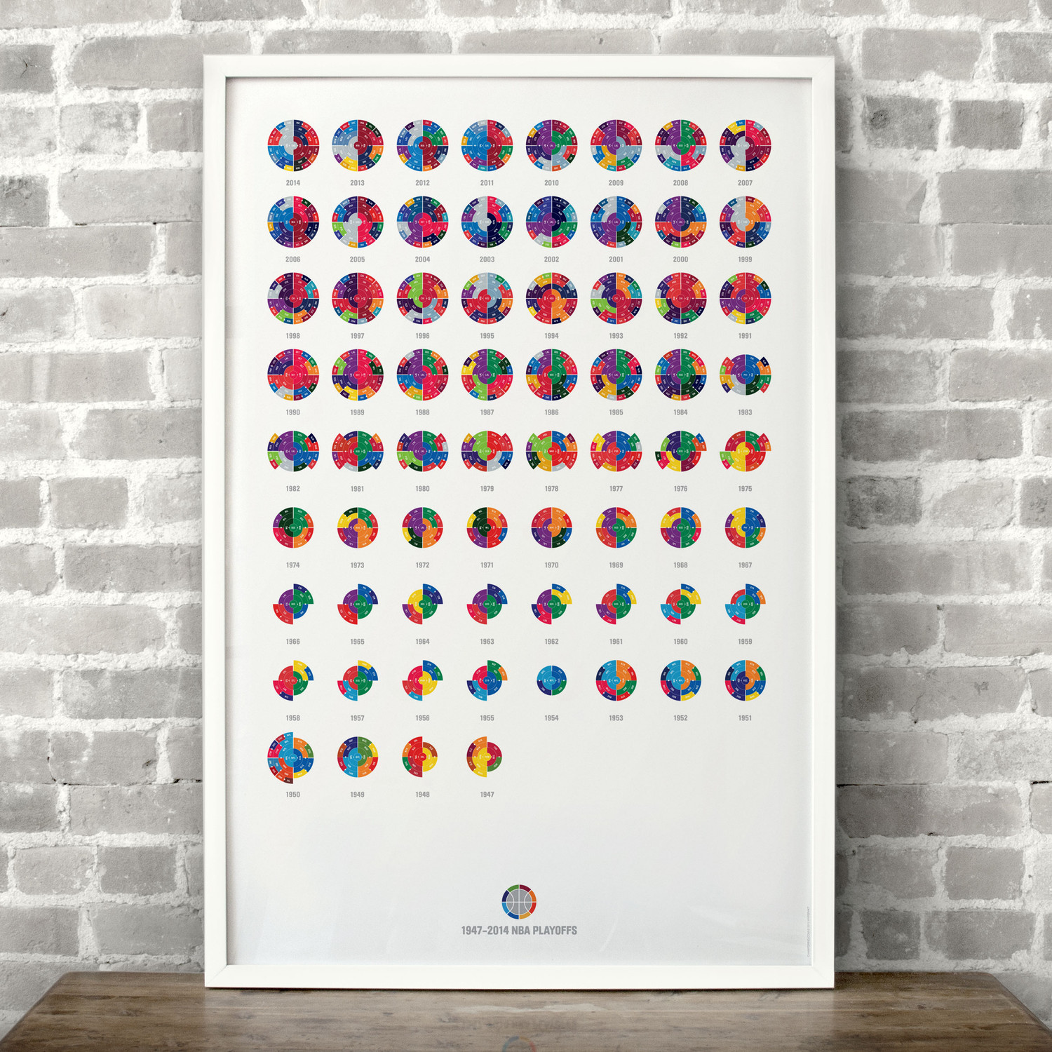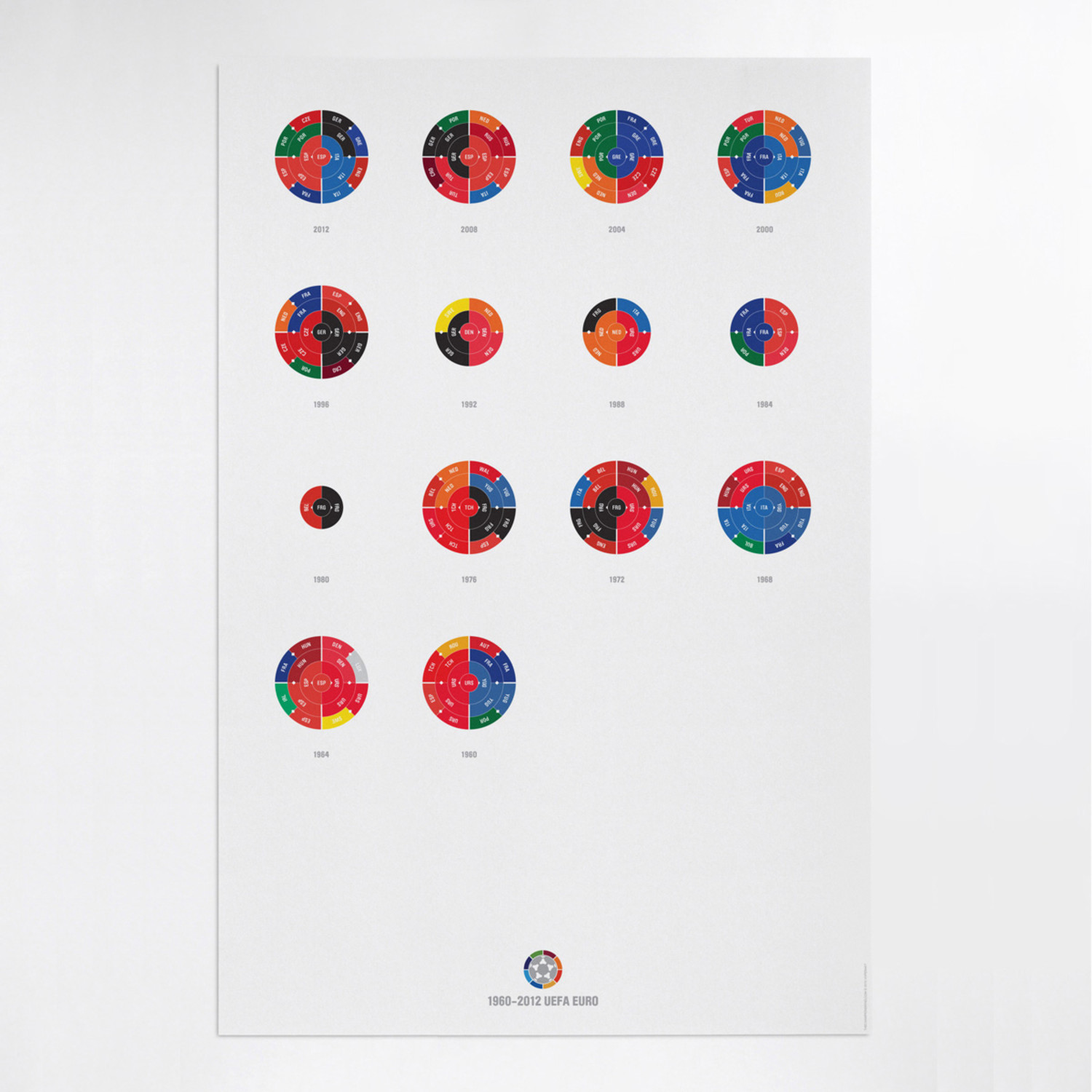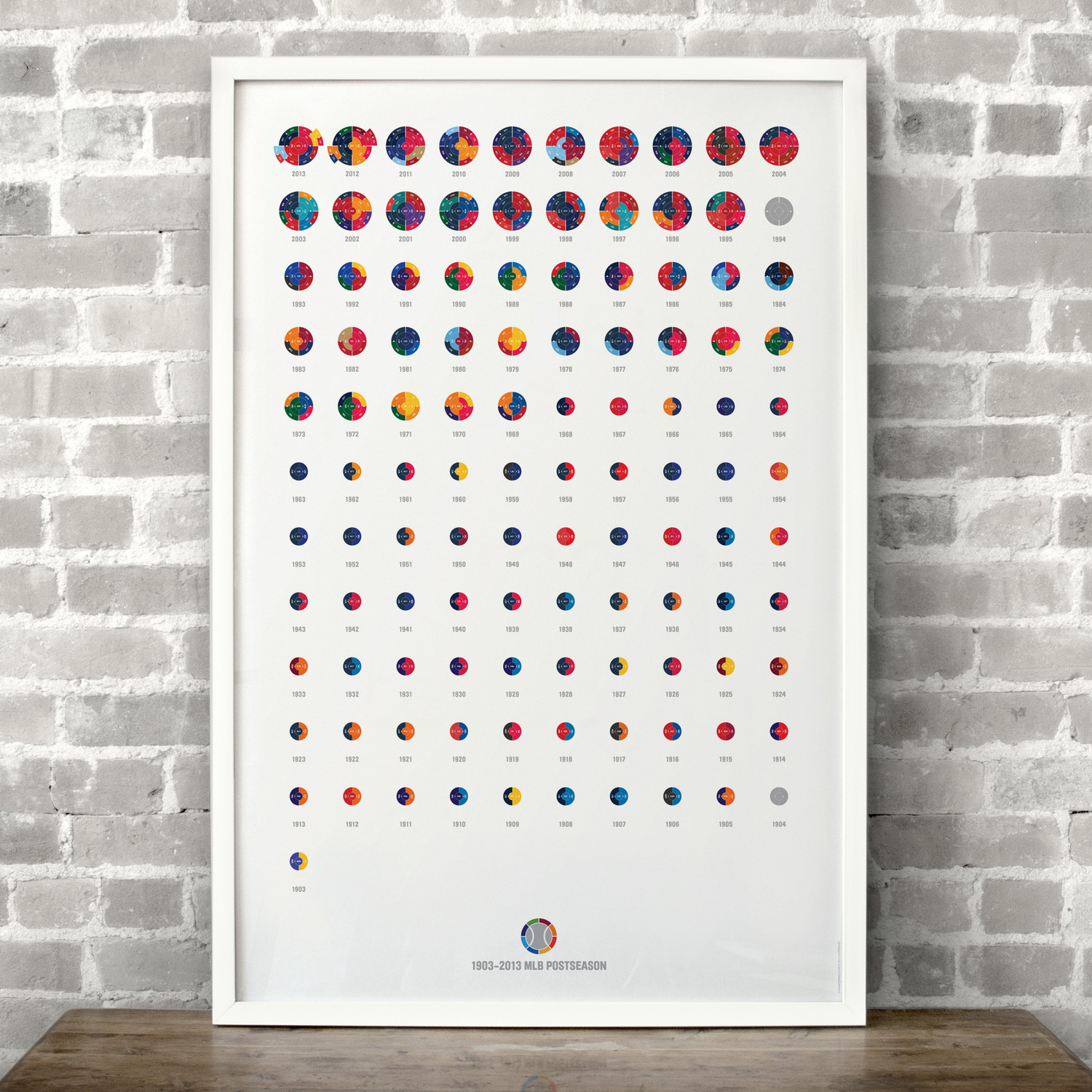 The Full League History radial bracket fine art prints give you a birds eye view of sports history, allowing you to detect team performance patterns over time with the use of color in your choice of sport. Each radial bracket is hand-crafted with love in Brooklyn by Hyperakt and beautifully printed on archival 100% cotton rag fine art paper. Some of these special designs are so timely that the design will not be completed until the finale of the World Cup. The pictures shown will have a blank inner circle until matches are complete. Results will be updated as the tournament advances. The bracket will be completely filled out before it ships.