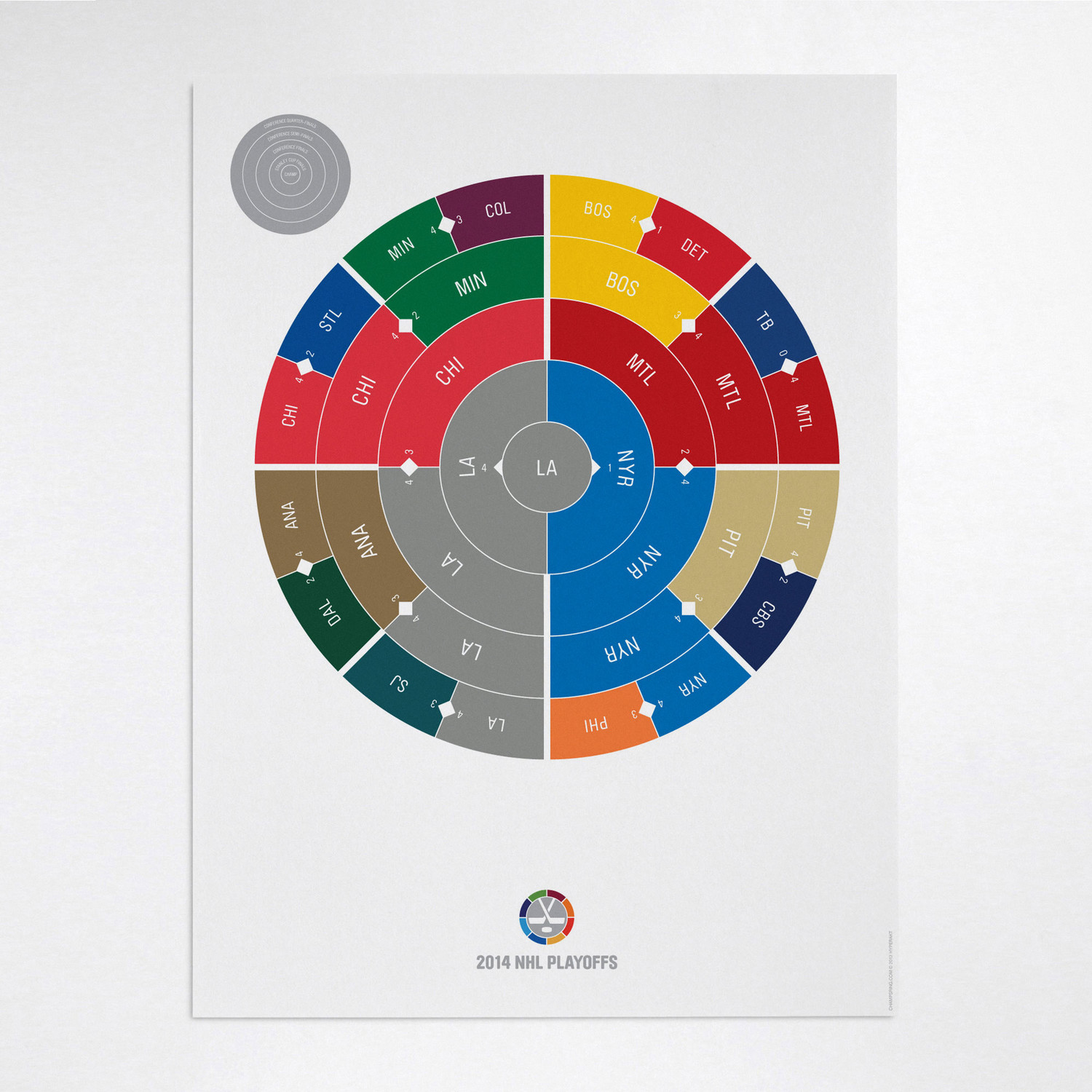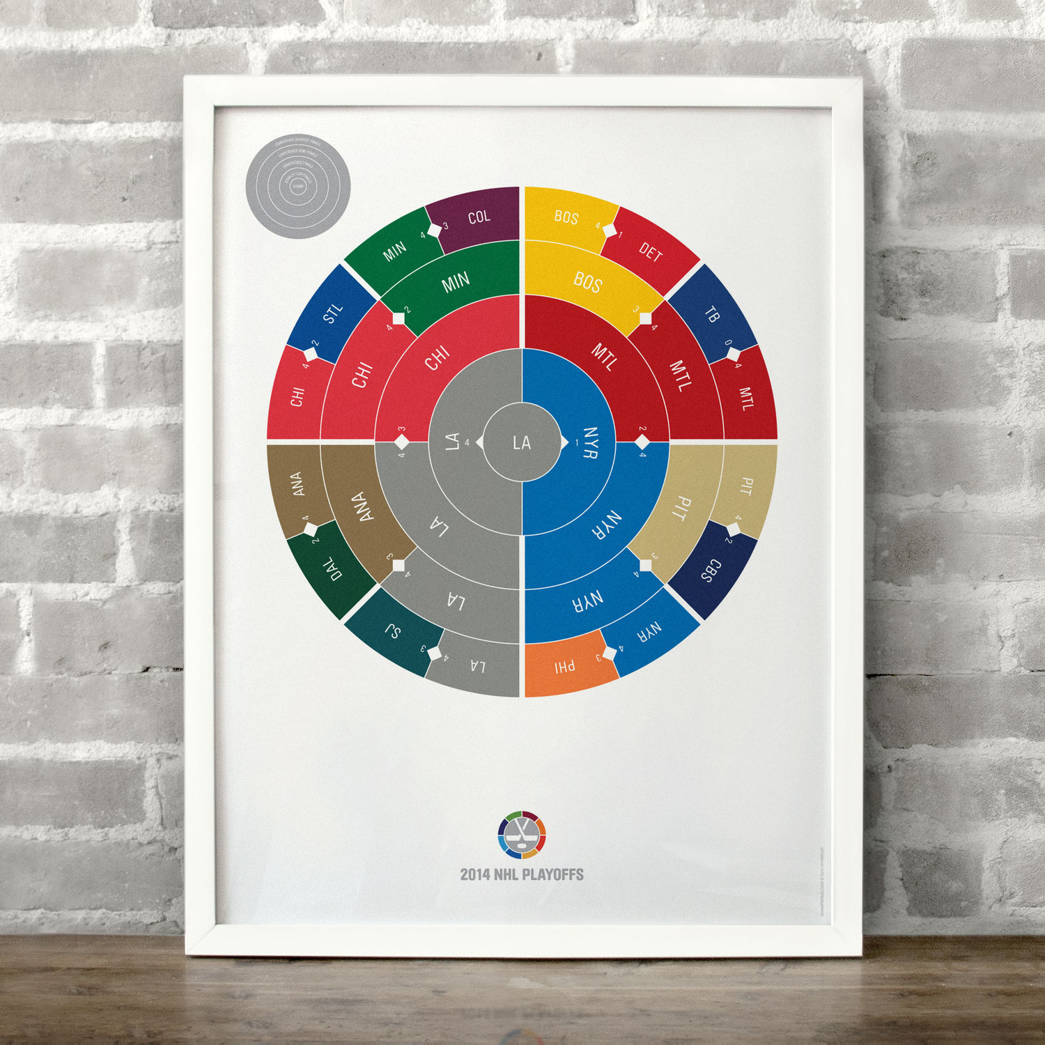This print captures each entire NHL playoffs on a beautiful art print. It's the perfect gift for super fans who have a favorite year. Each radial bracket is hand-crafted with love in Brooklyn by Hyperakt and beautifully printed on 100% cotton rag 200gsm fine art paper. They look super smart on any sports fan's wall. Collect each one and celebrate your love of the NHL in a design-forward fashion.