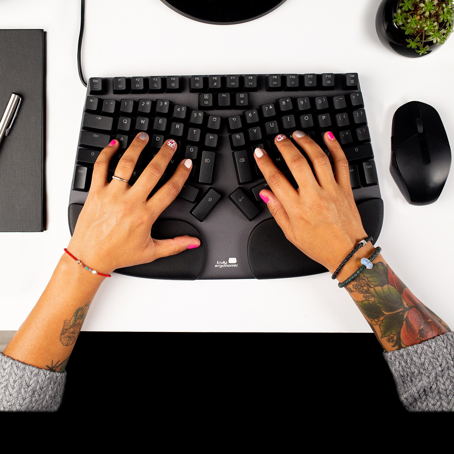 Experience the power of the separated fixed-splay key layout, which guides your wrists into a neutral alignment by orienting keys closer to your forearms and hands' natural inward angle.