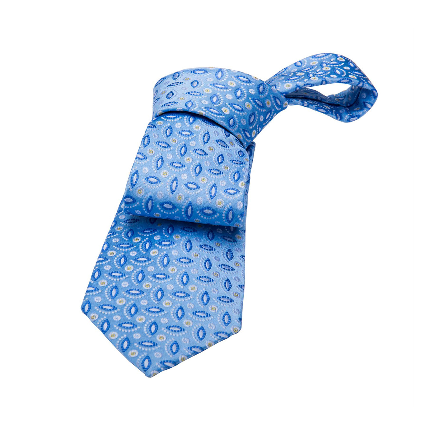 The Becket Paisley is part of The Dark Knot's premium line of ultra high yarn count luxury silk ties. It features gray ovals outlined by a deep blue hue and Gray dots, set against a baby blue background. Pair this stunning silk tie with a solid, striped, or micro checkered light pink or white shirt and a solid, striped, or plaid charcoal gray, navy or brown suit. Alternatively, this can be worn with a blue or brown blazer on a fun night out.