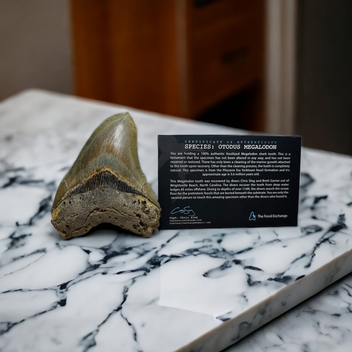Dominating the Prehistoric Oceans for 13 Million years, Megalodon is the largest shark on record, reaching incredible lengths of up to 60 ft. This massive Megalodon Shark Tooth is a 100% real, unaltered fossil recovered by scuba divers in over 110 ft of water, 45 miles off the coast of North Carolina. The divers search the ocean floor for these fossils that are buried in the substrate. This incredible specimen includes a certificate of authenticity, along with a display stand so you can show off the impressive size of this gargantuan apex predator.