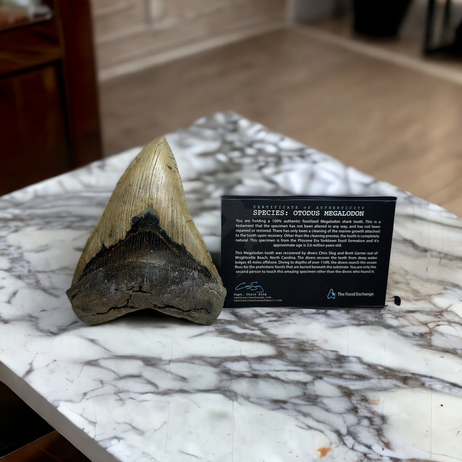 Dominating the Prehistoric Oceans for 13 Million years, Megalodon is the largest shark on record, reaching incredible lengths of up to 60 ft. This massive Megalodon Shark Tooth is a 100% real, unaltered fossil recovered by scuba divers in over 110 ft of water, 45 miles off the coast of North Carolina. The divers search the ocean floor for these fossils that are buried in the substrate. This incredible specimen includes a certificate of authenticity, along with a display stand so you can show off the impressive size of this gargantuan apex predator.