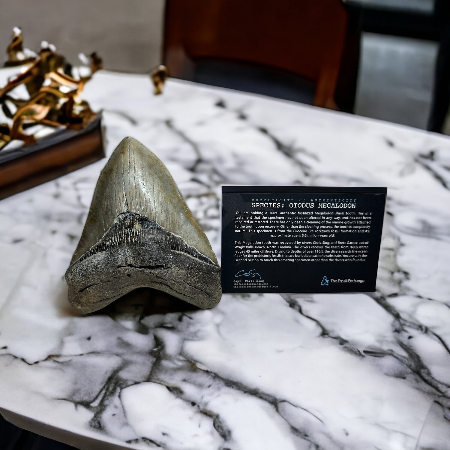 Dominating the Prehistoric Oceans for 13 Million years, Megalodon is the largest shark on record, reaching incredible lengths of up to 60 ft. This massive Megalodon Shark Tooth is a 100% real, unaltered fossil recovered by scuba divers in over 110 ft of water, 45 miles off the coast of North Carolina. The divers search the ocean floor for these fossils that are buried in the substrate. This incredible specimen includes a certificate of authenticity, along with a display stand so you can show off the impressive size of this gargantuan apex predator.